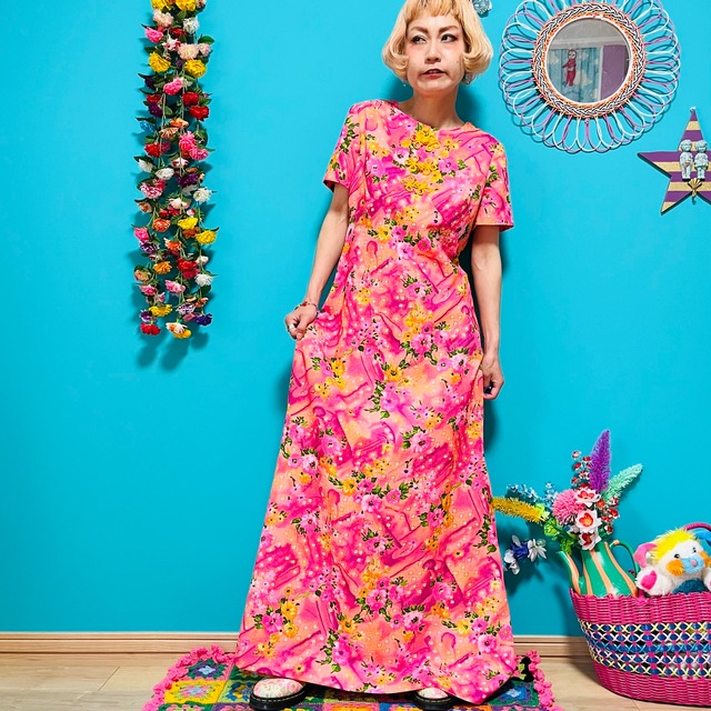 お花柄と幾何学模様が合わさったような、なんとも言えない雰囲気がたまらない鮮やかピンクのロングドレスです。 胸のチャイナボタンは飾りです。 実寸(平置きで計測) 肩幅:38cm バスト:43cm ウエスト:41cm 袖丈:20cm 着丈:140cm *多少の誤差はご了承くださいませ。 着用モデルの身長は160cmです。 状態:全体的に使用感はありますが、特に目立つダメージや汚れはありません。 素材:表記はありませんが、少しハリのある化学繊維です。 *古着特有の使用感や、小さなほつれや薄いしみがある場合が御座います。古着ということを理解頂いた上で購入をお願い致します。 *返品・交換は基本的に受け付けていません。