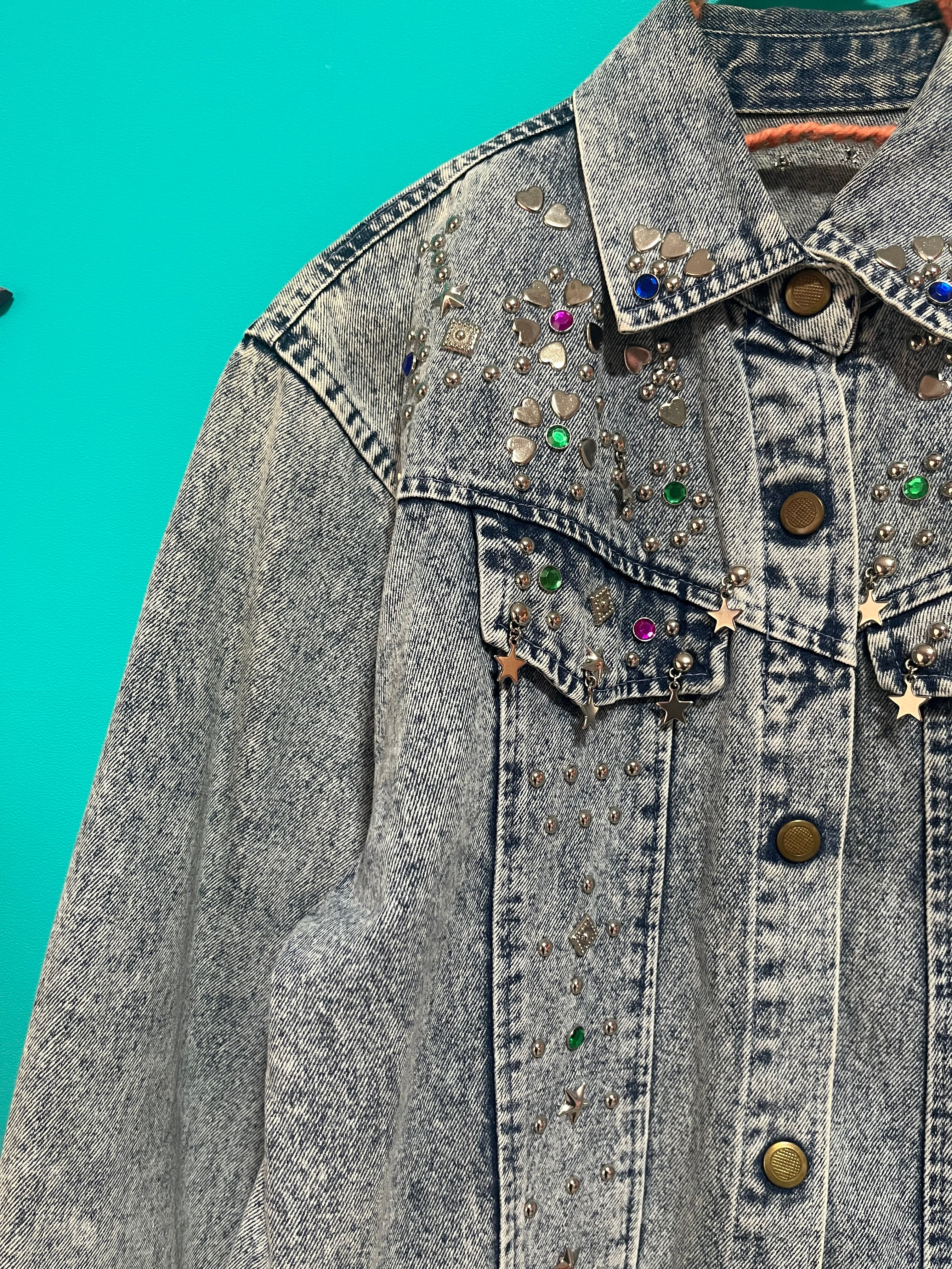キラキラストーンが散りばめられたケミカルデニムジャケットです。