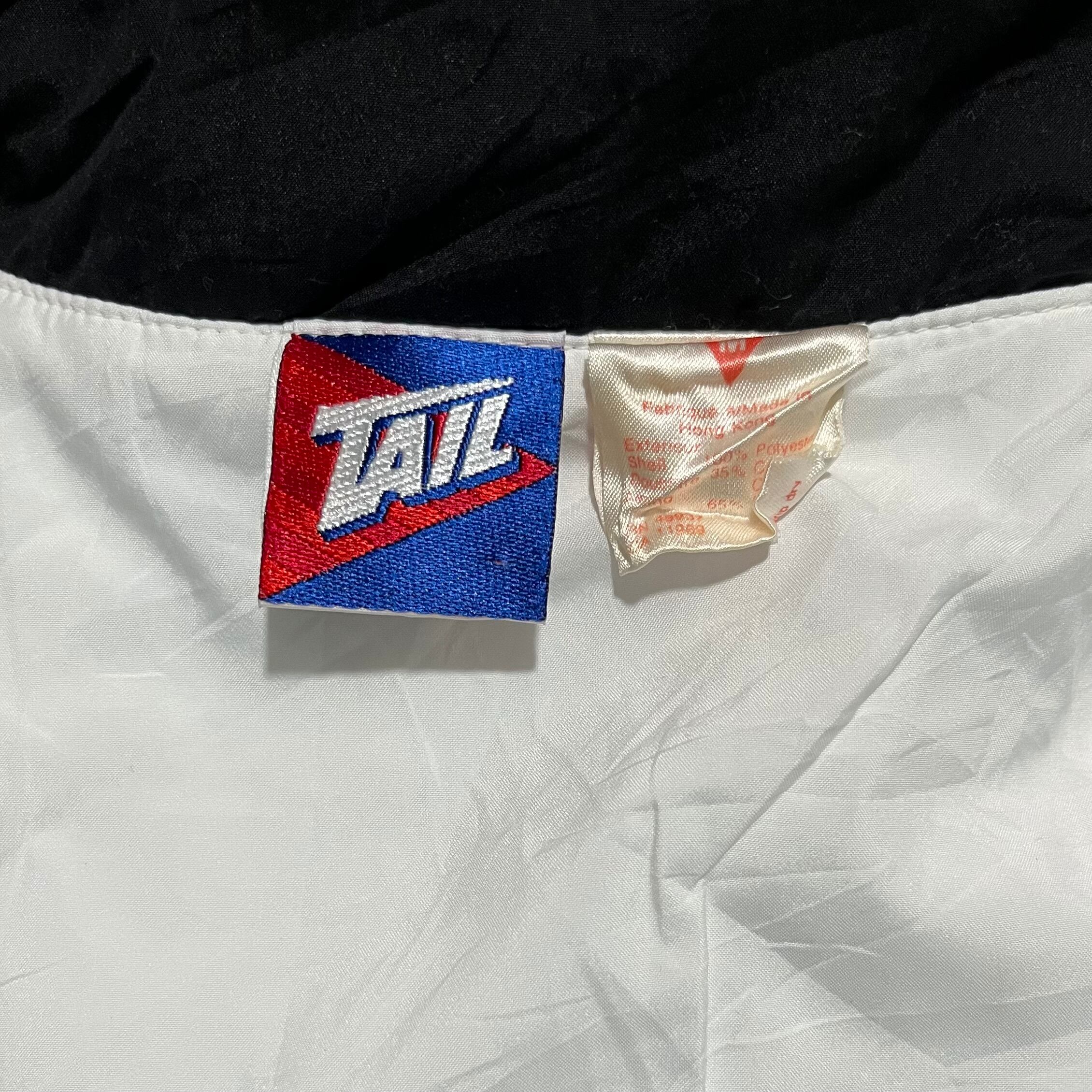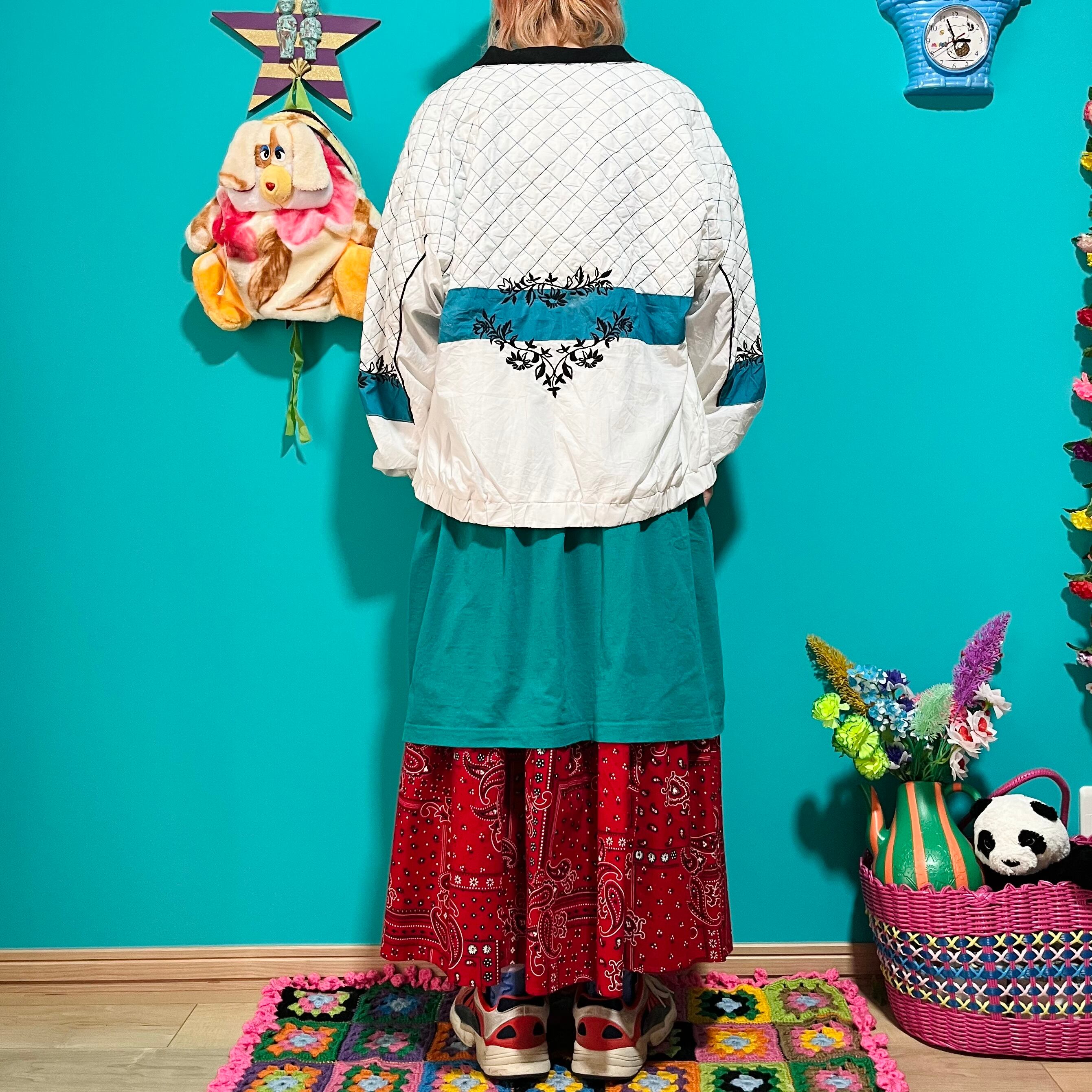 白いボディにターコイズグリーンと黒のラインがポイントのナイロンジャケットです。