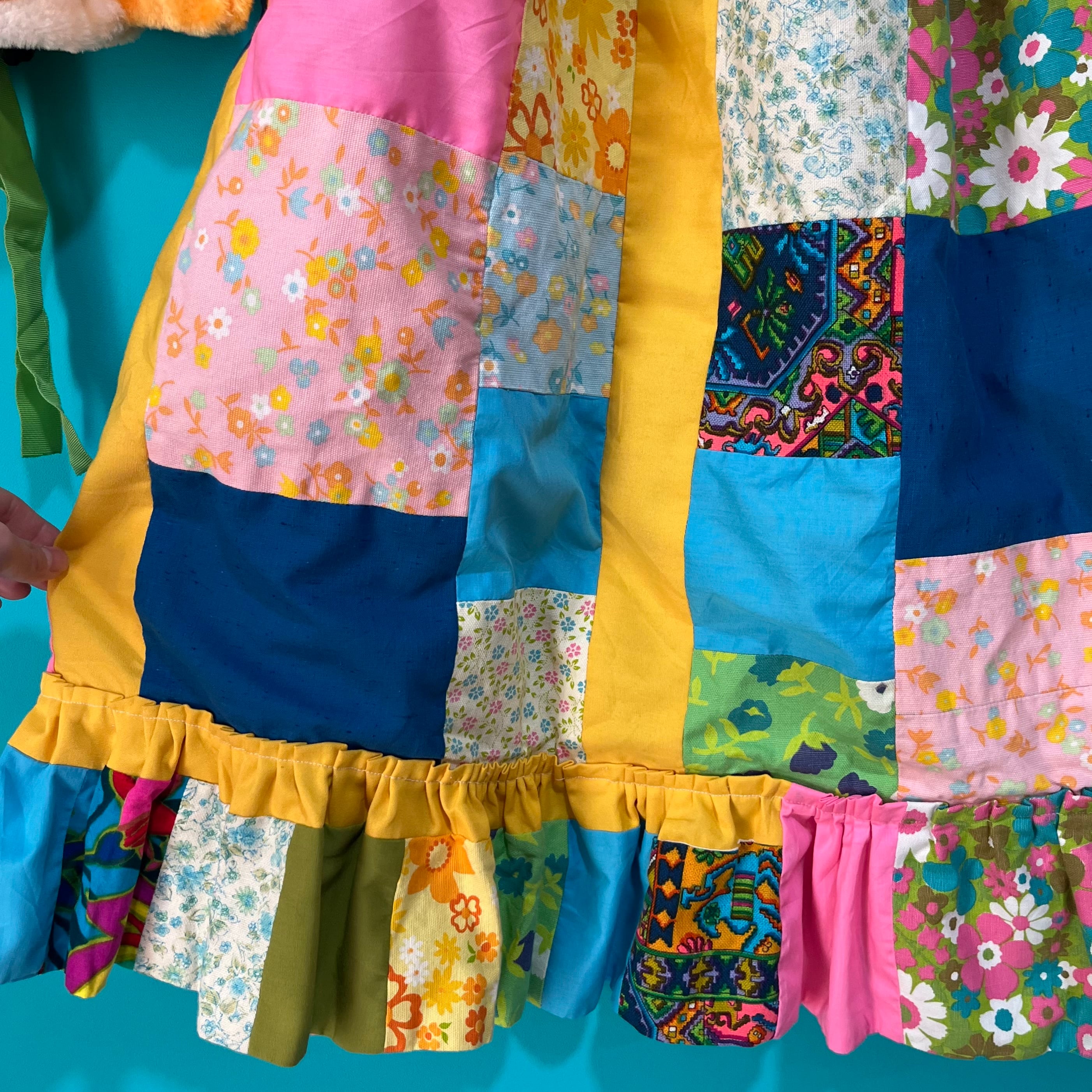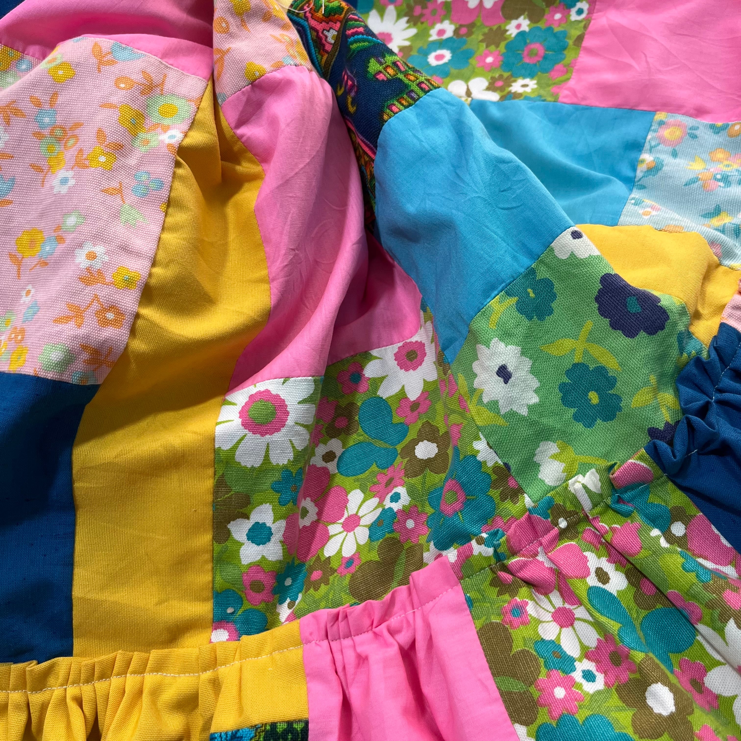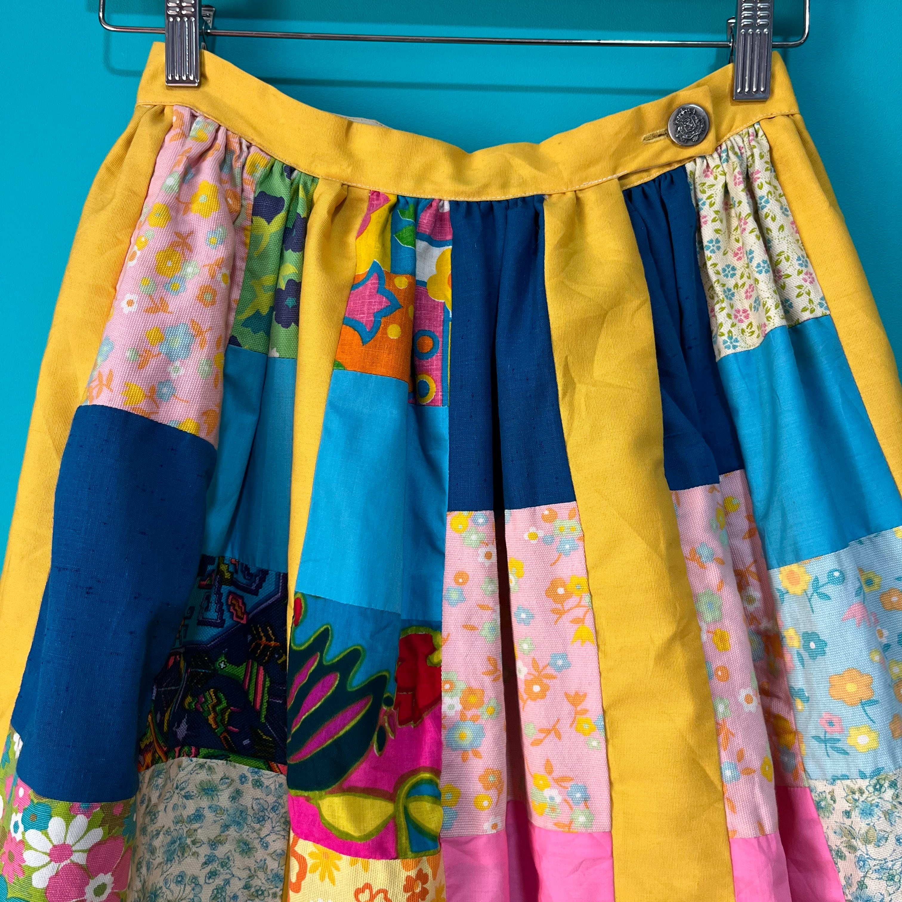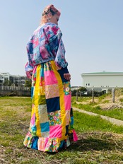 イエローを中心に明るいお花柄が並ぶパッチワークのロングスカートです。