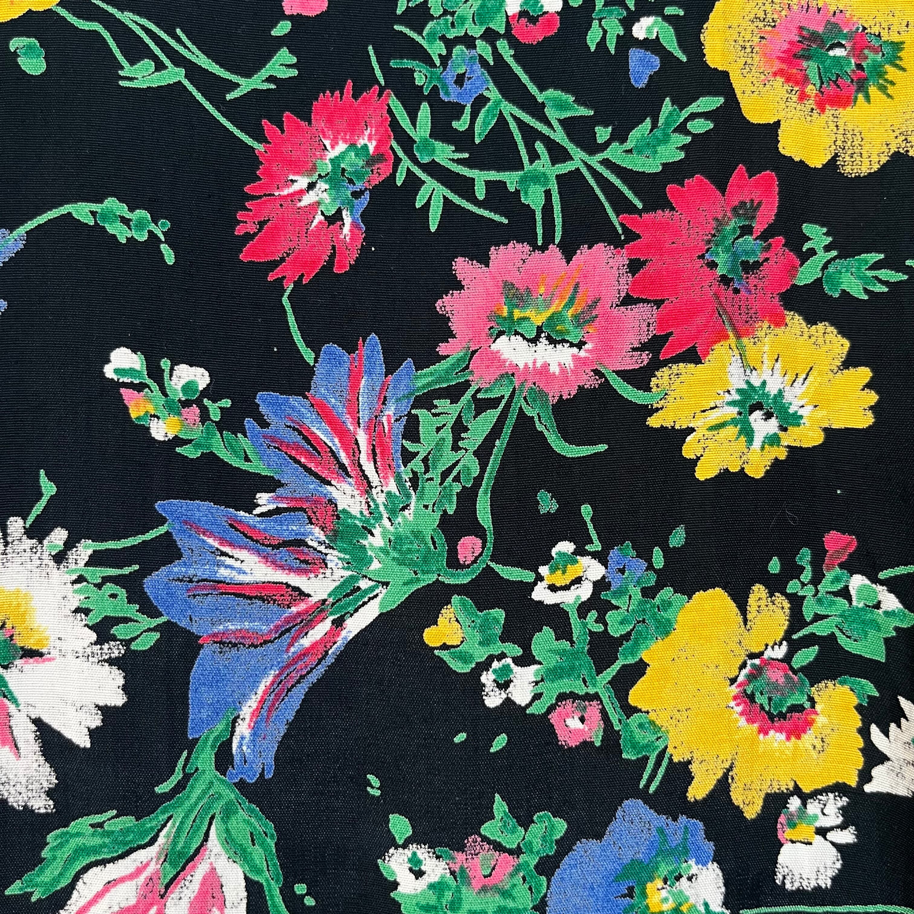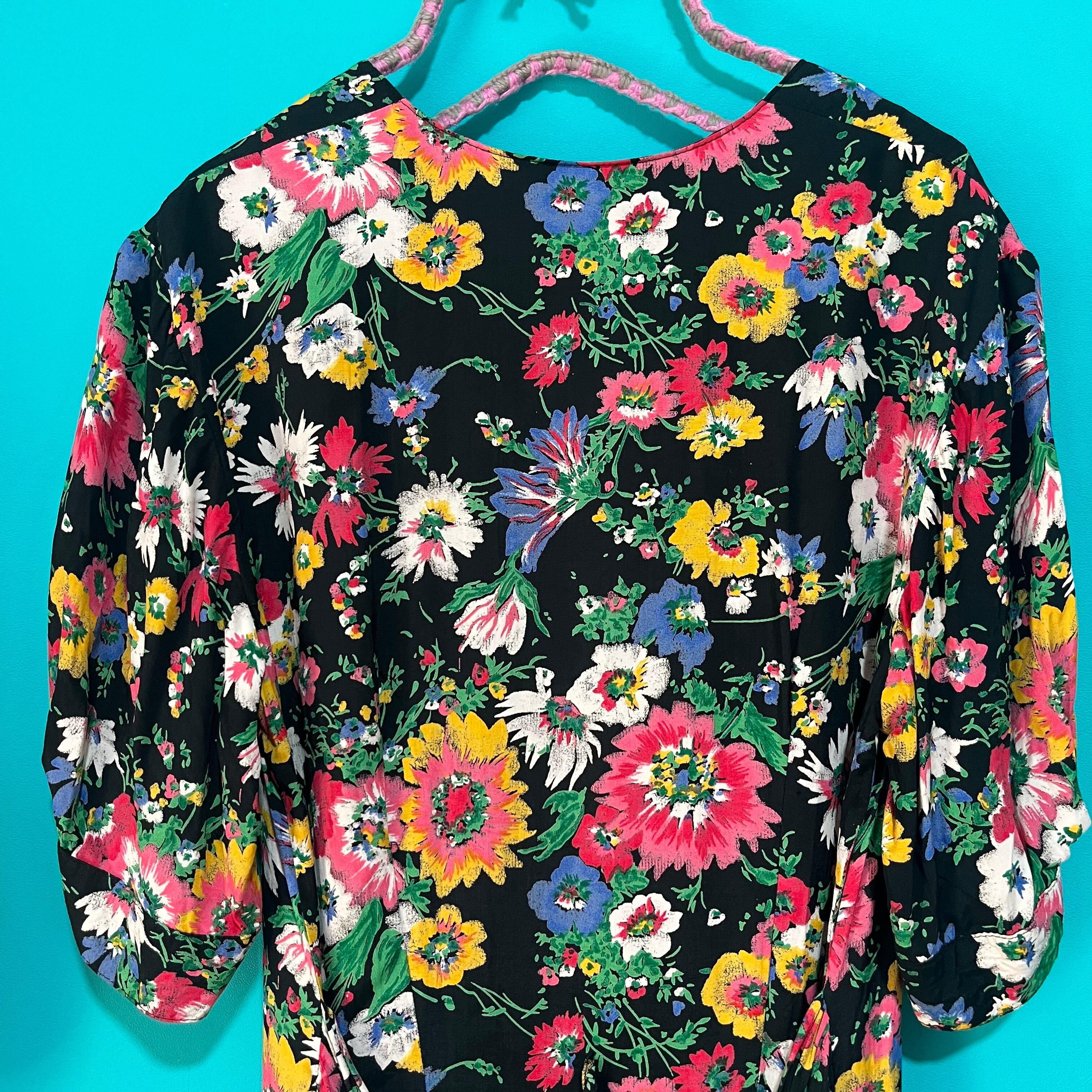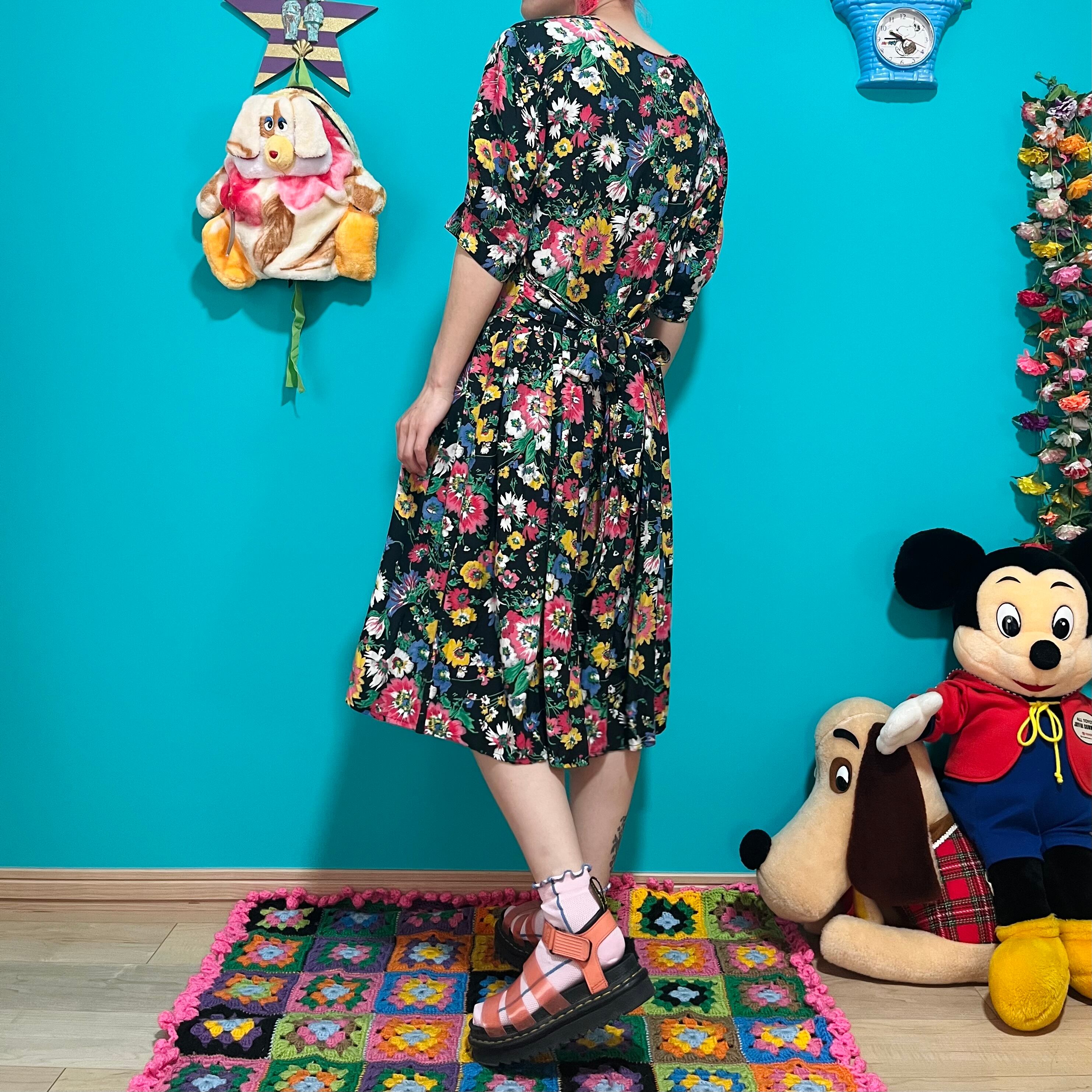 黒ベースに絵の具で描いたような鮮やかなお花が咲いたワンピースです。