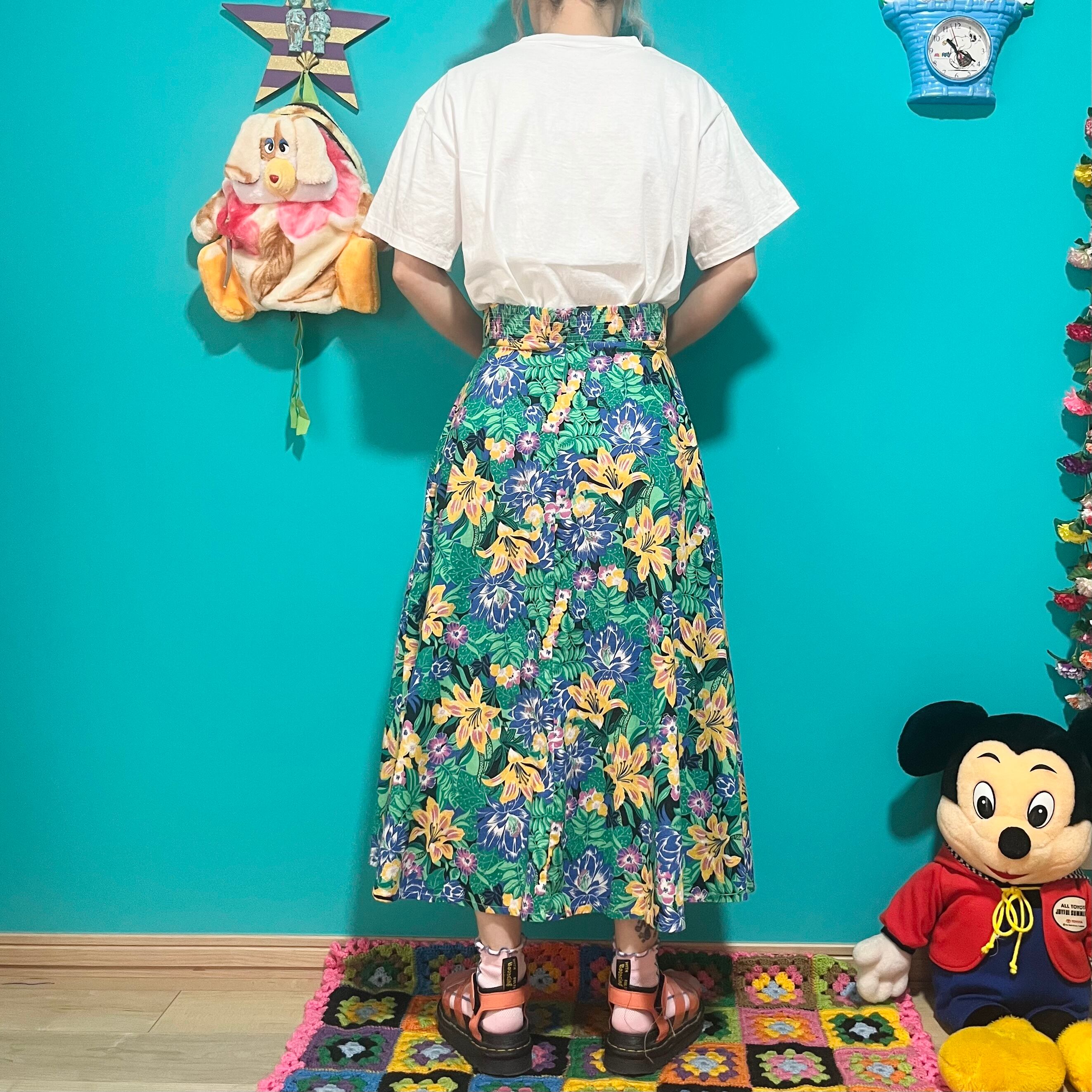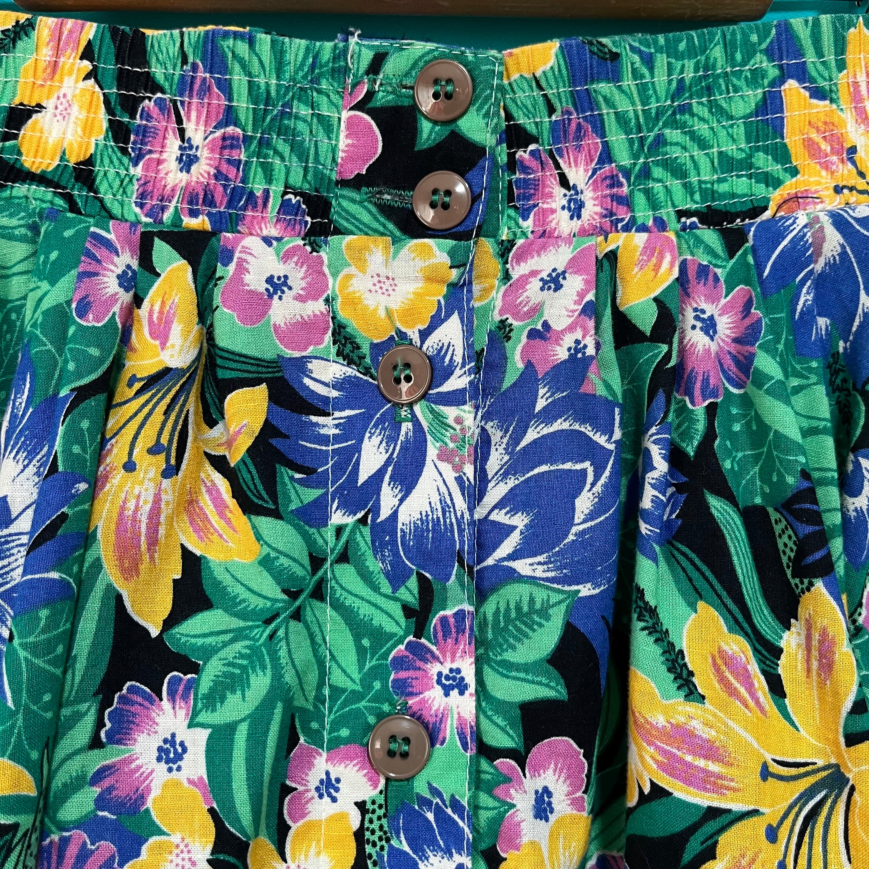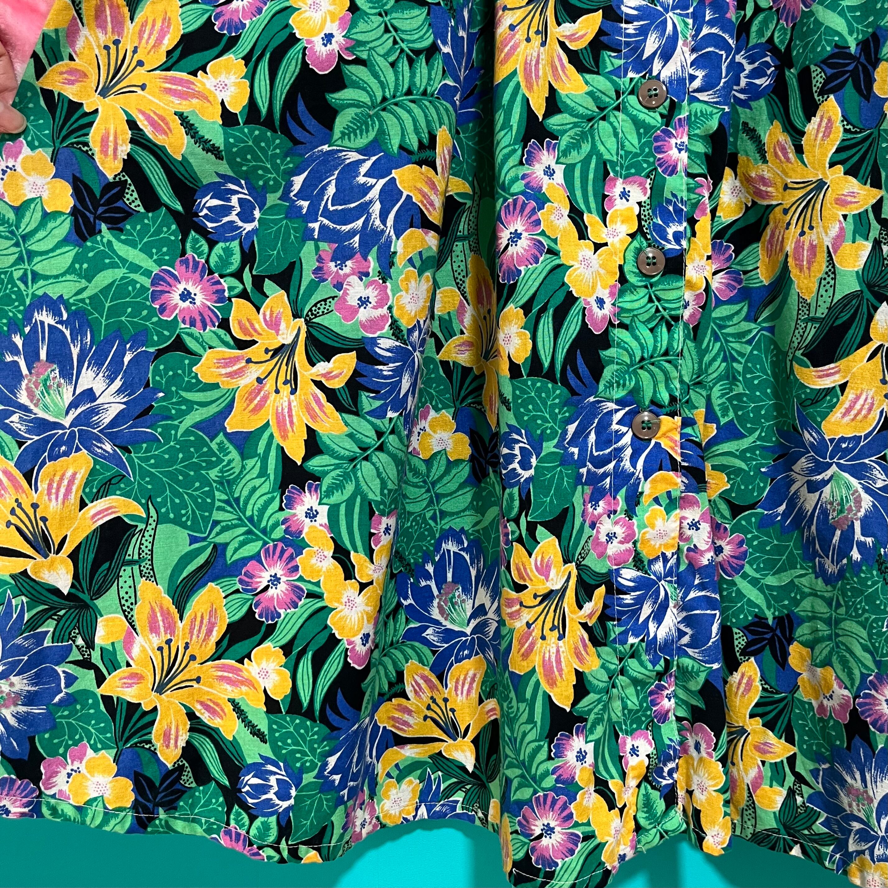 黒地に鮮やかなグリーンの葉っぱとイエローとブルーのお花柄咲き乱れる