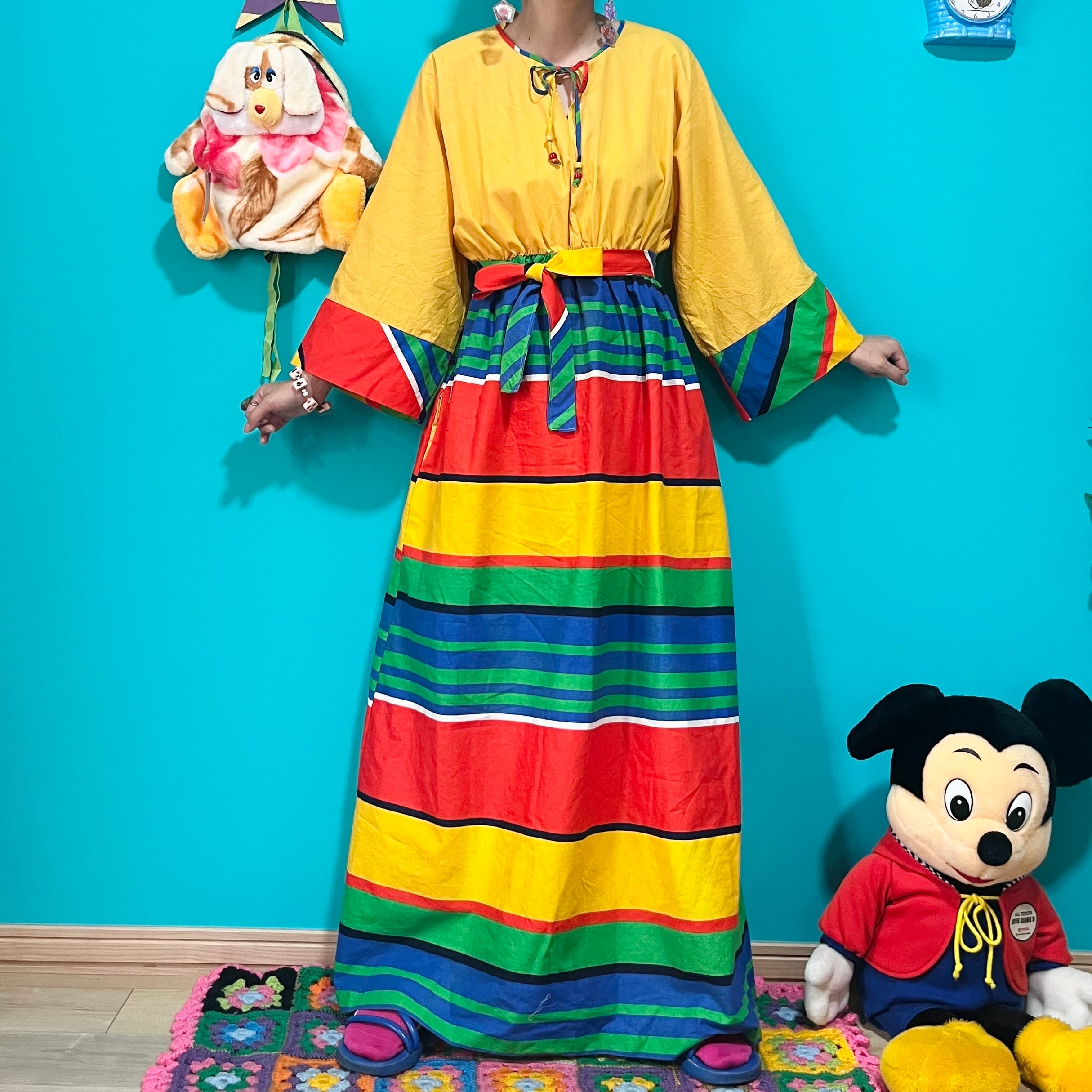 カラフルなボーダーが印象的な70年代ワンピースドレスです。