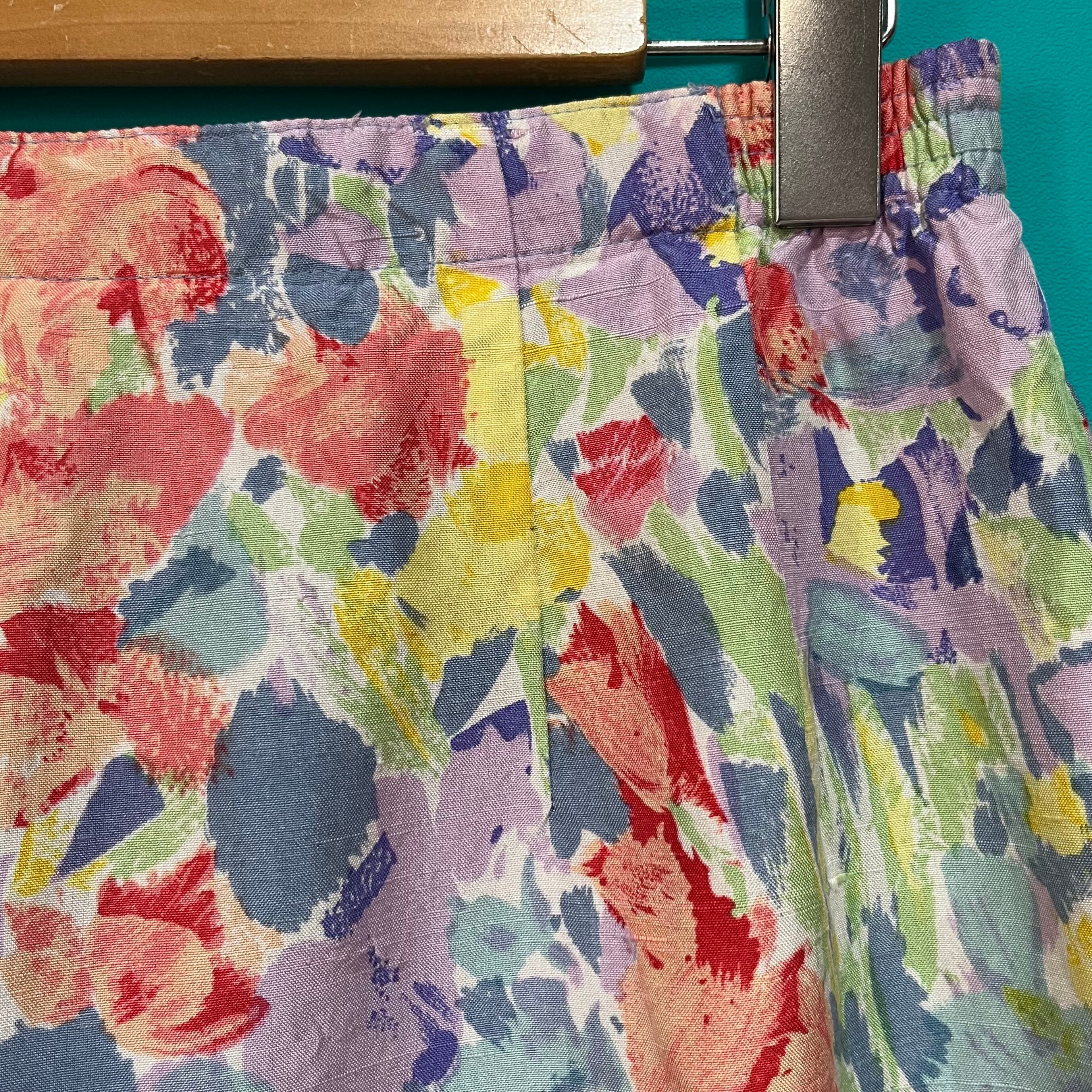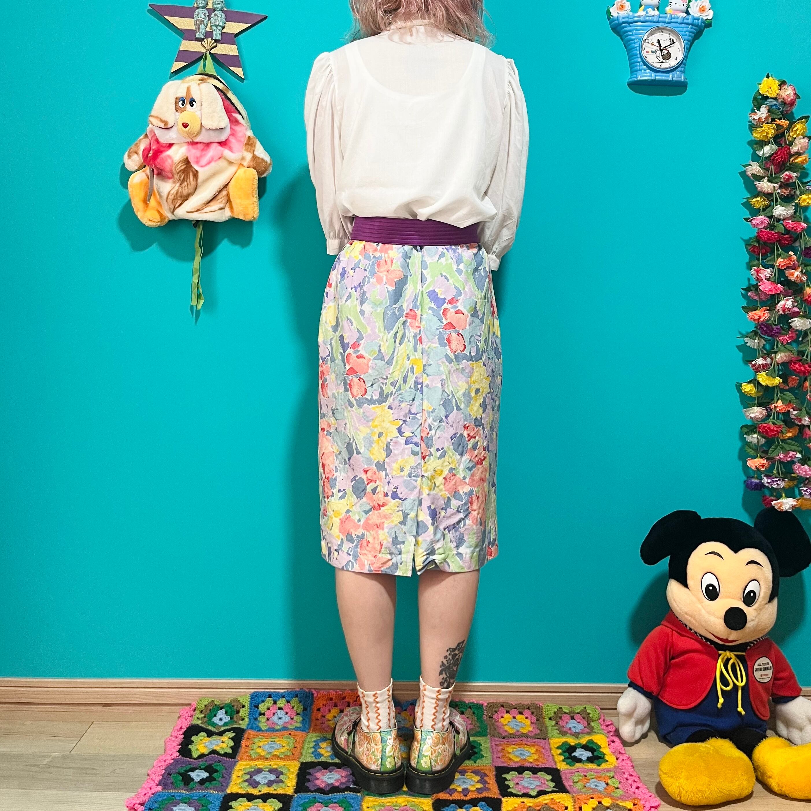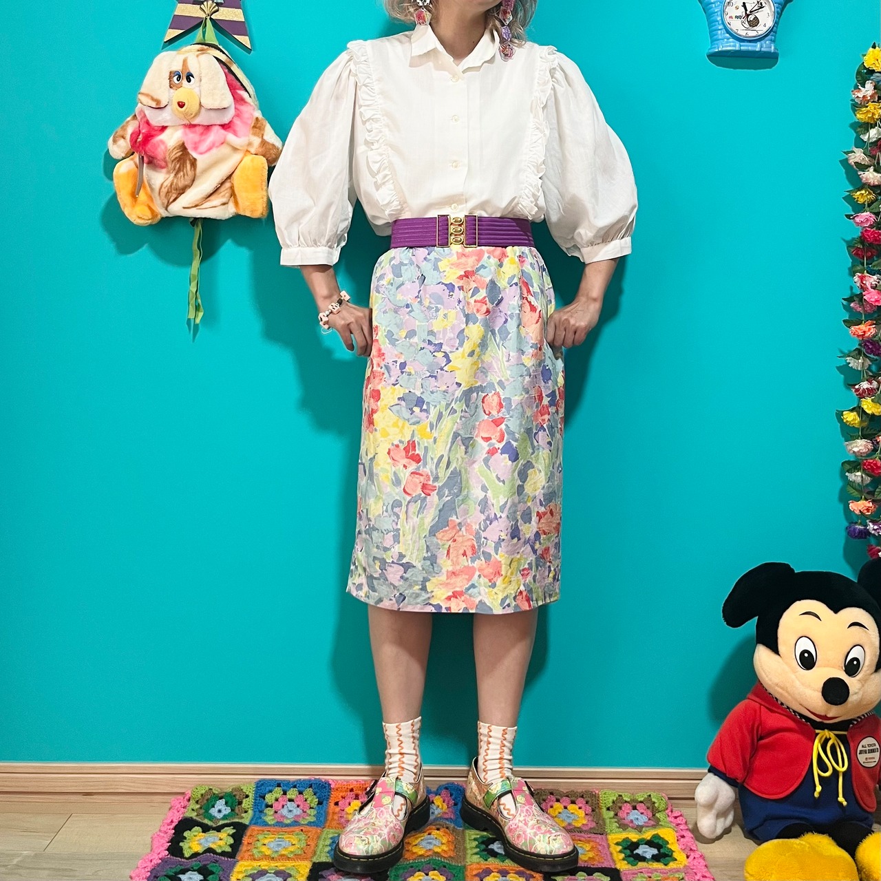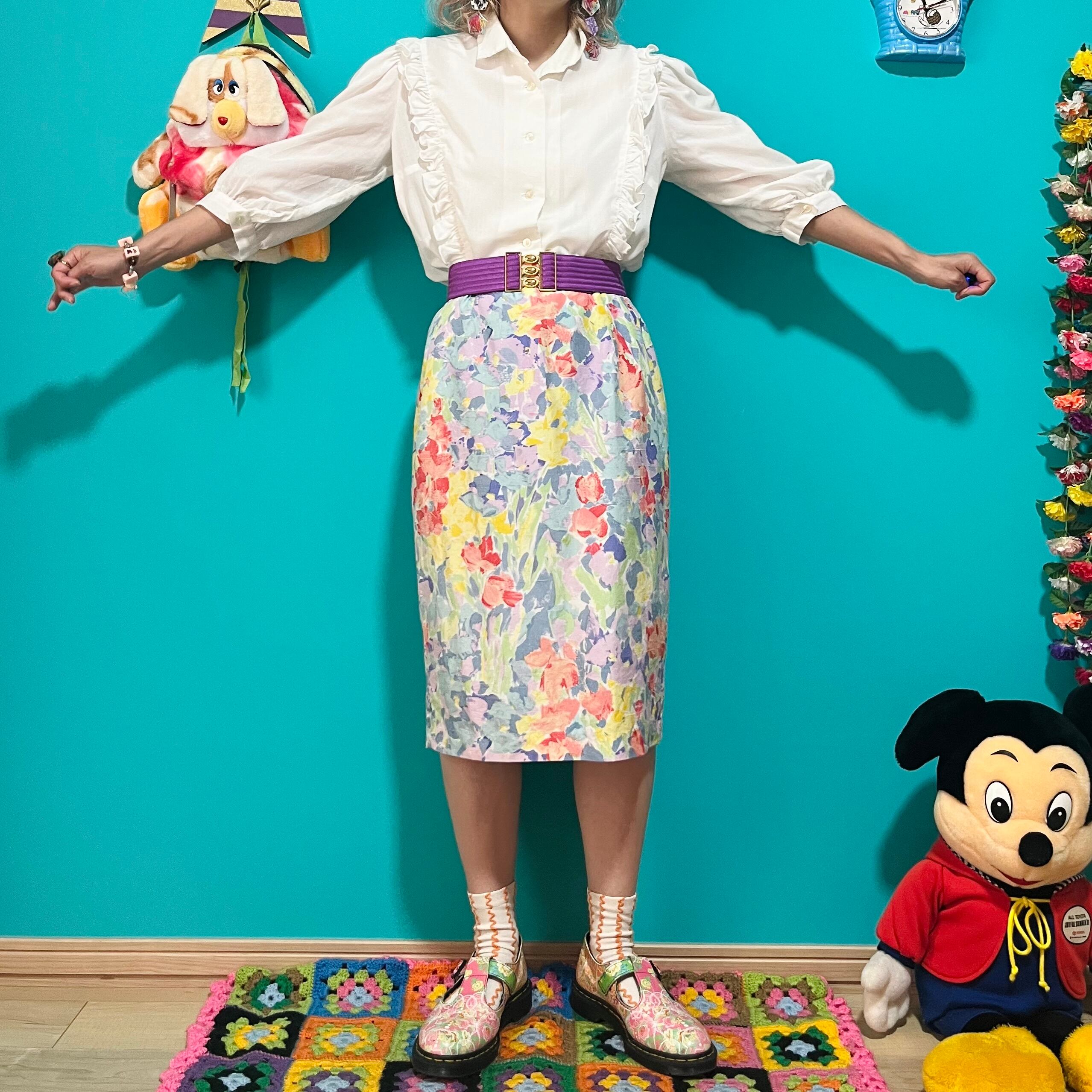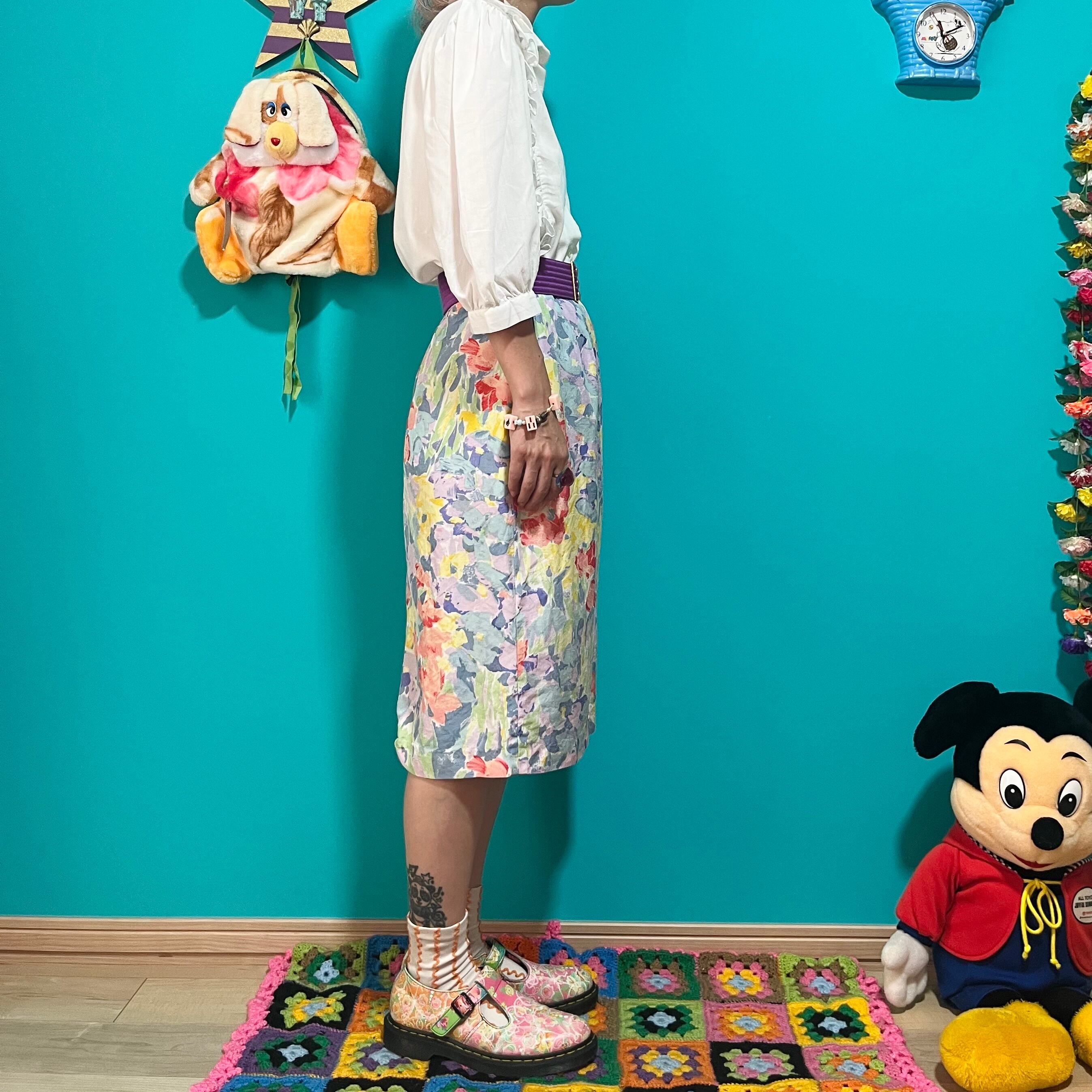 絵の具で描いたような鮮やかなお花柄タイトスカートです。
