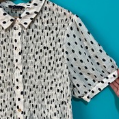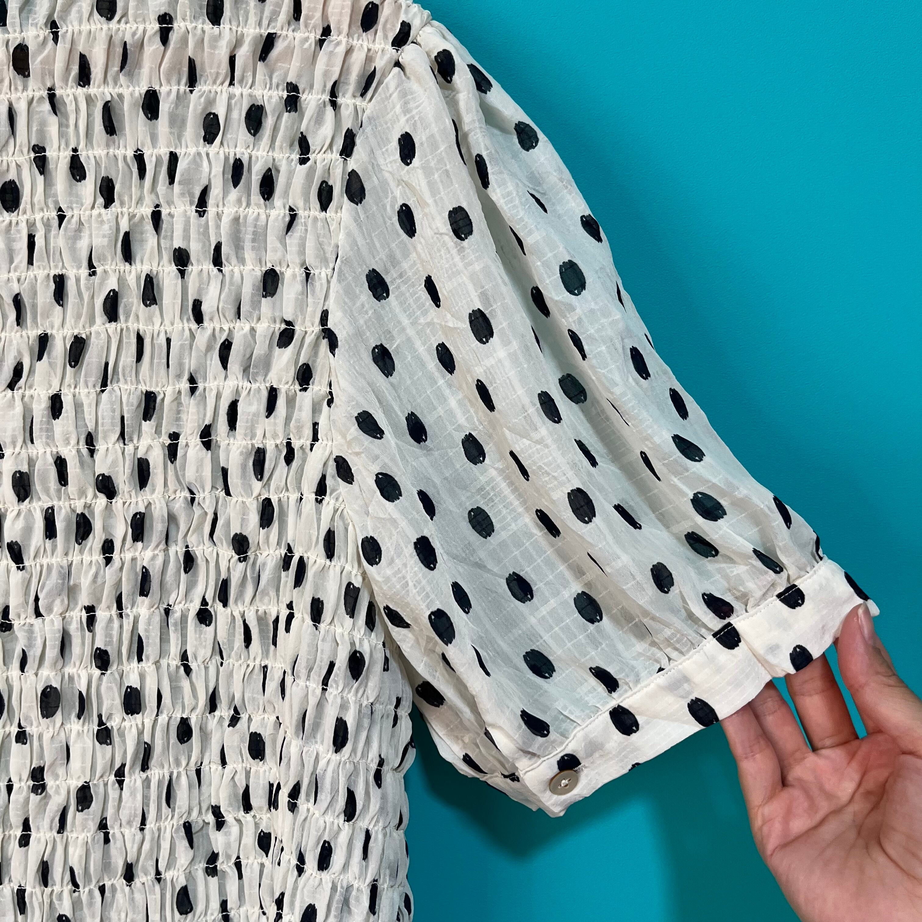クシャッとしたシャーリングが個性的な水玉柄ブラウスです。