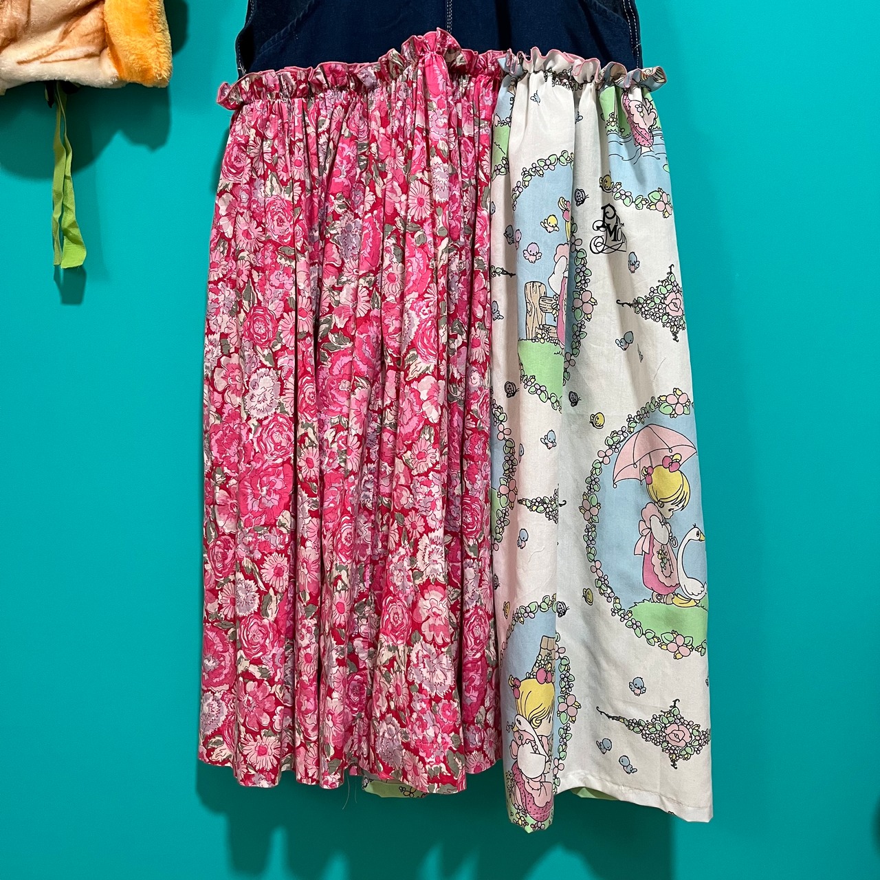 古着のリバティオーバーオールにプレシャスモーメンツのvintageシーツと古着スカートをドッキングしました。