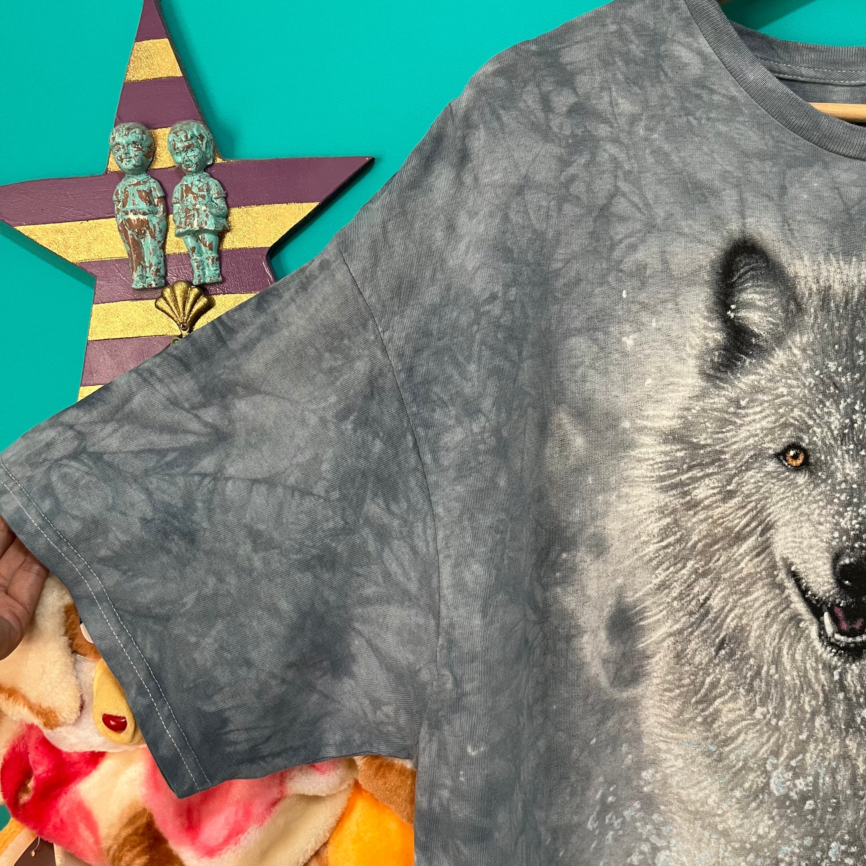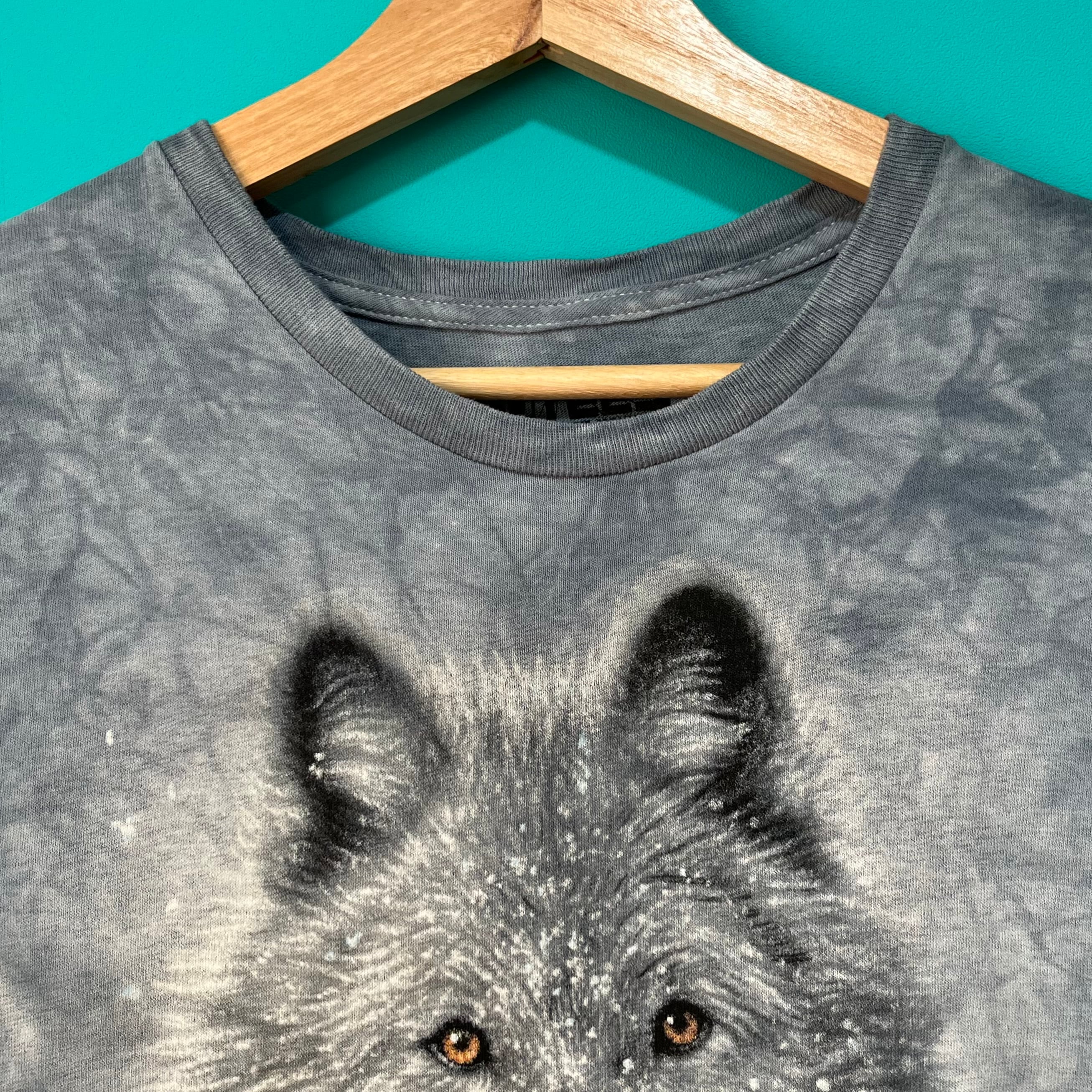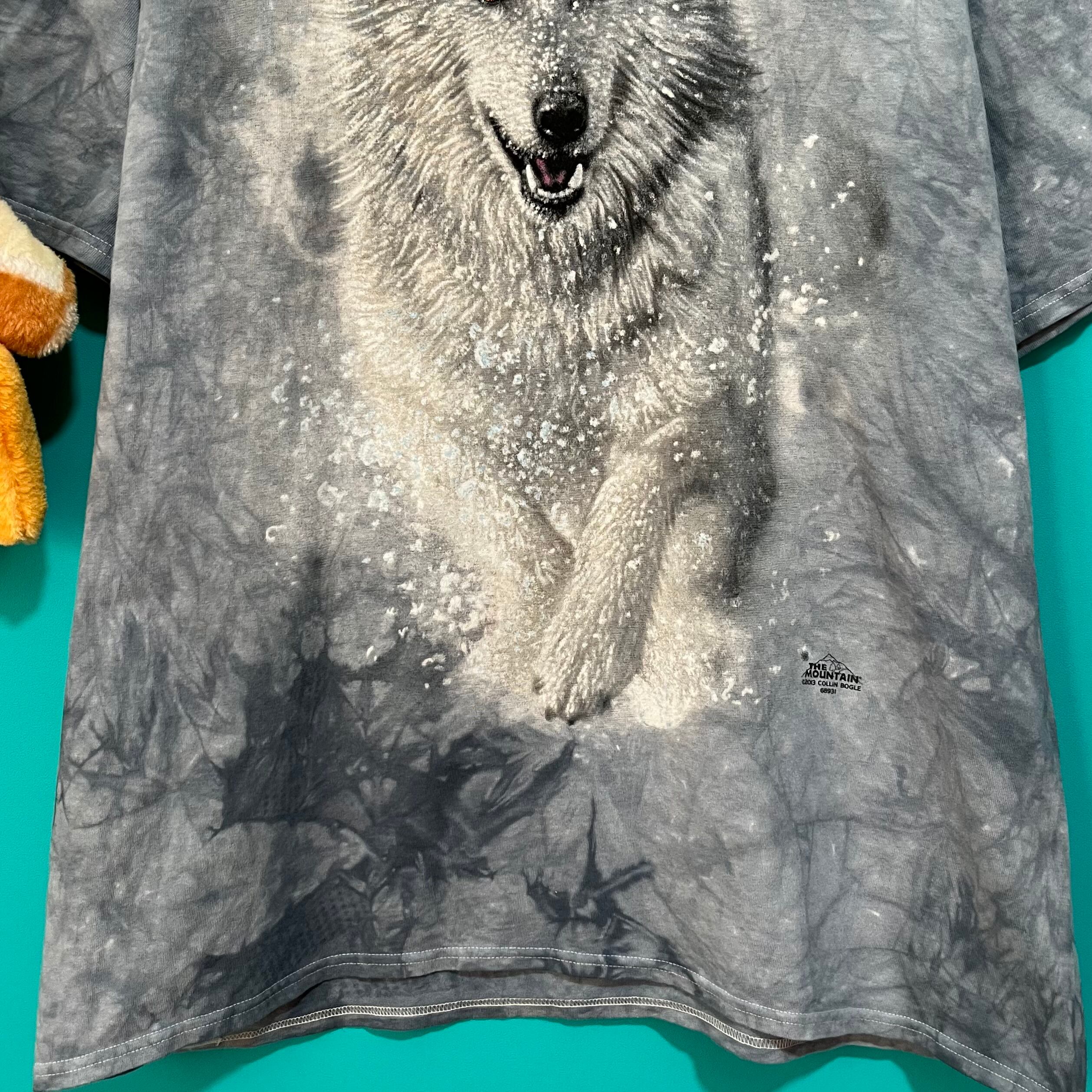 the mountainグレーのムラ染めに白いオオカミがプリントされたTシャツです。
