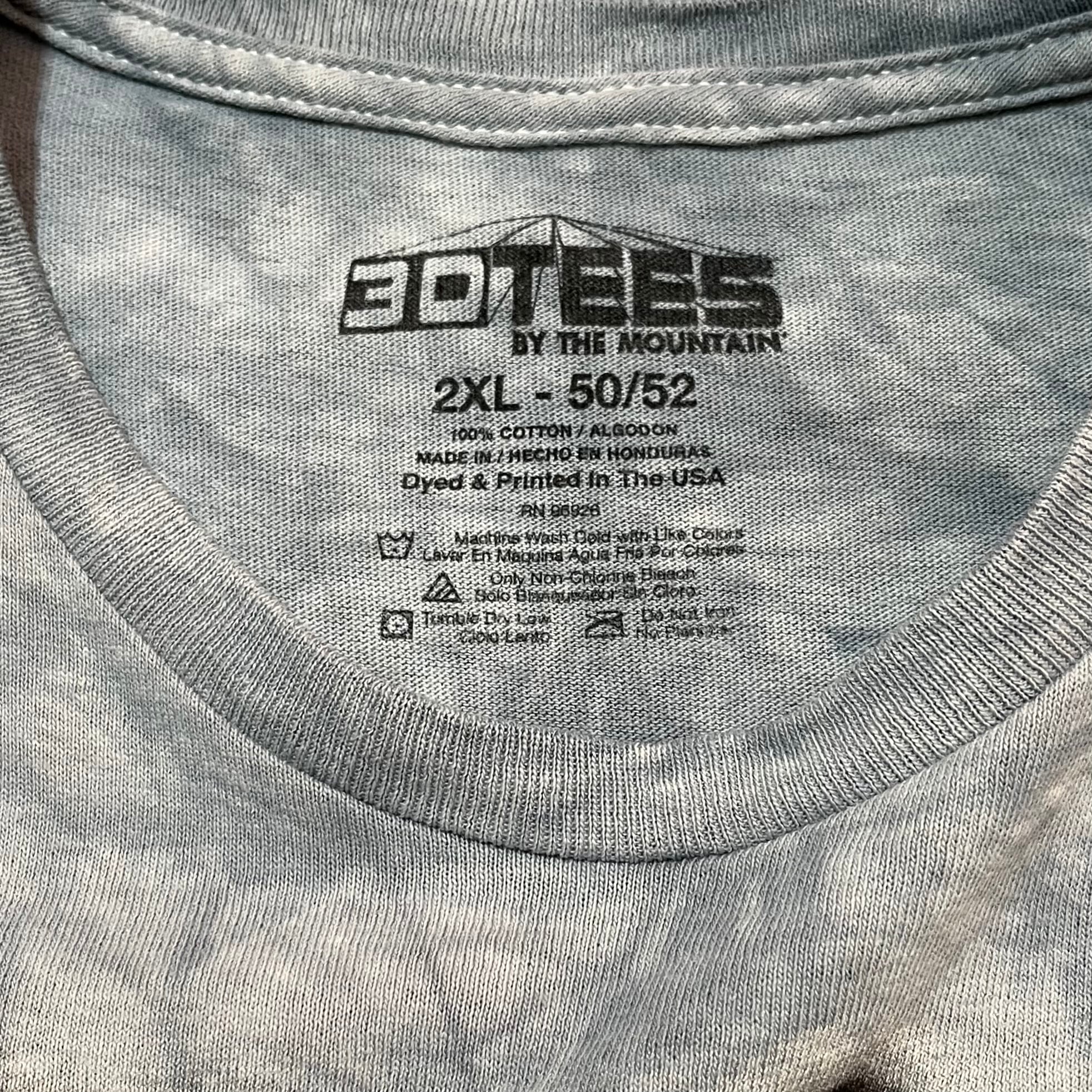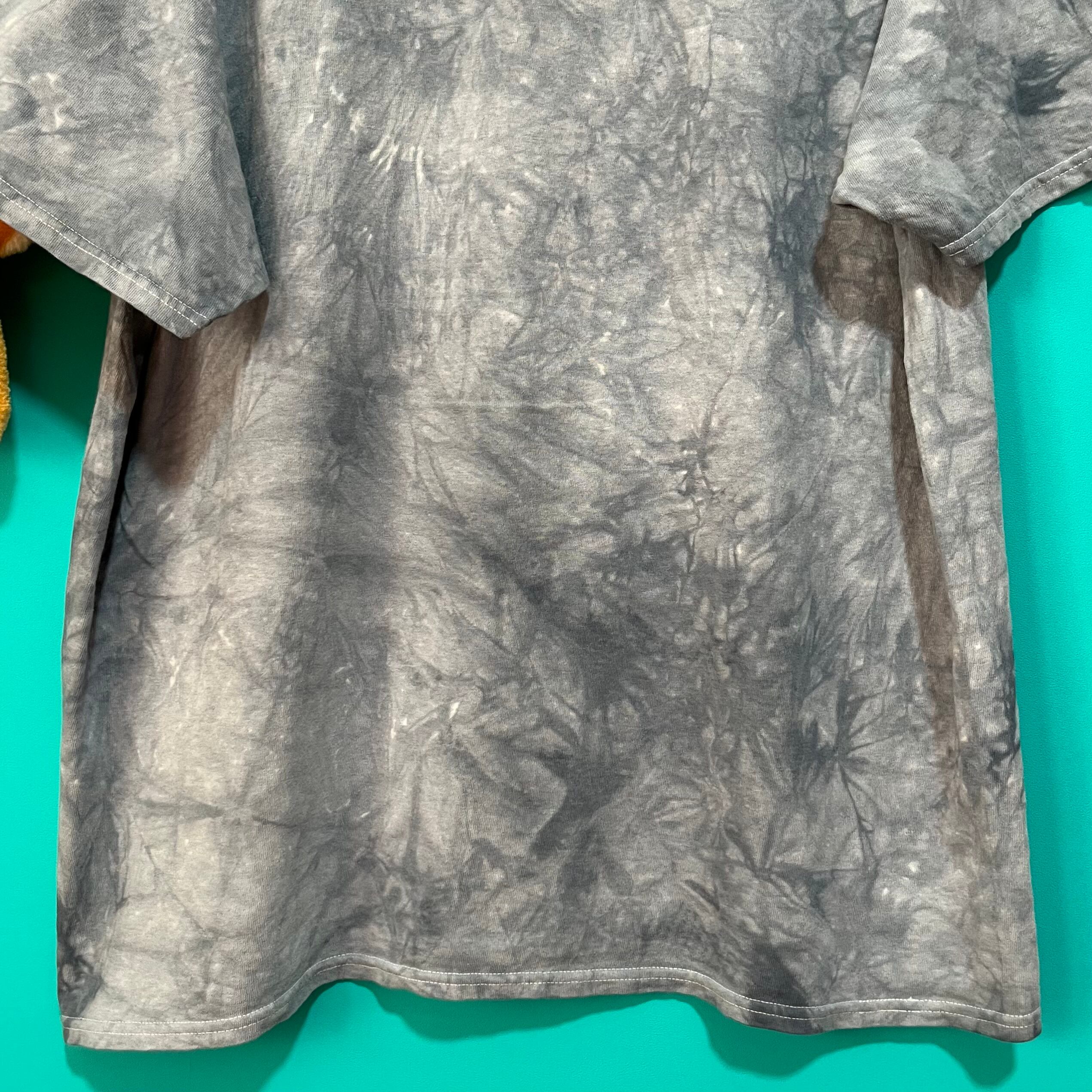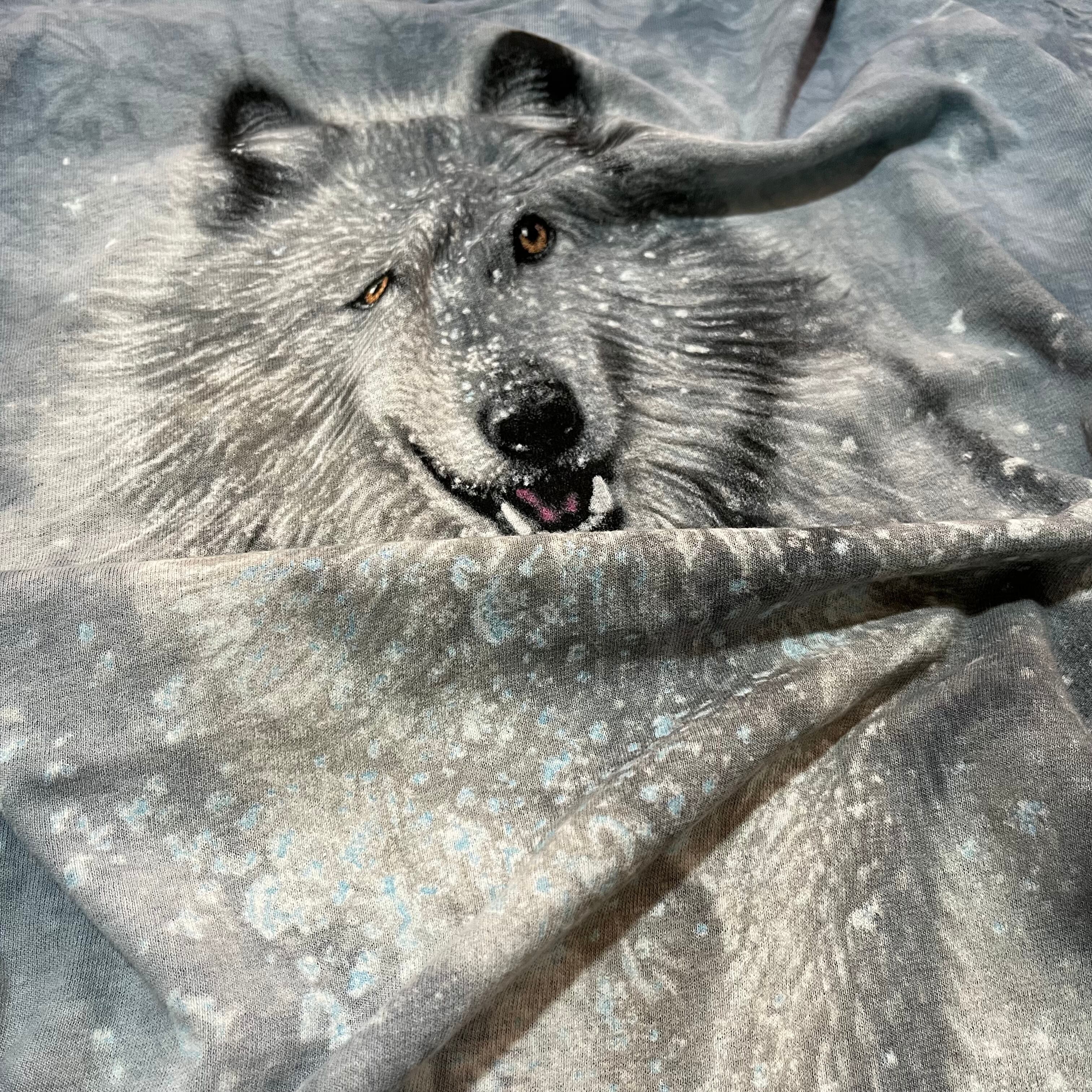 the mountainグレーのムラ染めに白いオオカミがプリントされたTシャツです。
