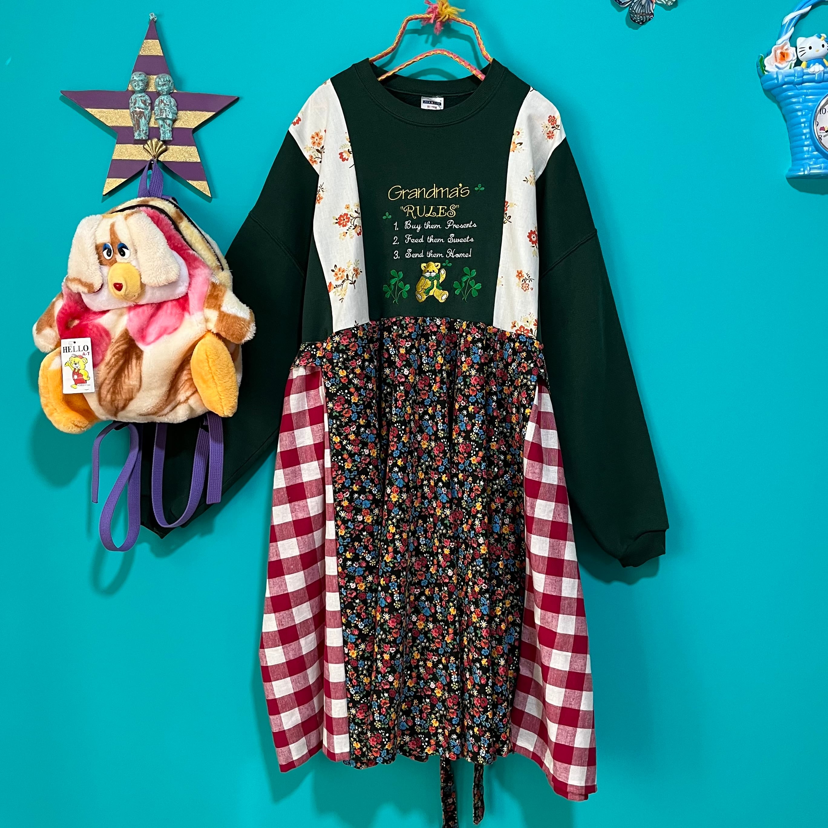 赤いチェック柄を合わせて、お花柄部分はアメリカ古着のエプロンです。