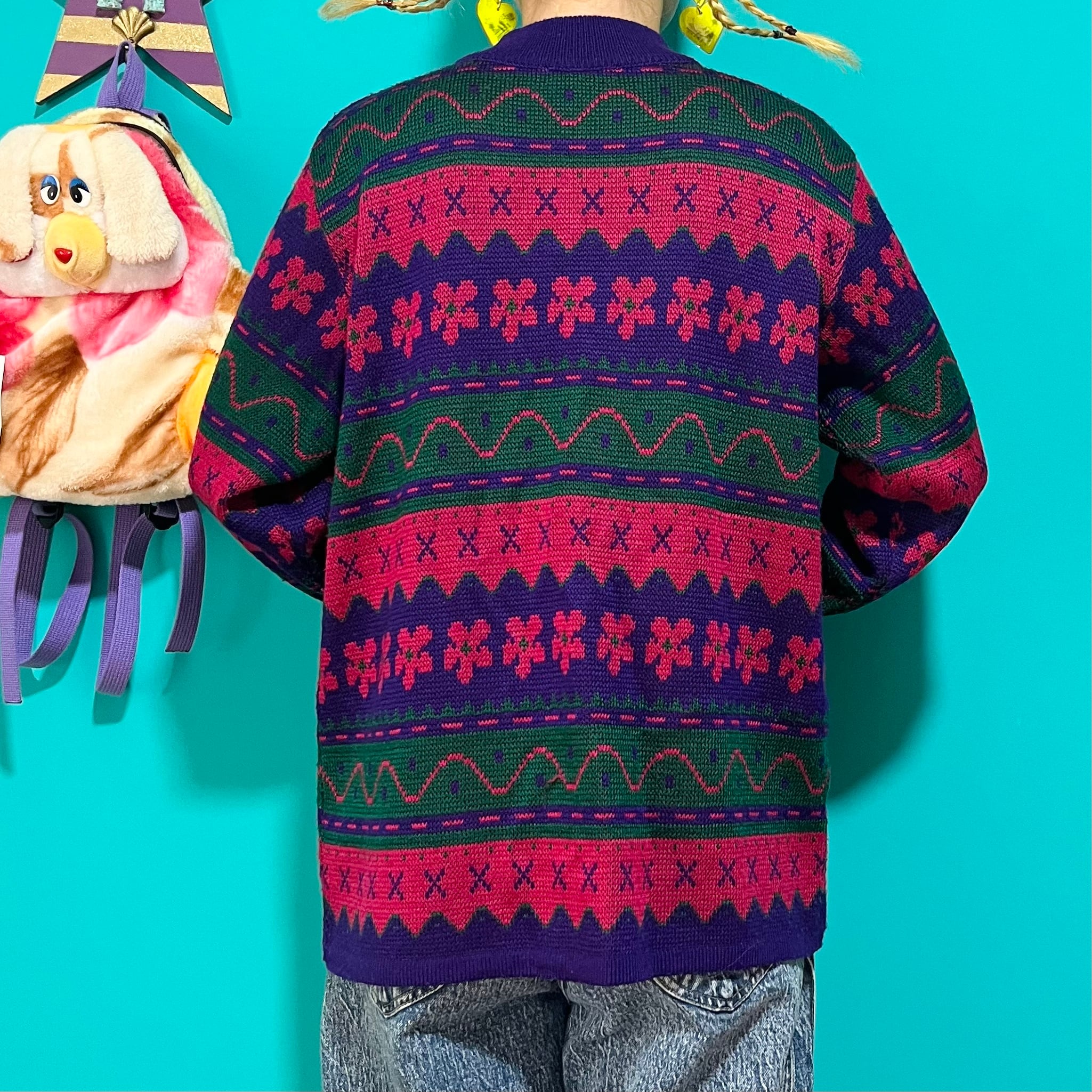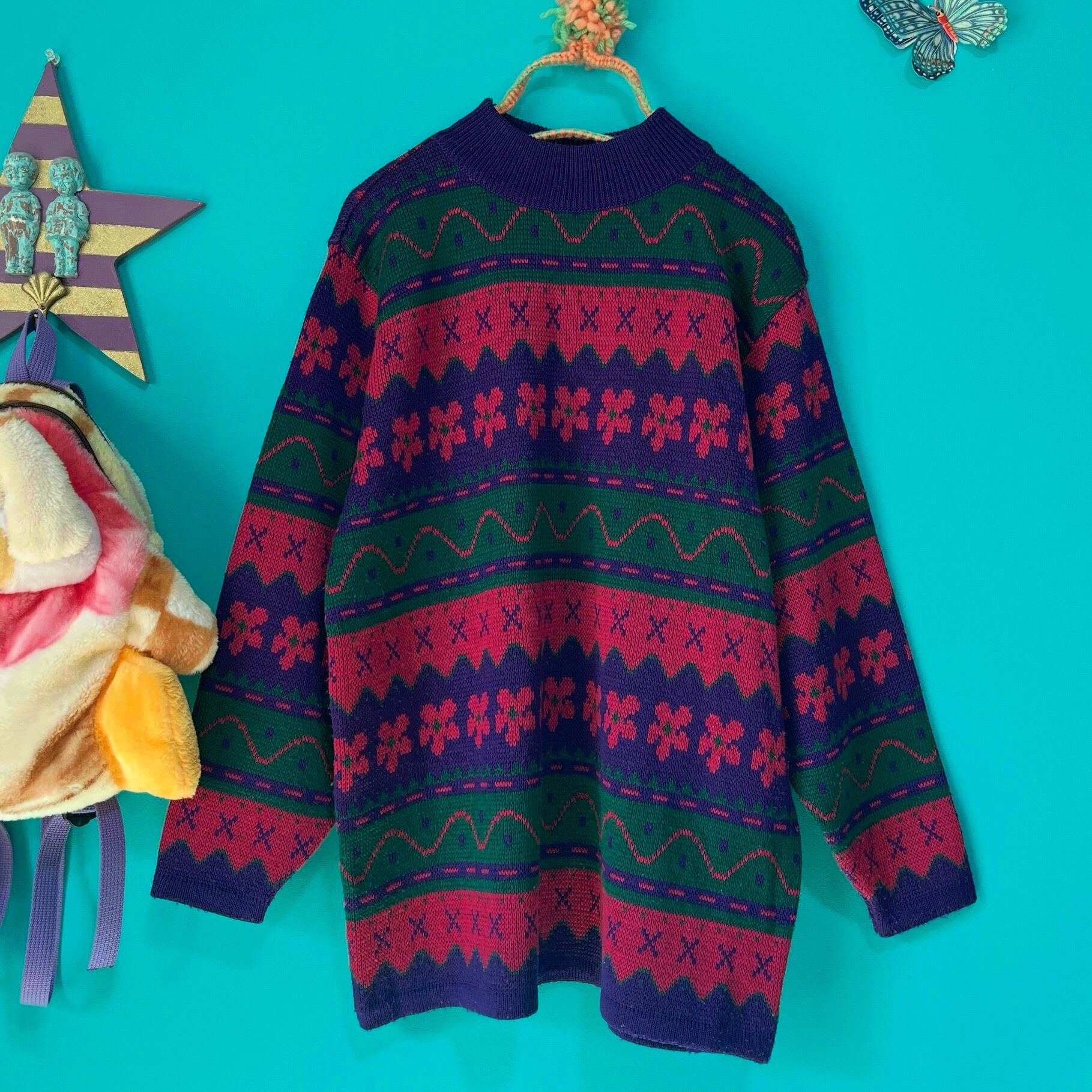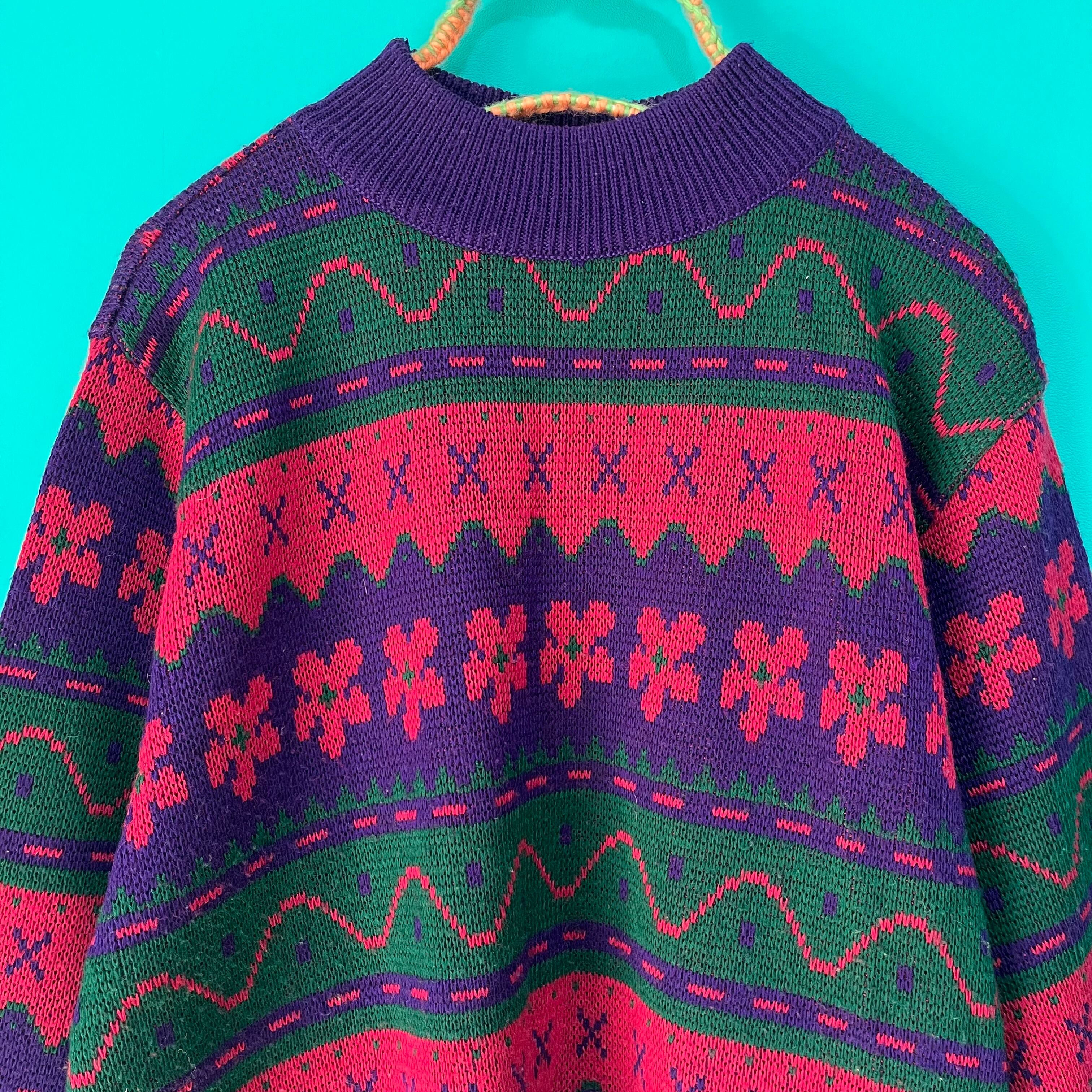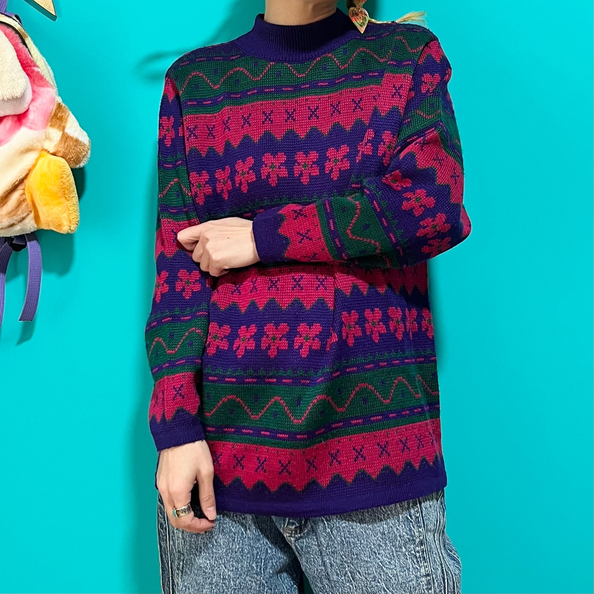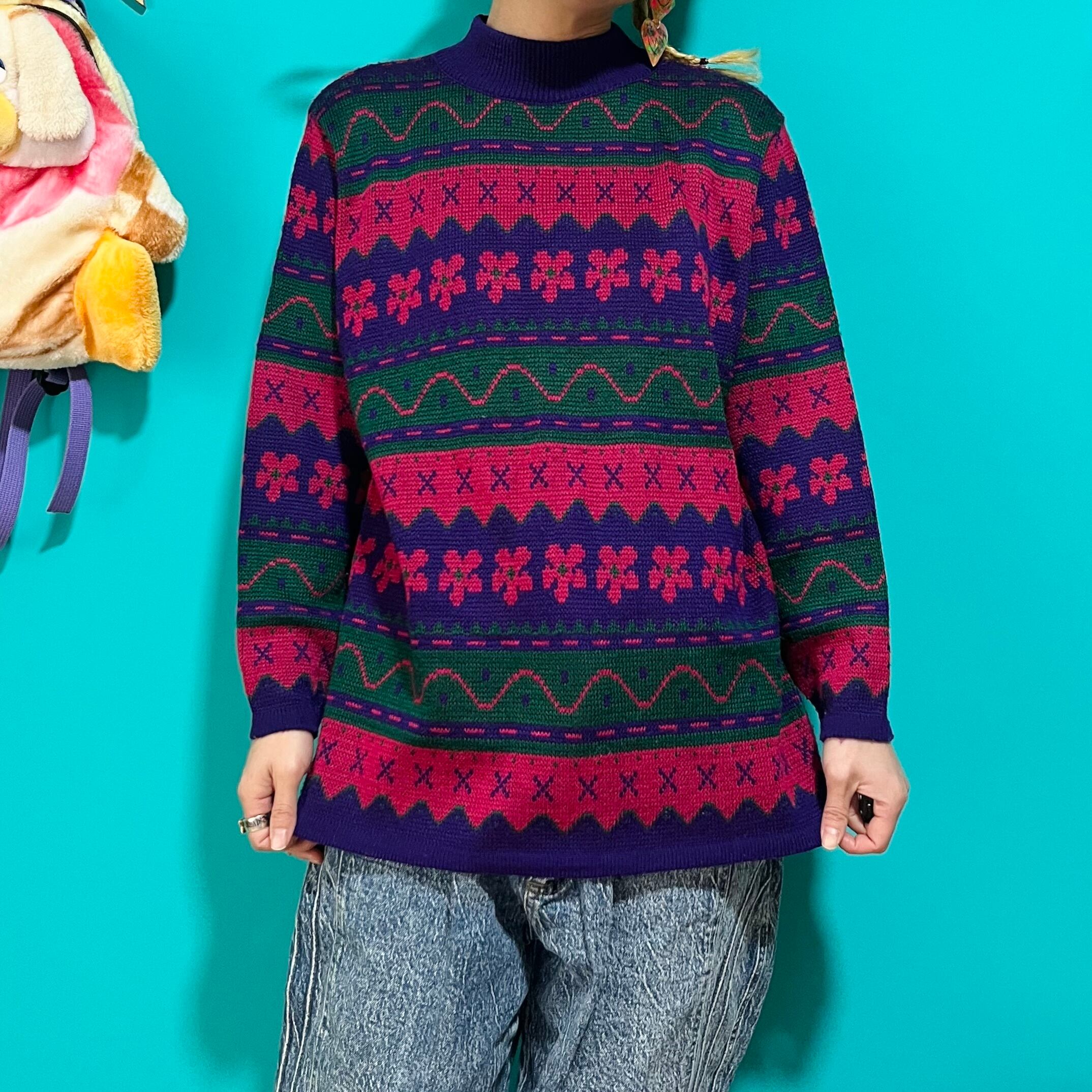 ぐにゃぐにゃした模様が個性的なお花柄レトロニットです。