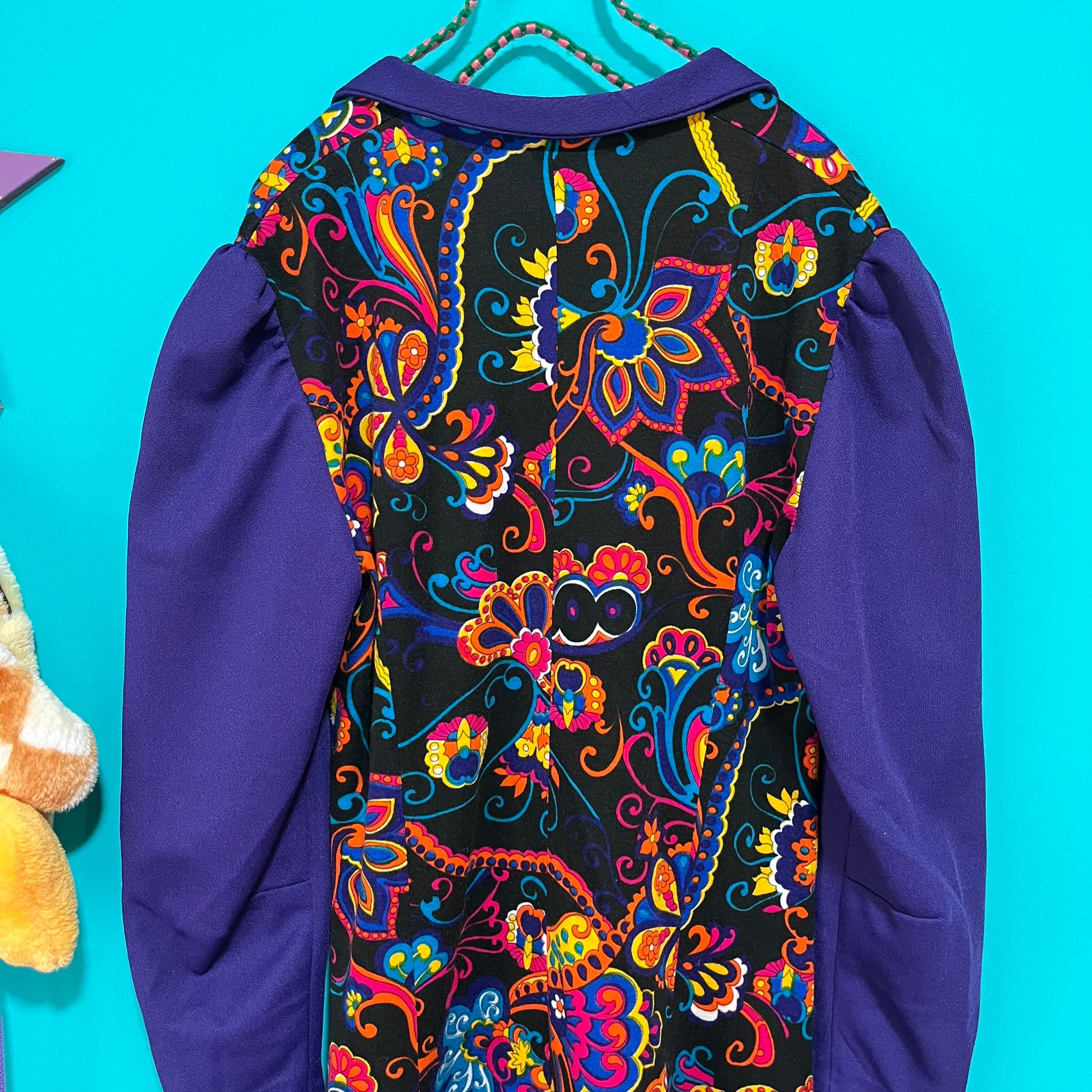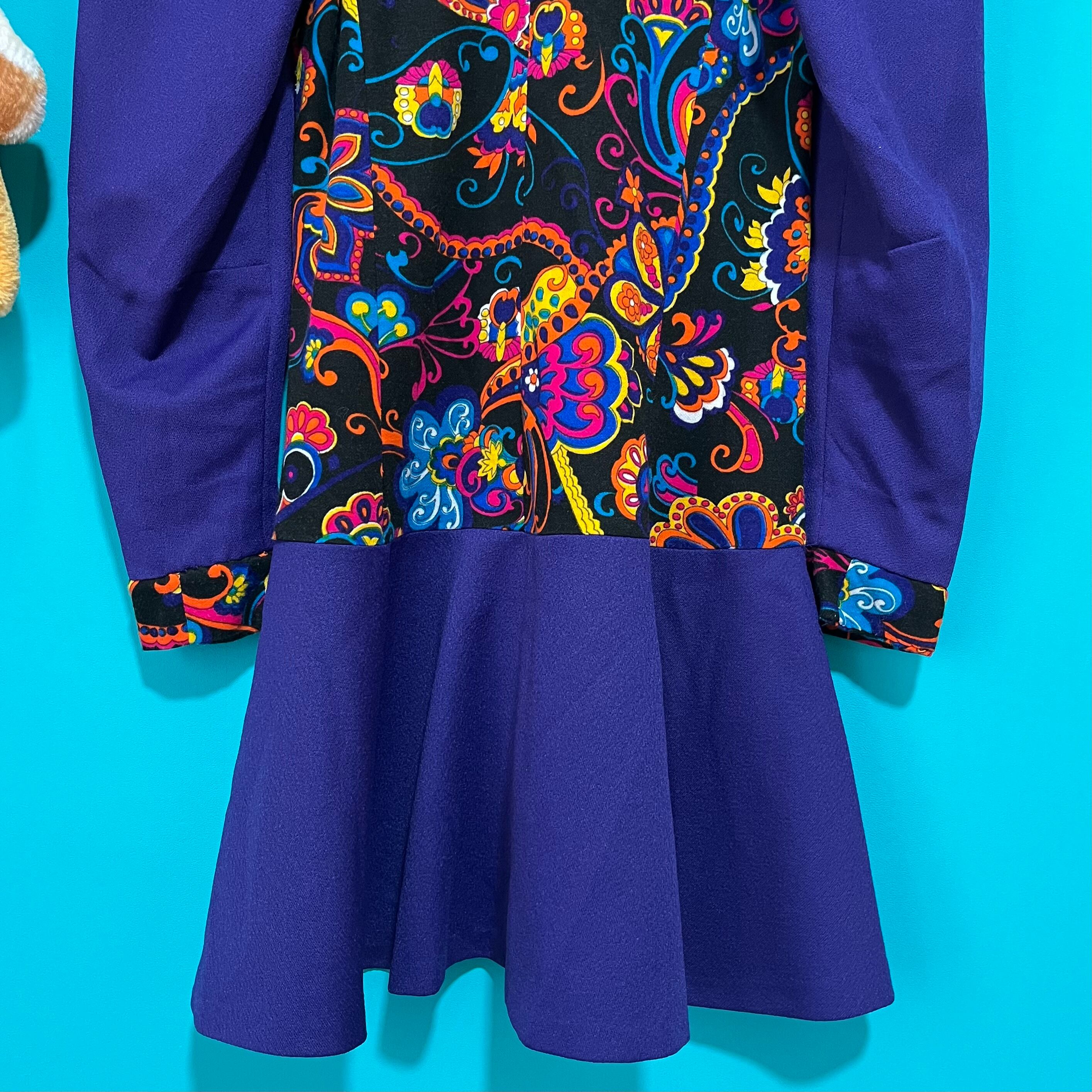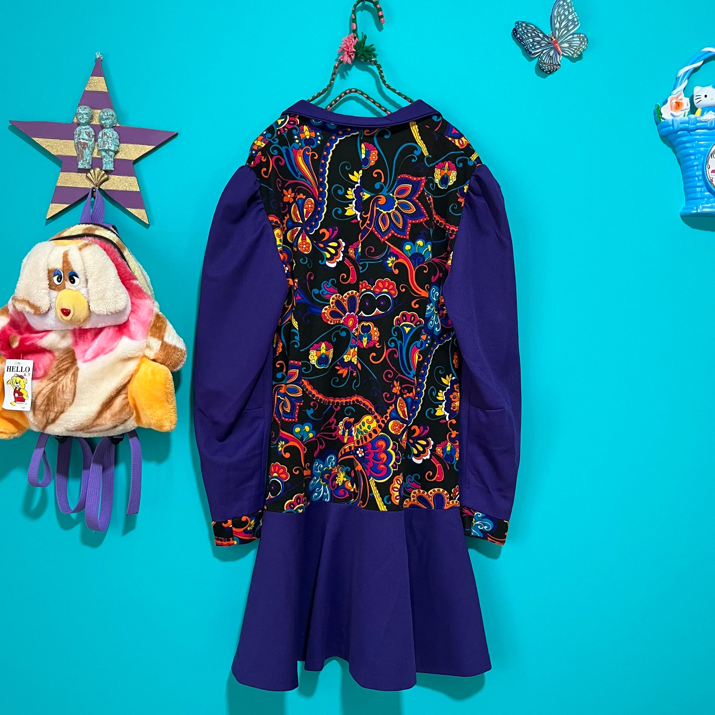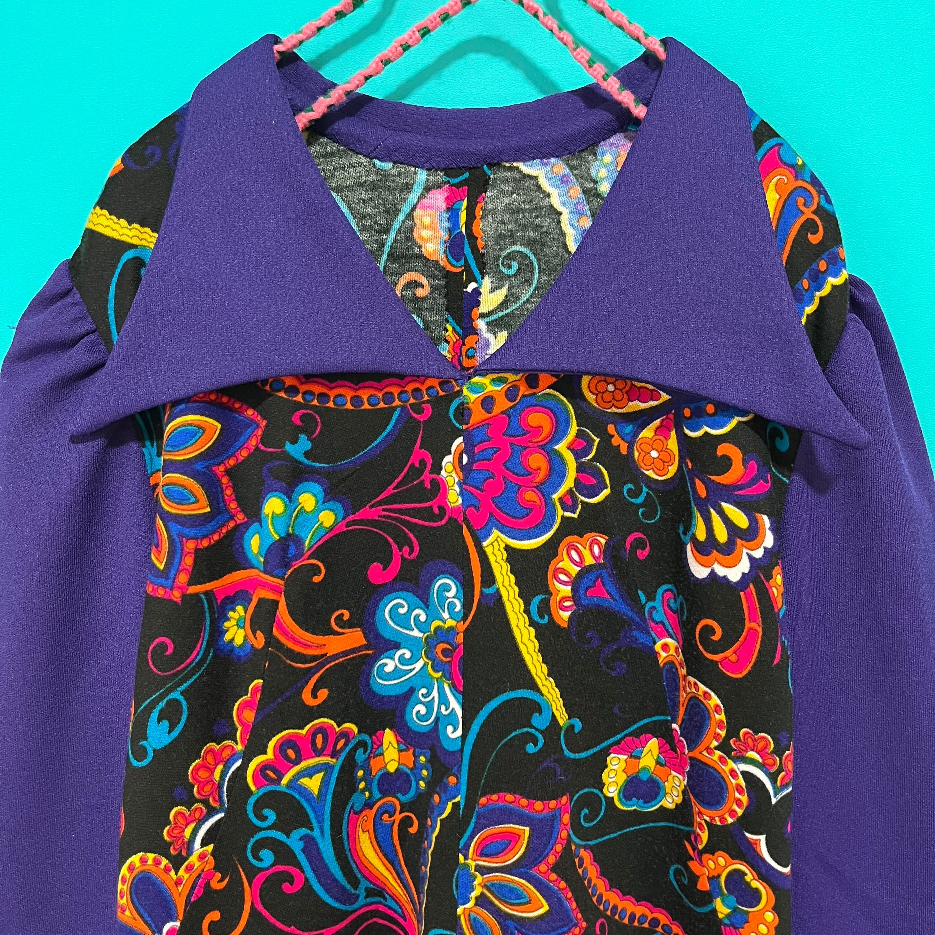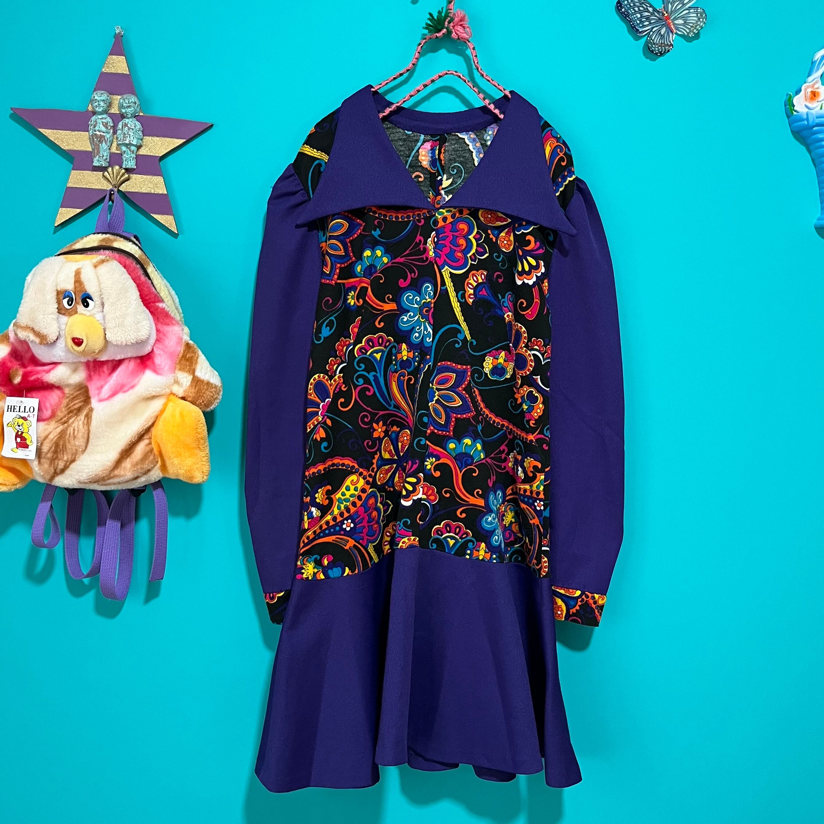 サイケデリックな模様と深いパープルの組み合わせが印象的なレトロワンピースです。