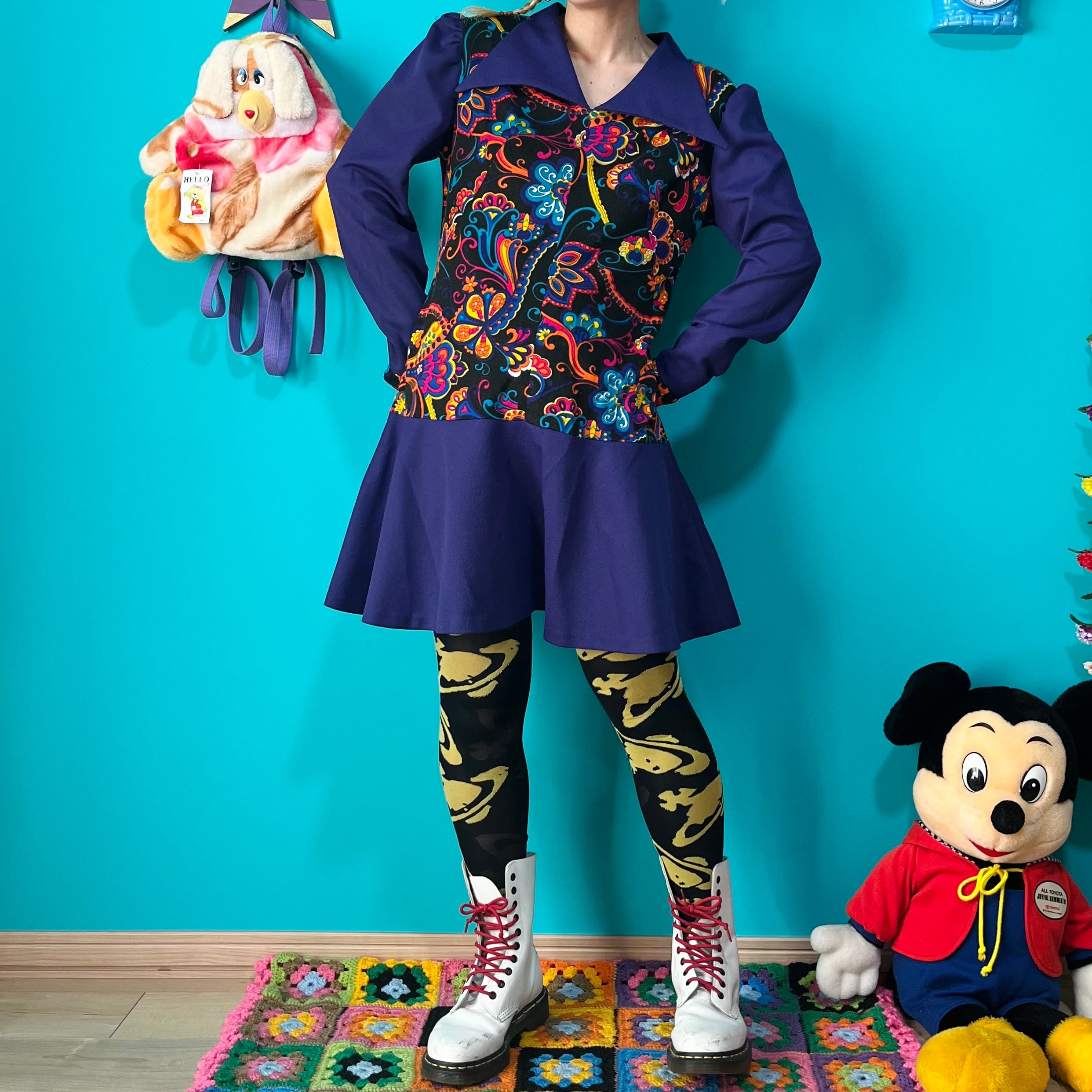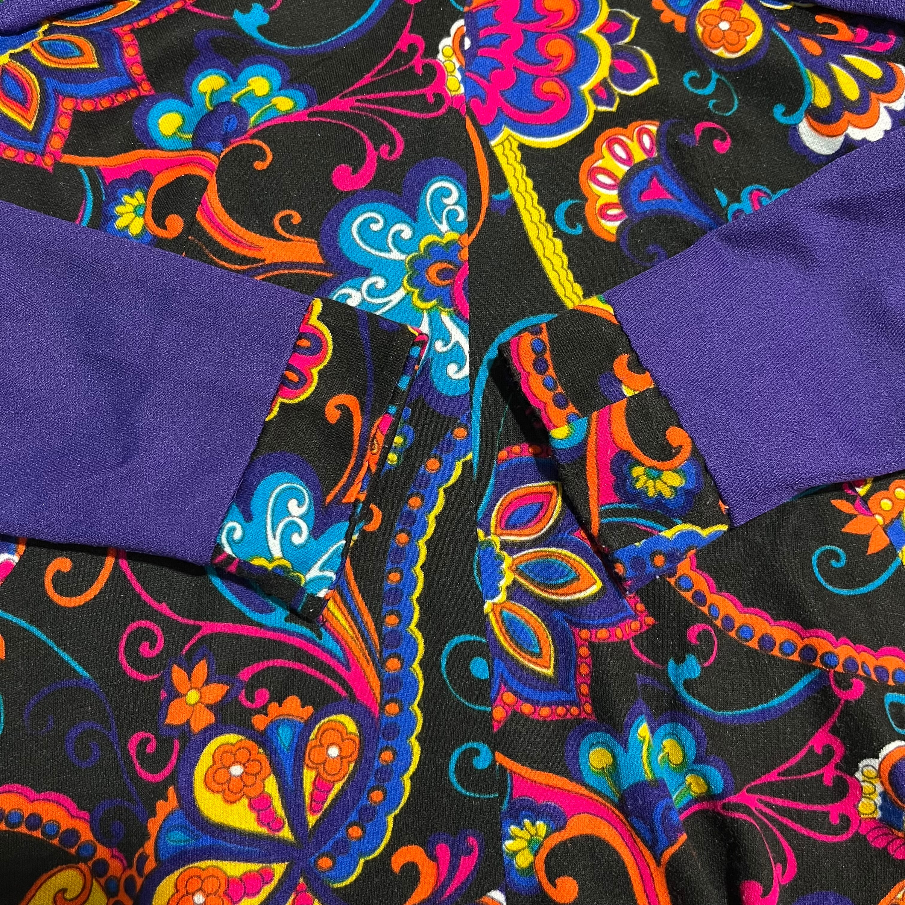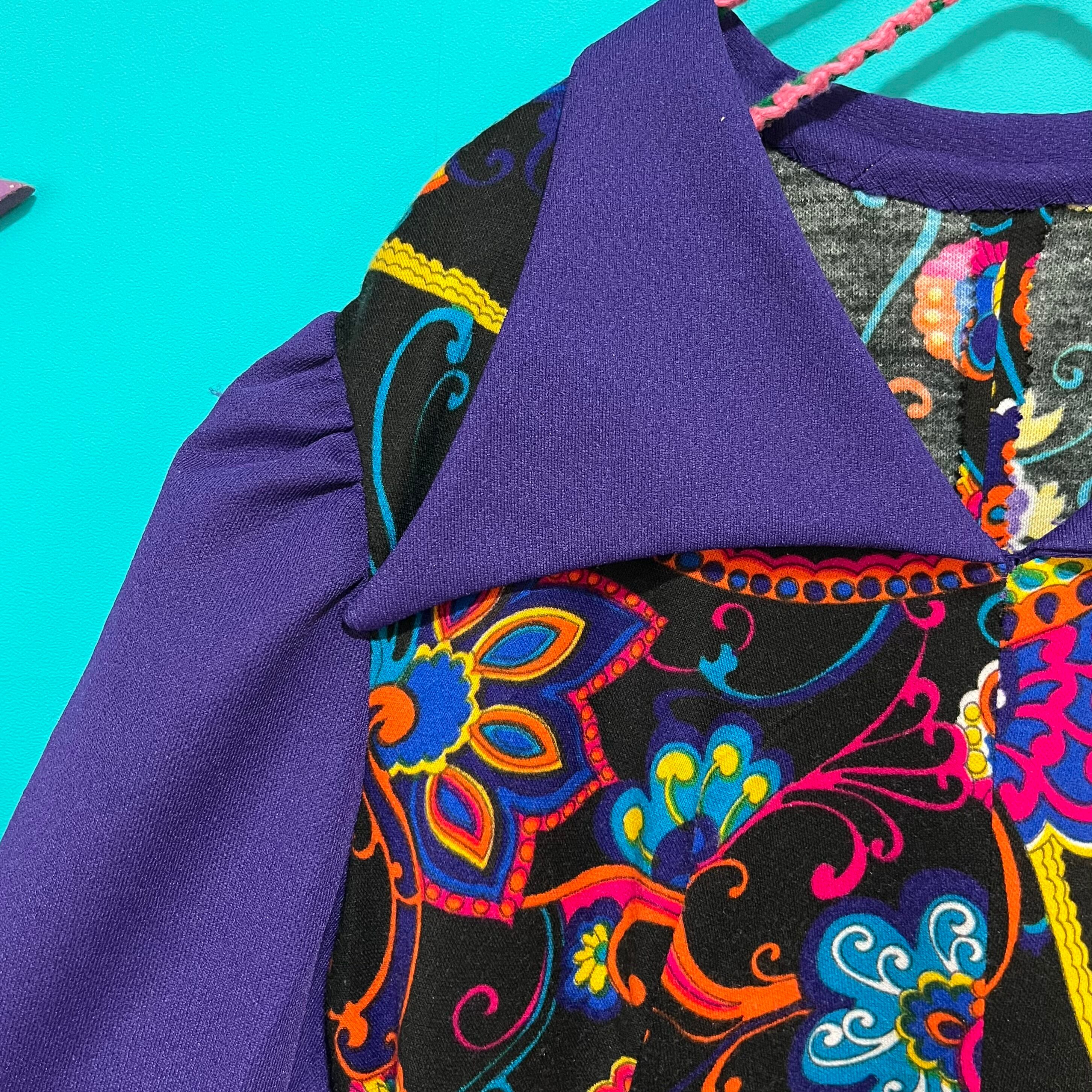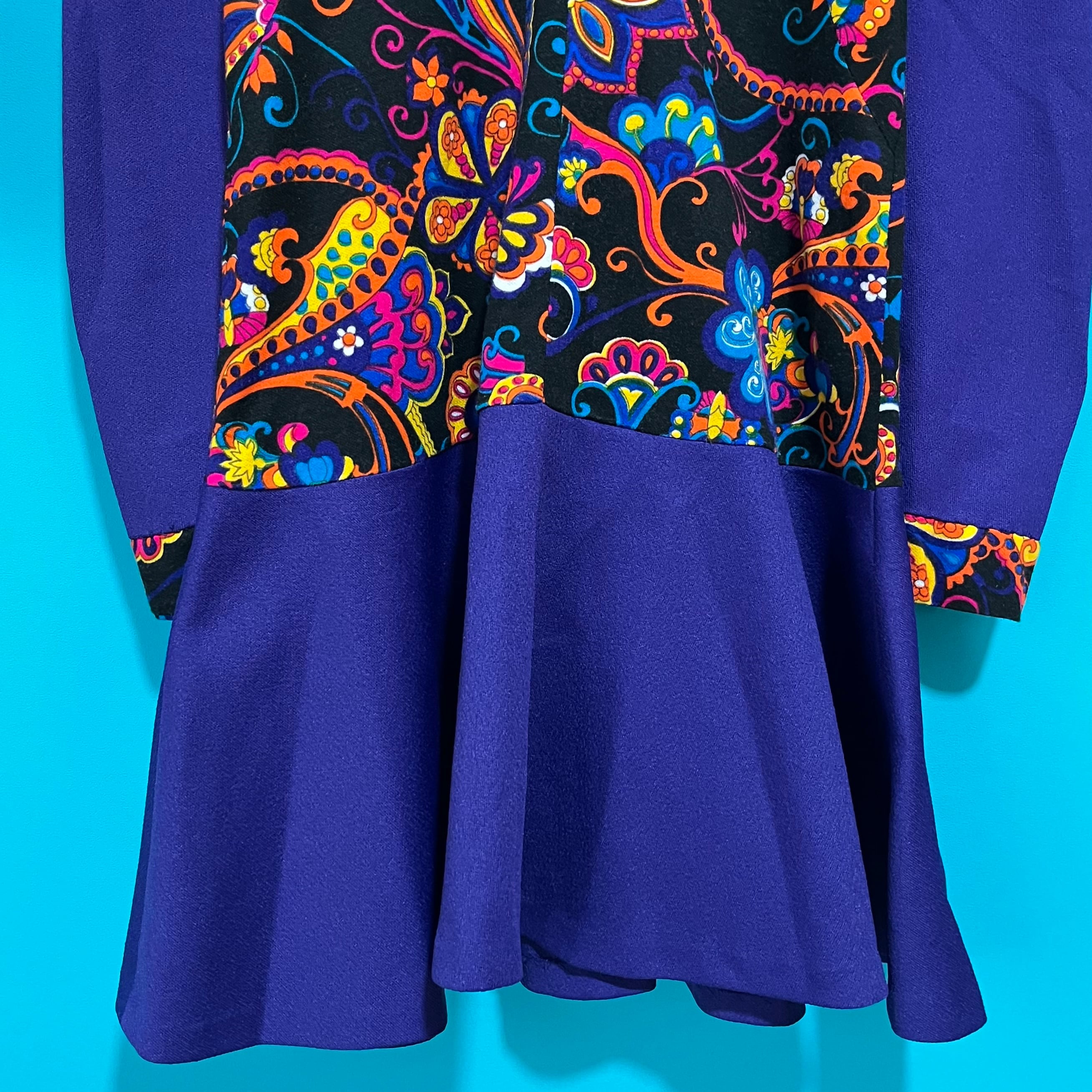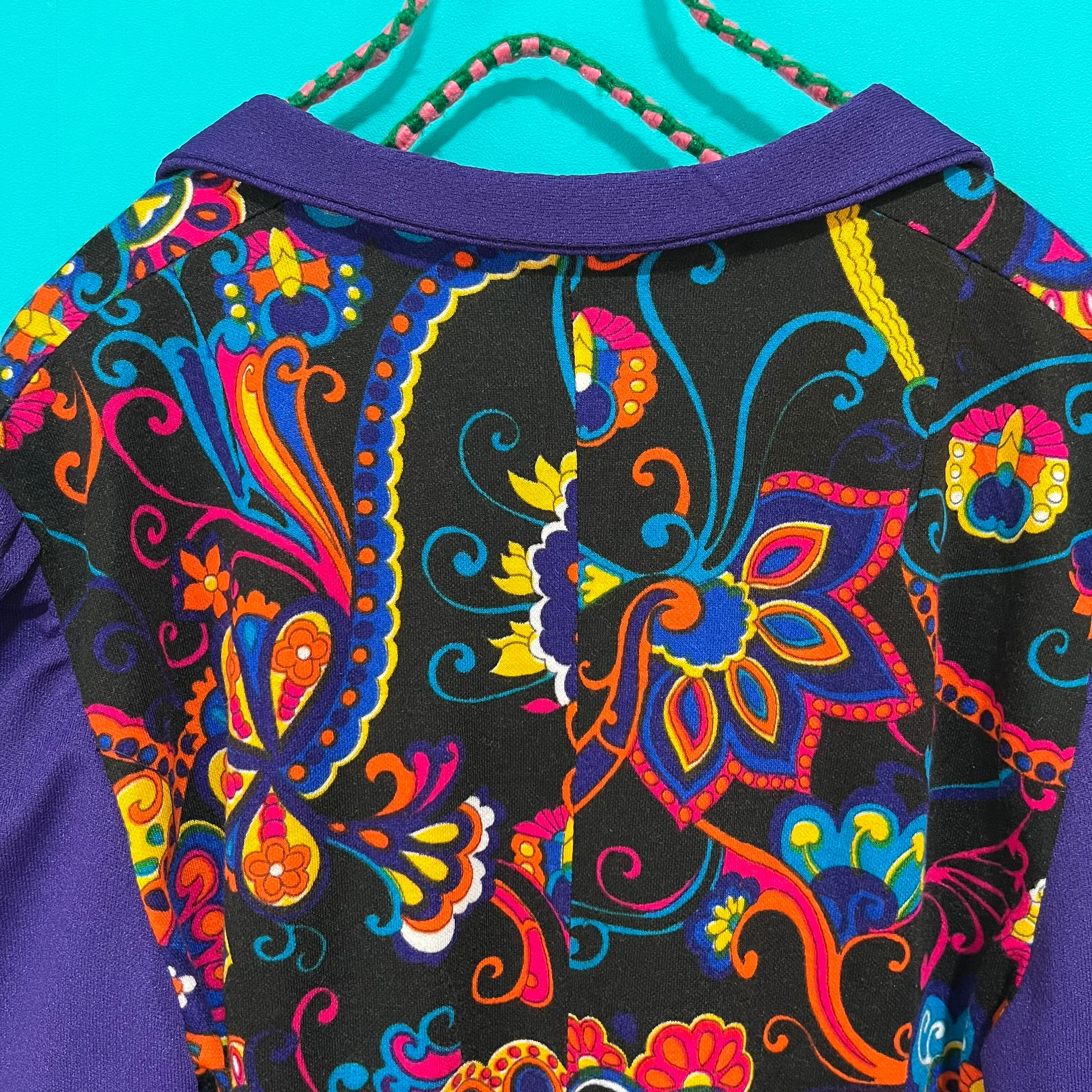 サイケデリックな模様と深いパープルの組み合わせが印象的なレトロワンピースです。