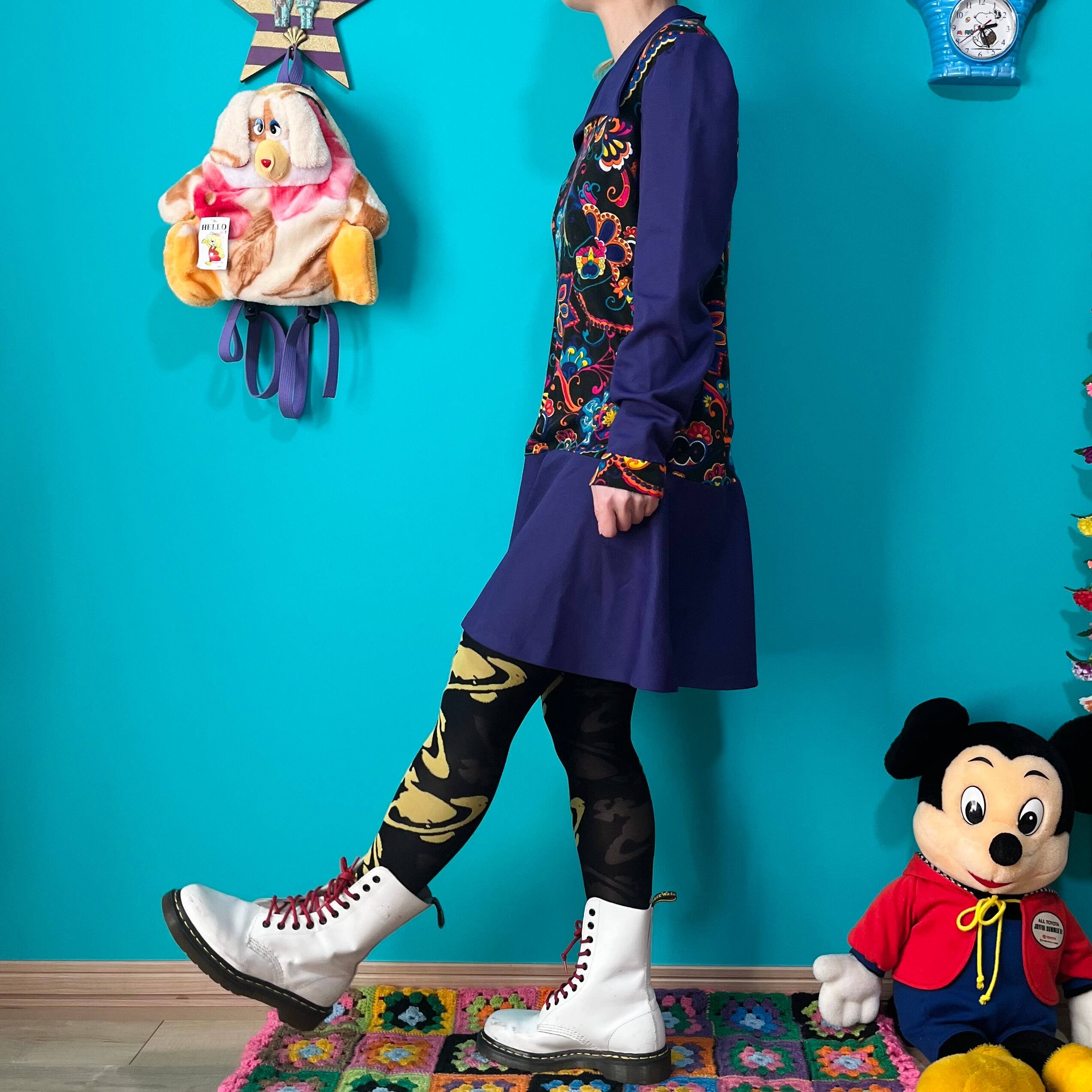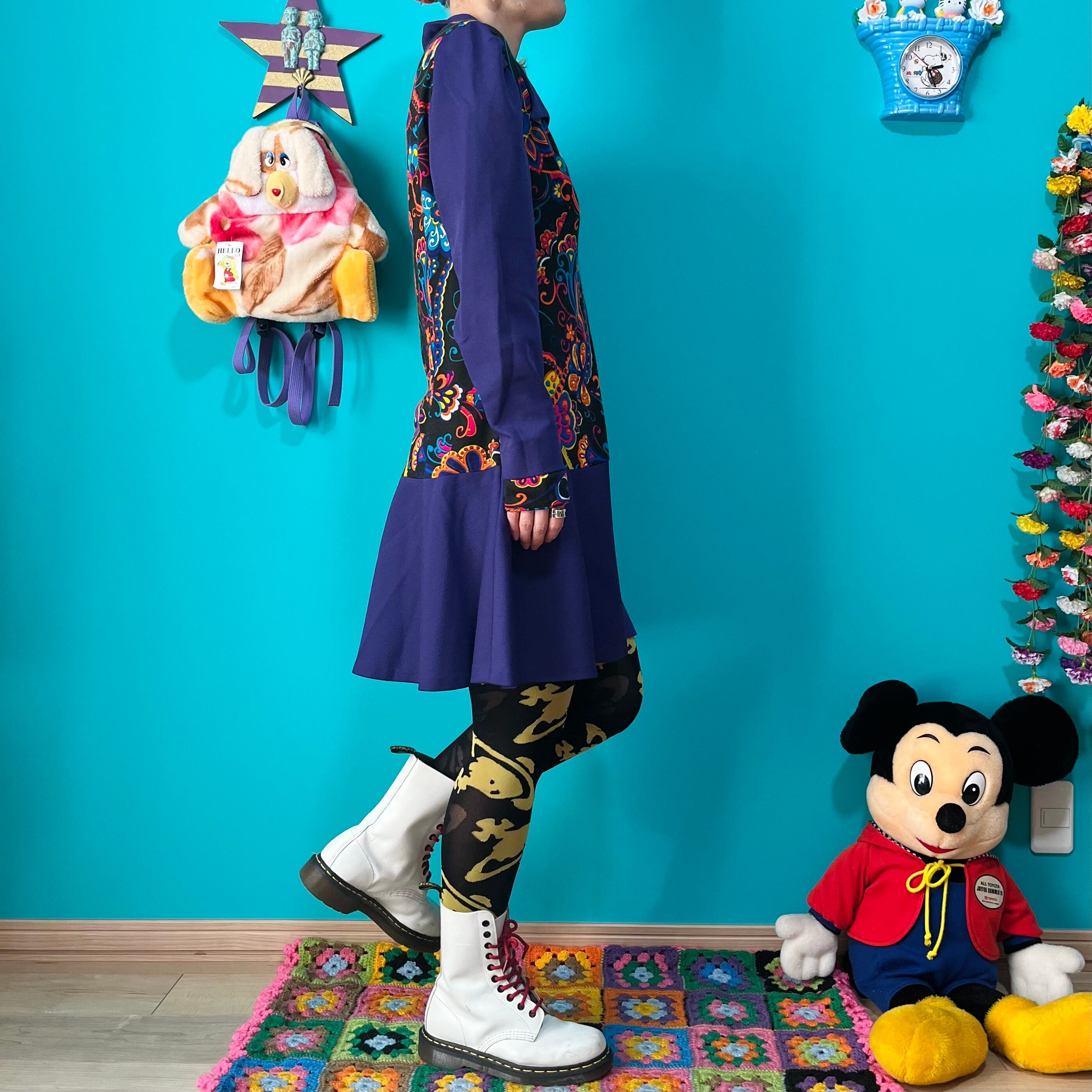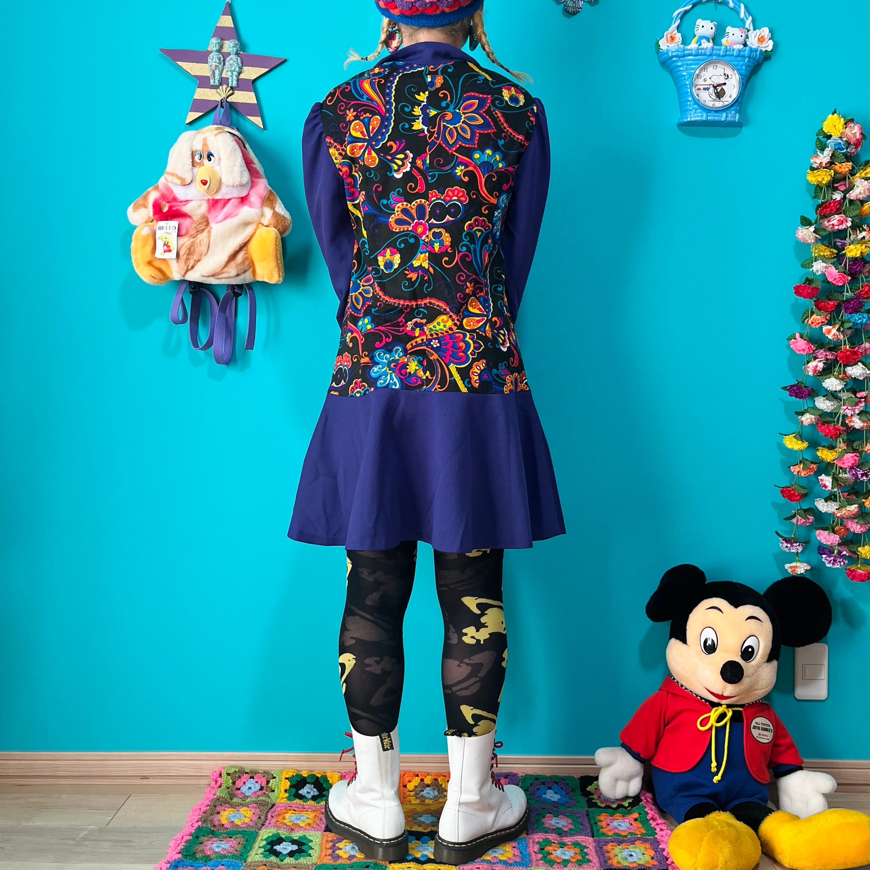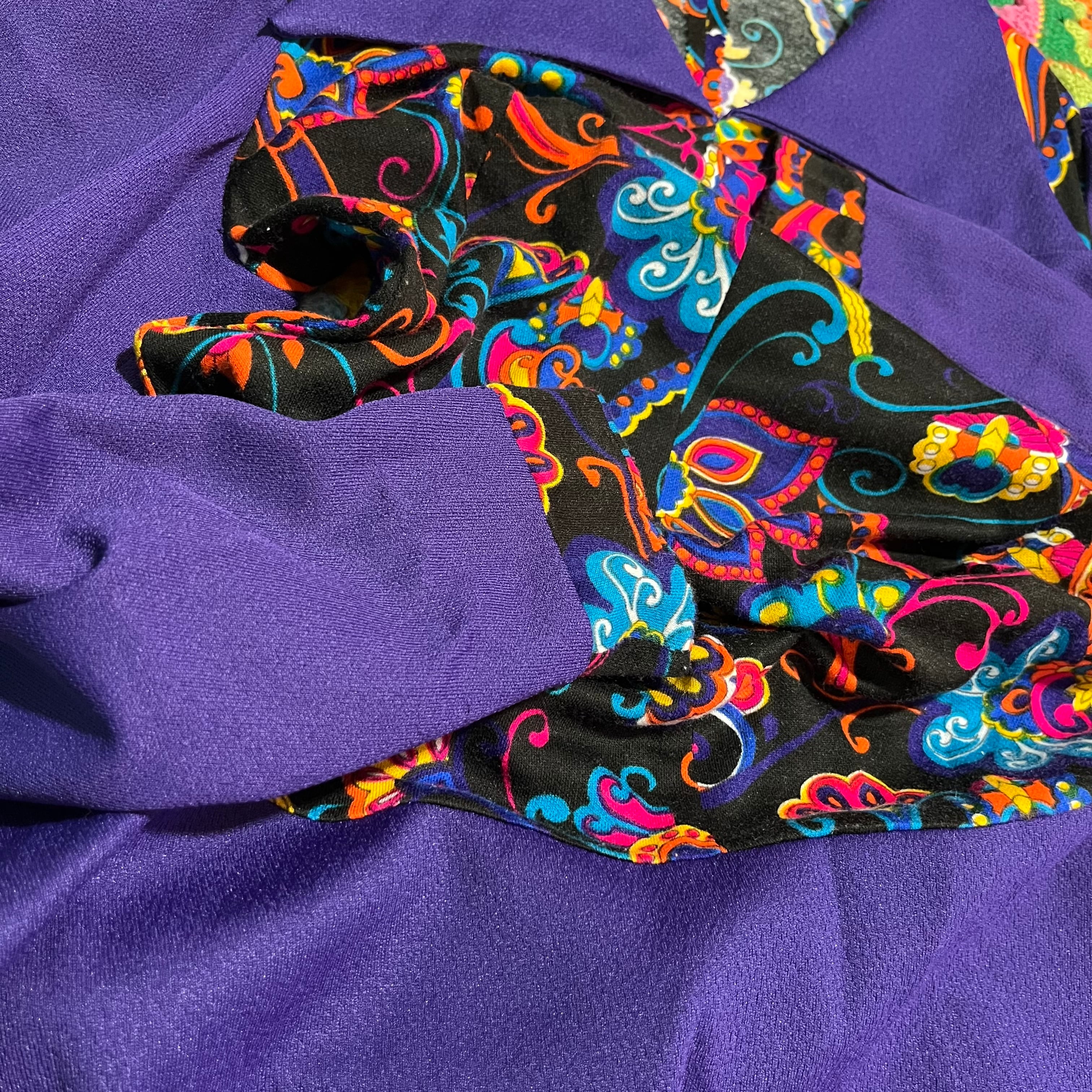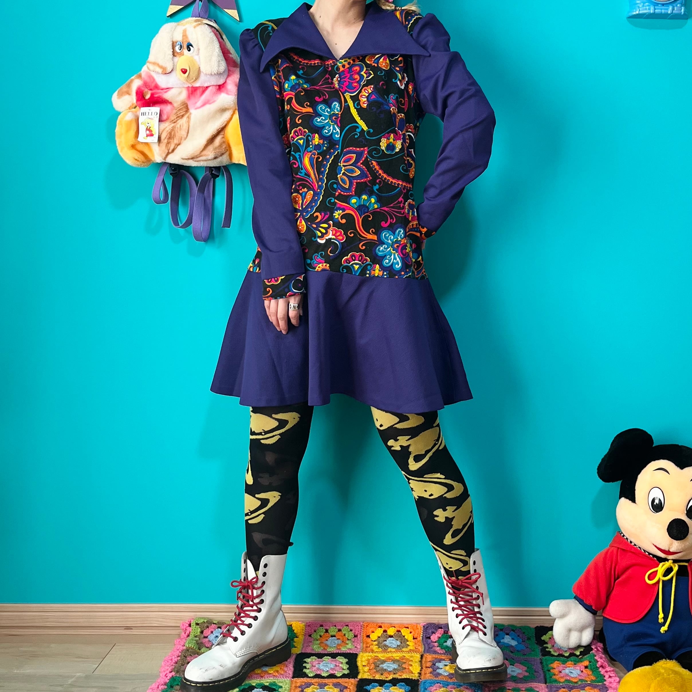 サイケデリックな模様と深いパープルの組み合わせが印象的なレトロワンピースです。