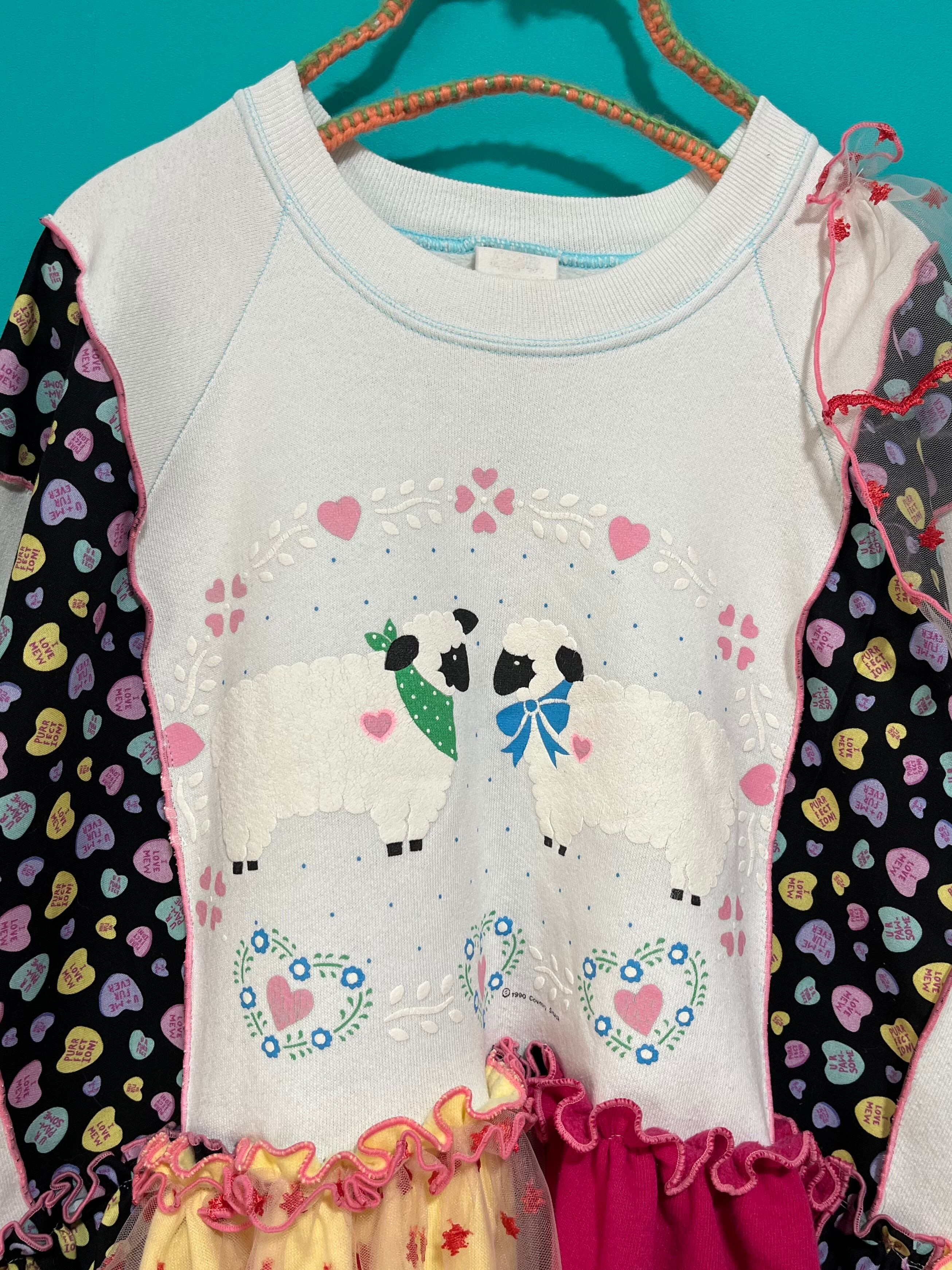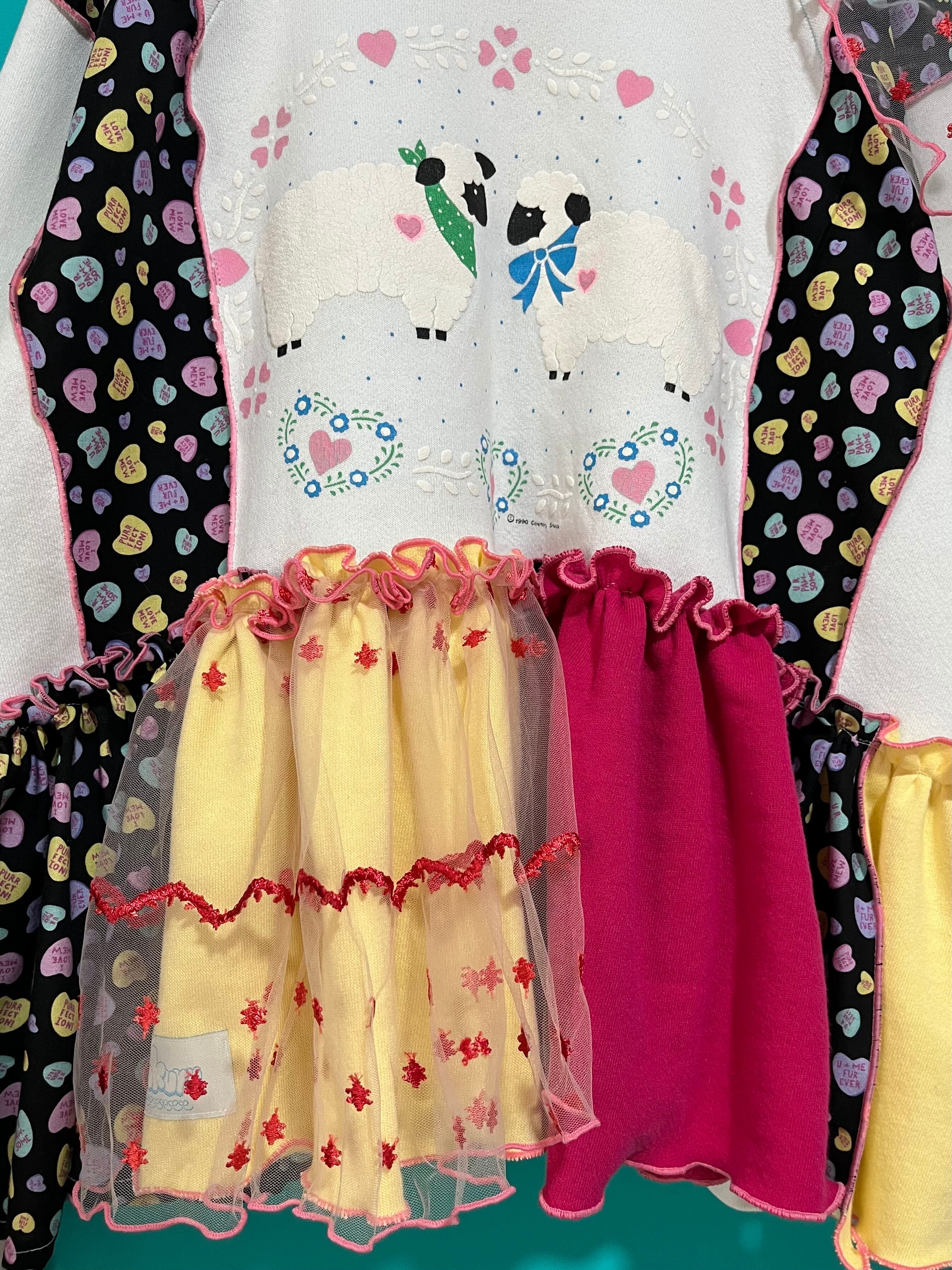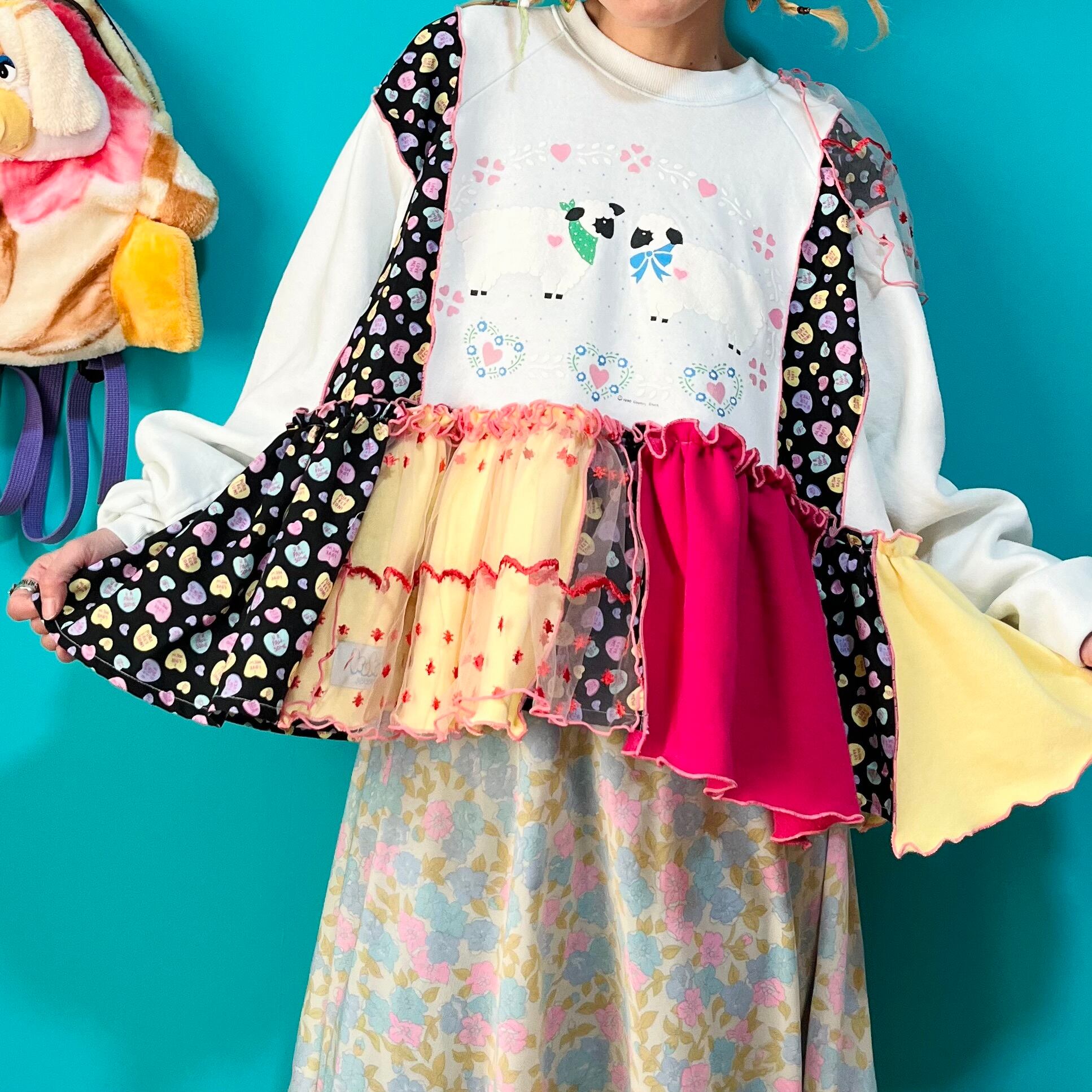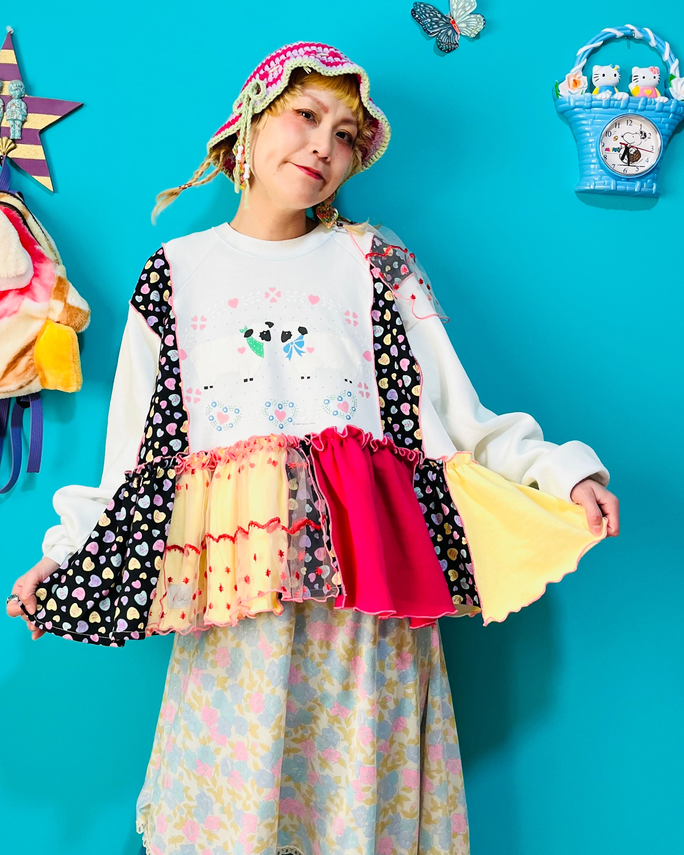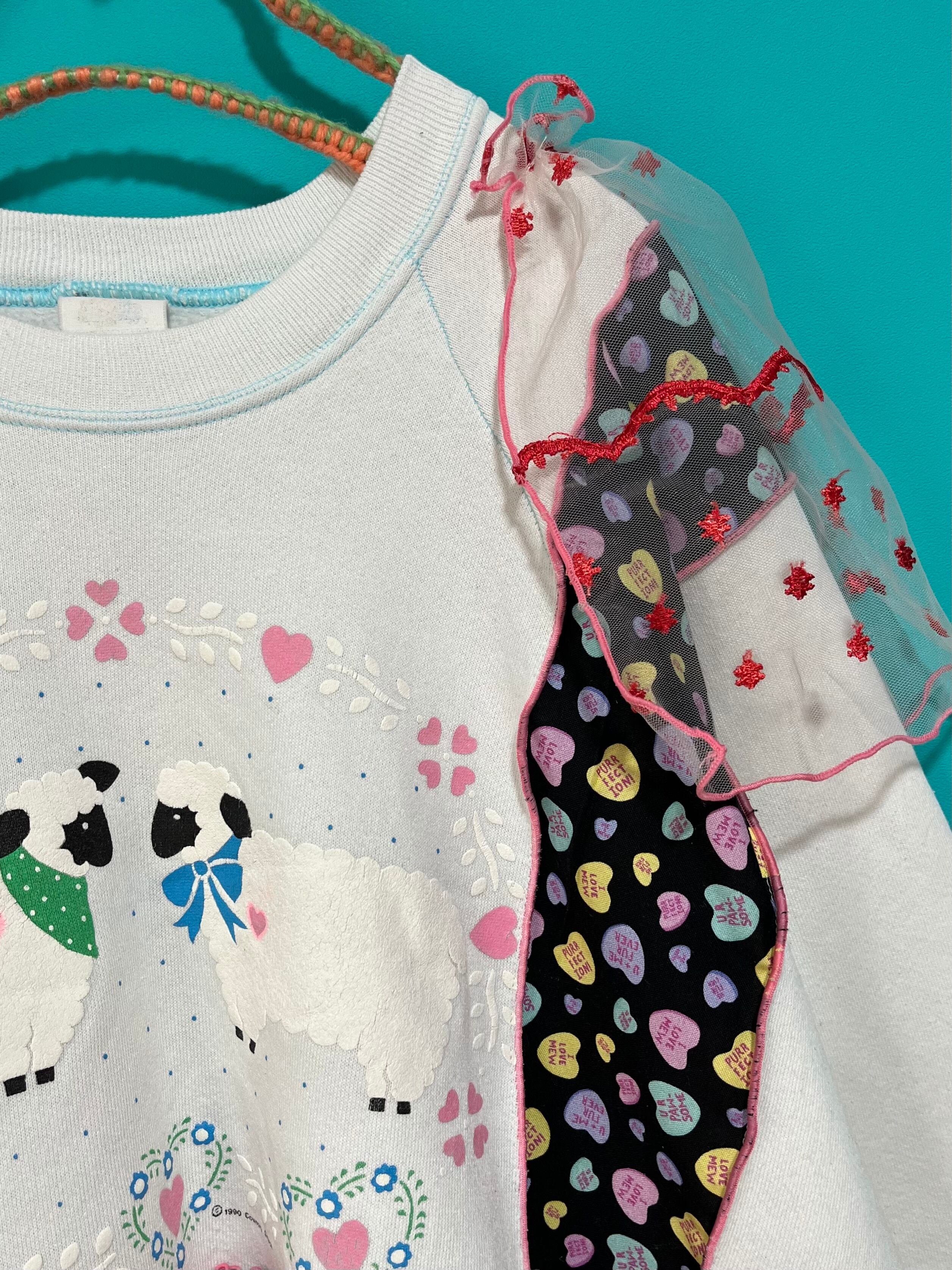 ガーリーなひつじさんスウェットにハート柄を混ぜ込んで、背中にお花を縫い付けました。