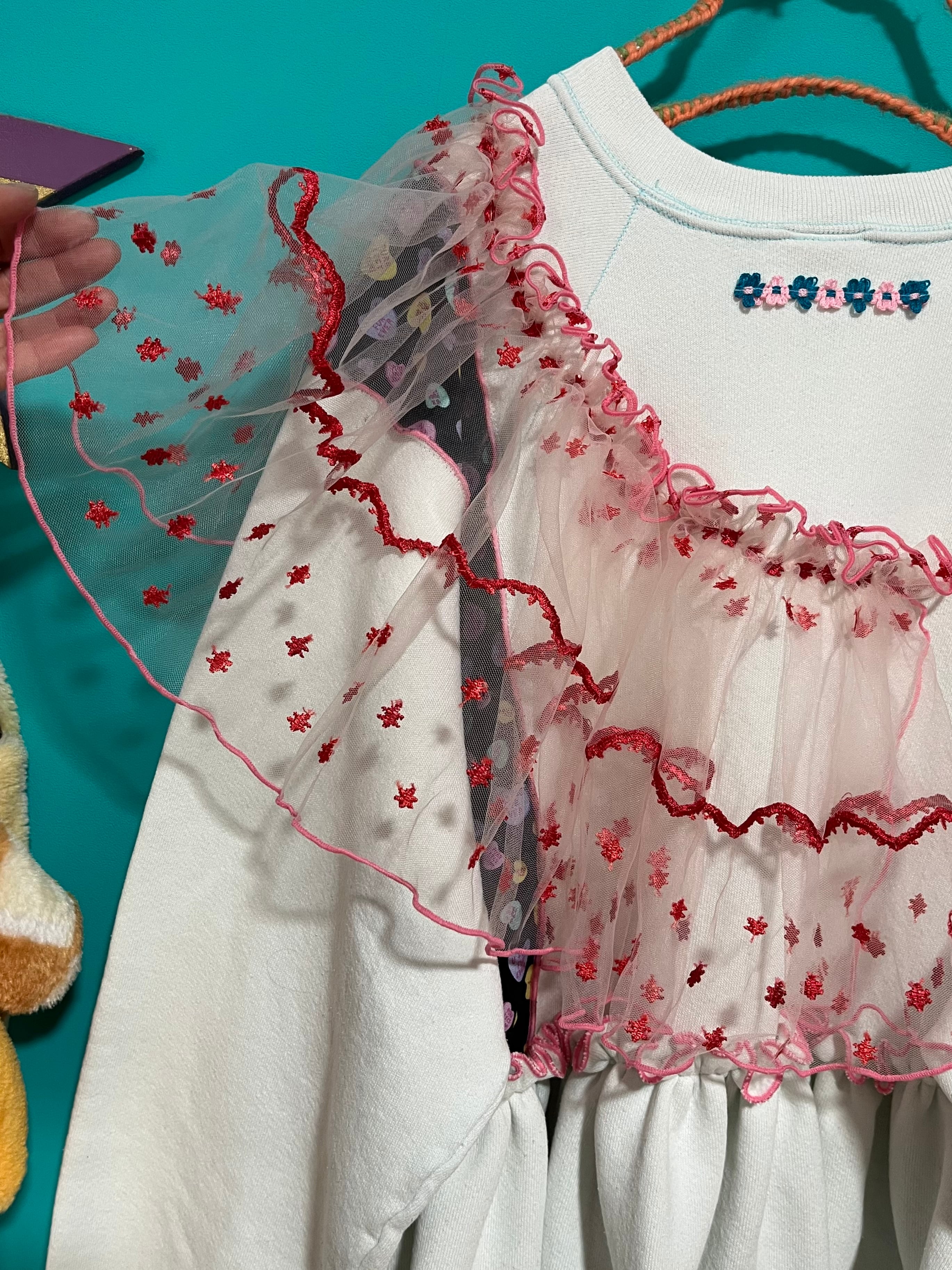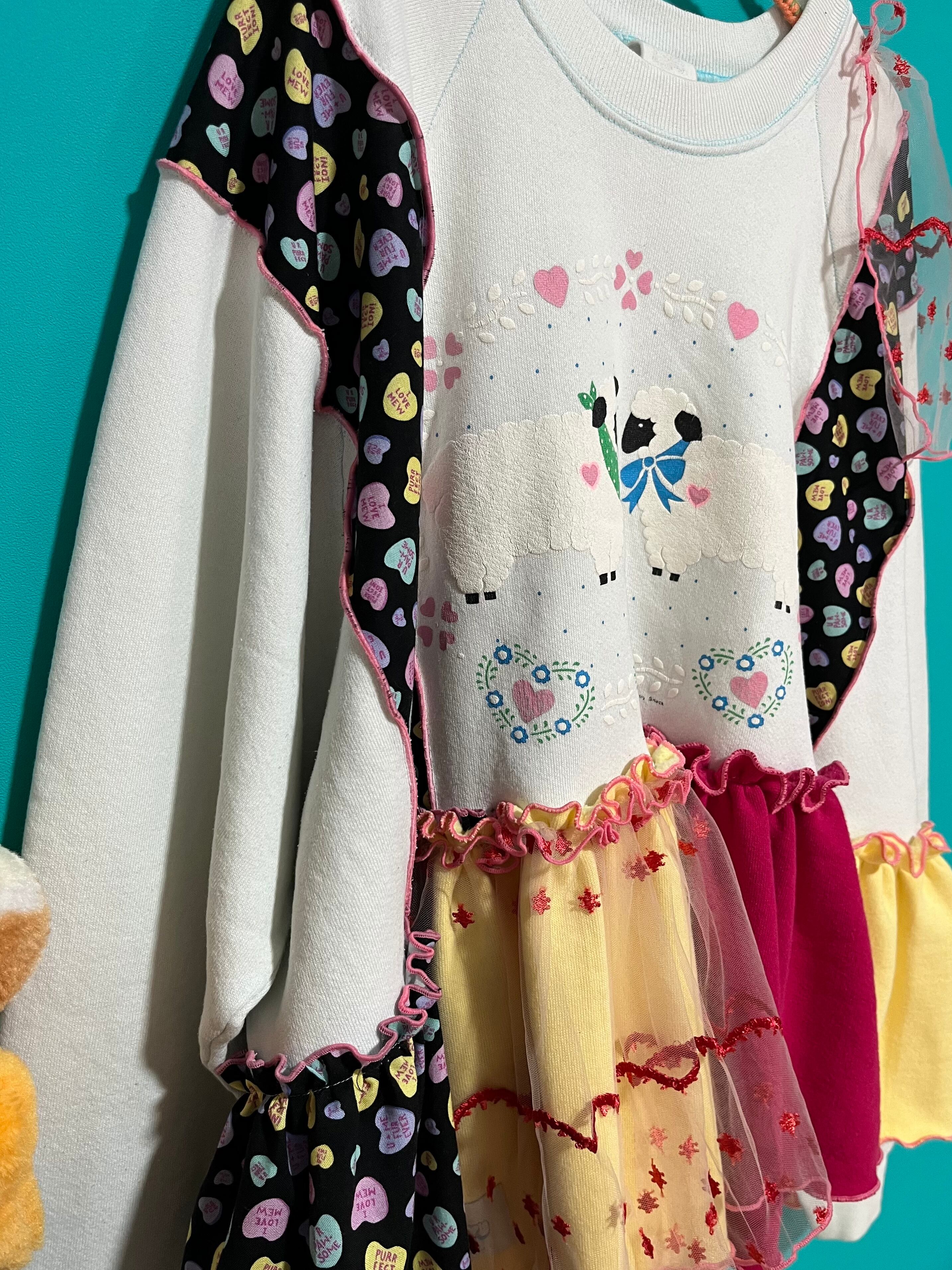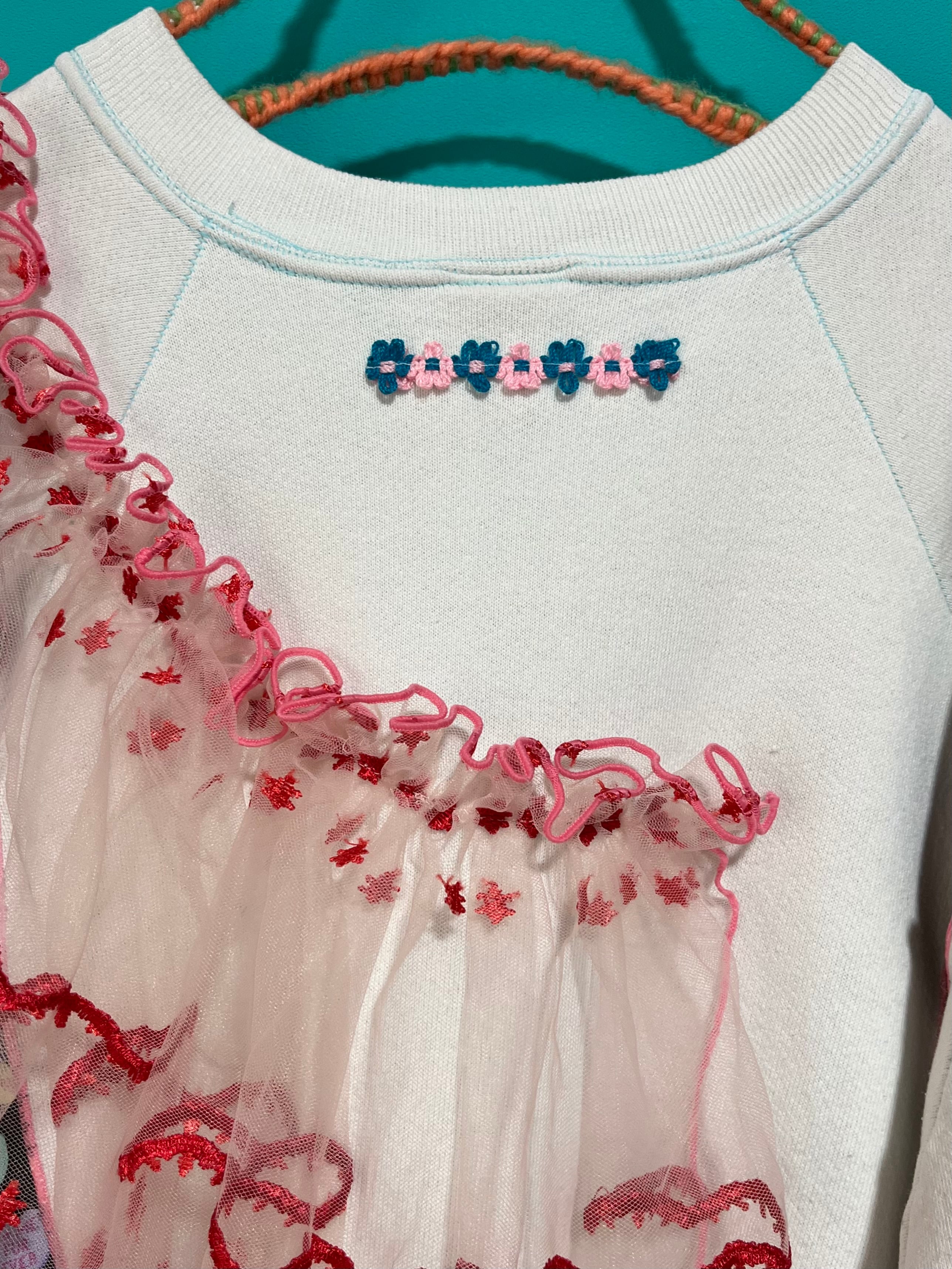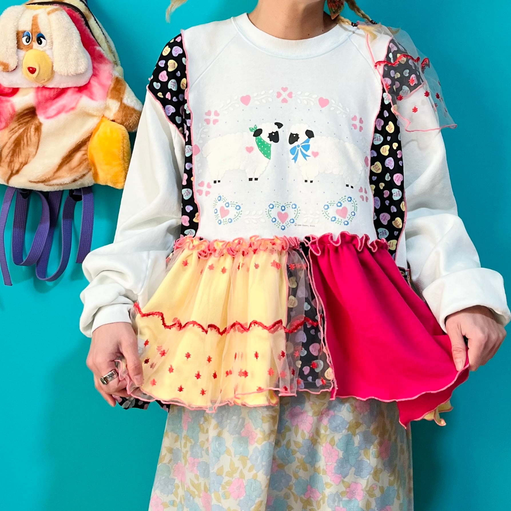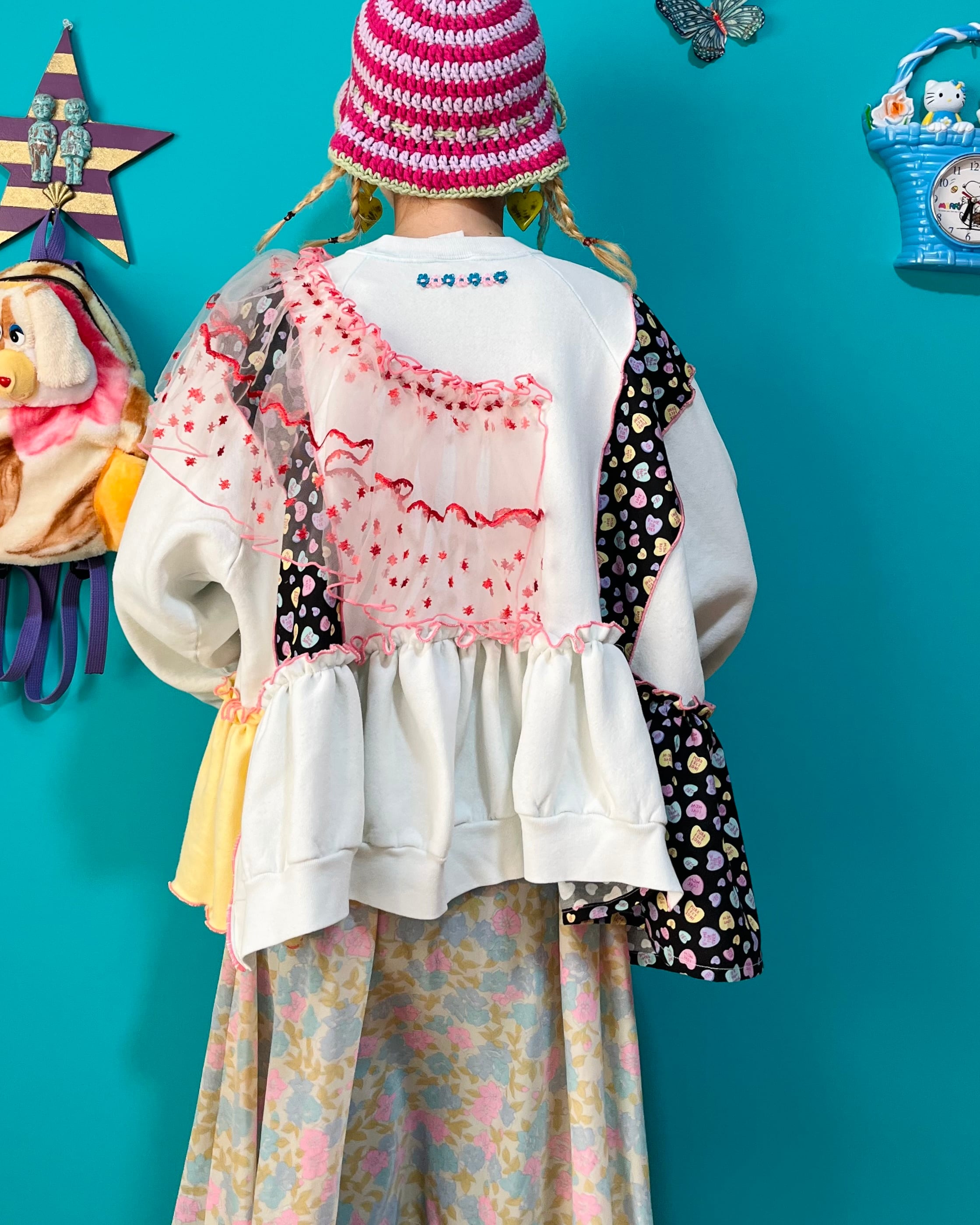ガーリーなひつじさんスウェットにハート柄を混ぜ込んで、背中にお花を縫い付けました。