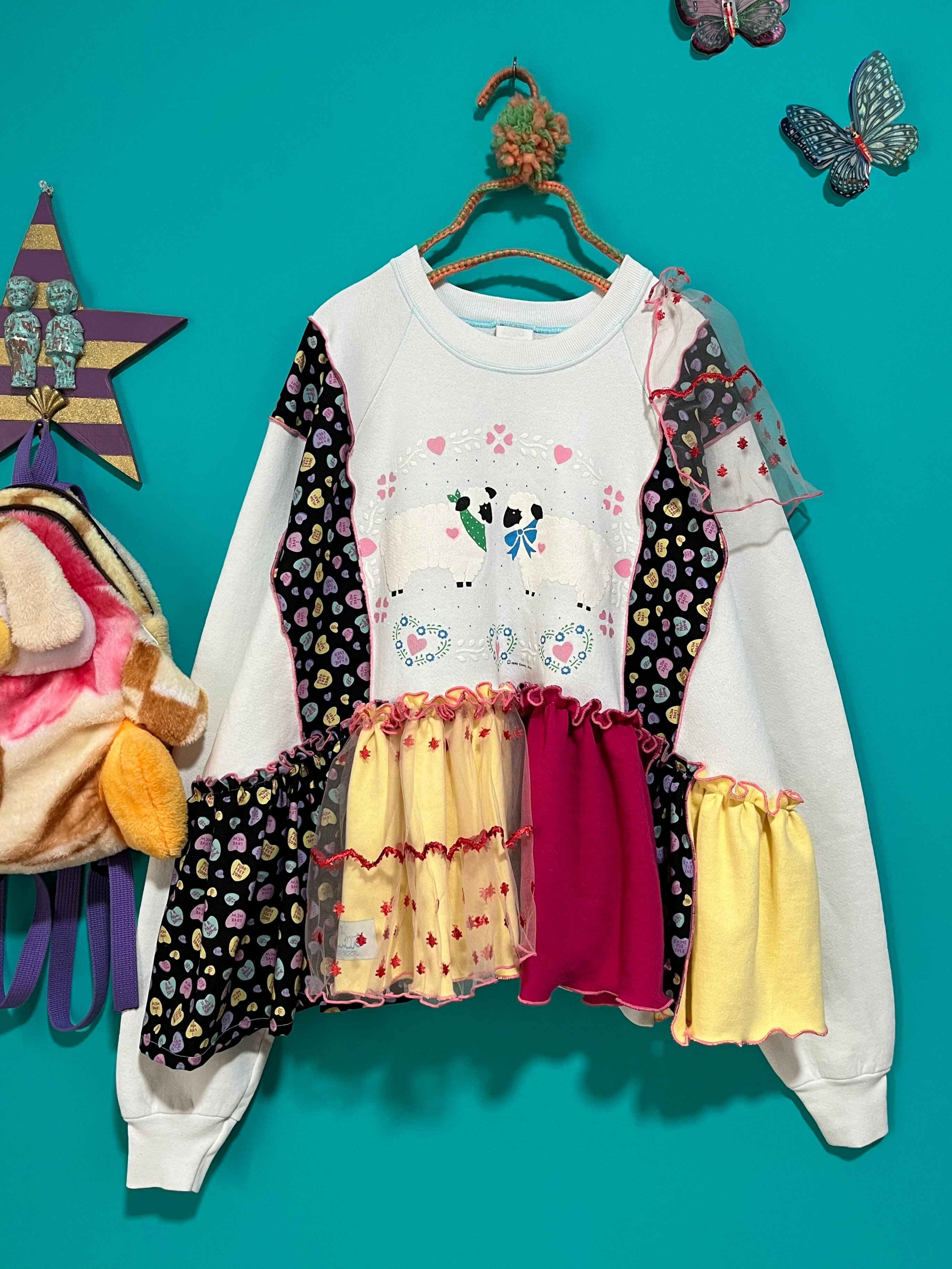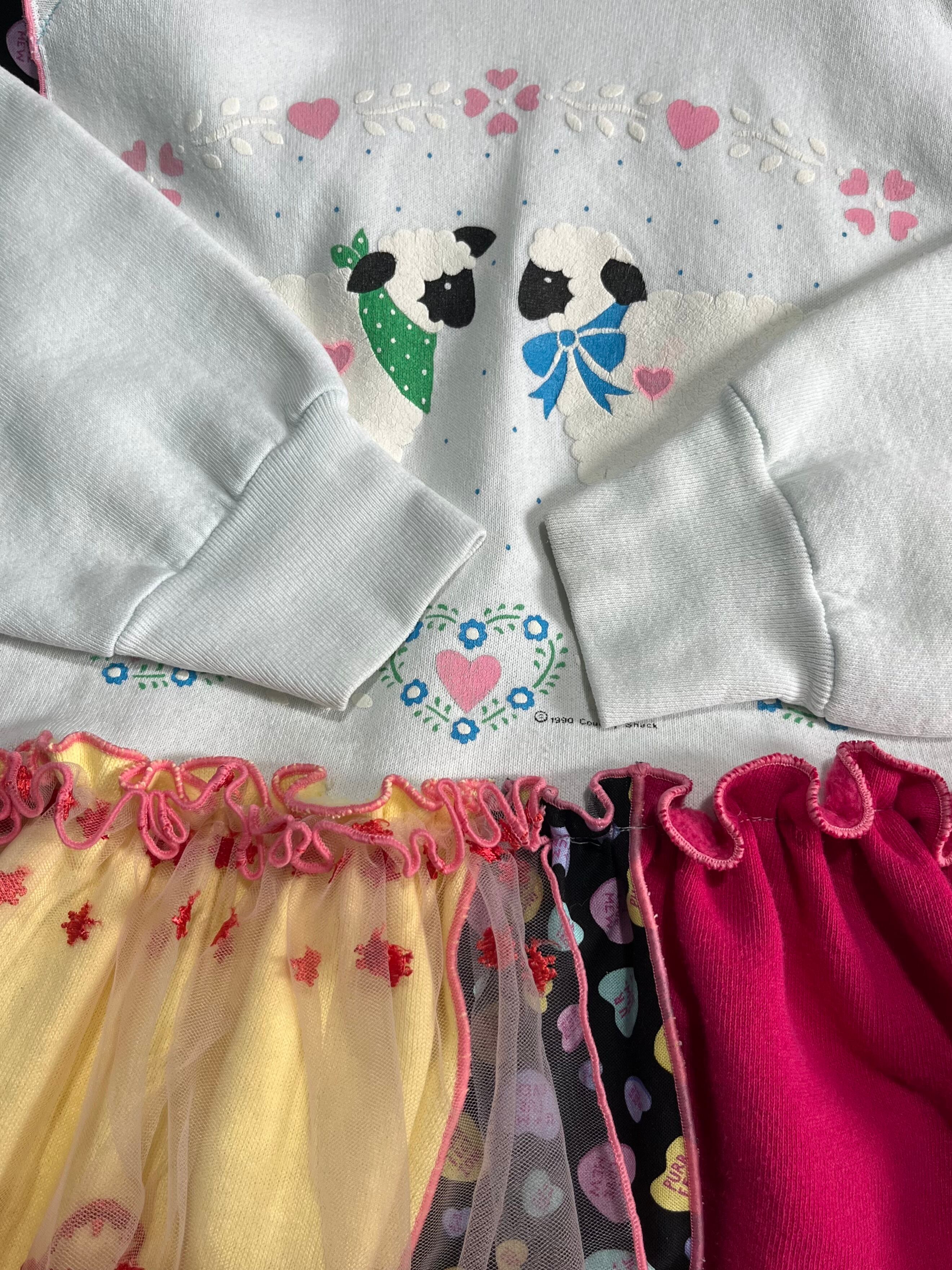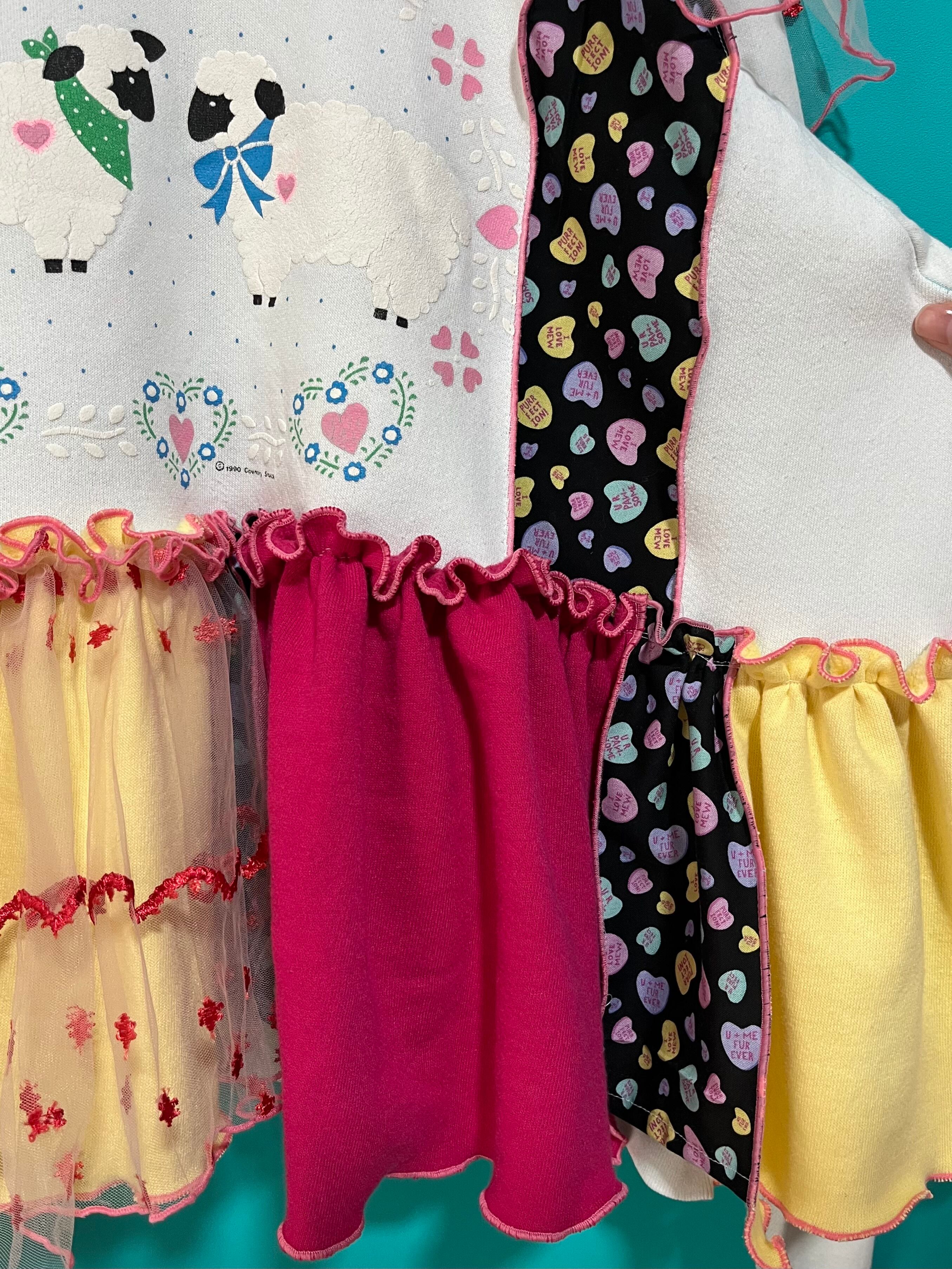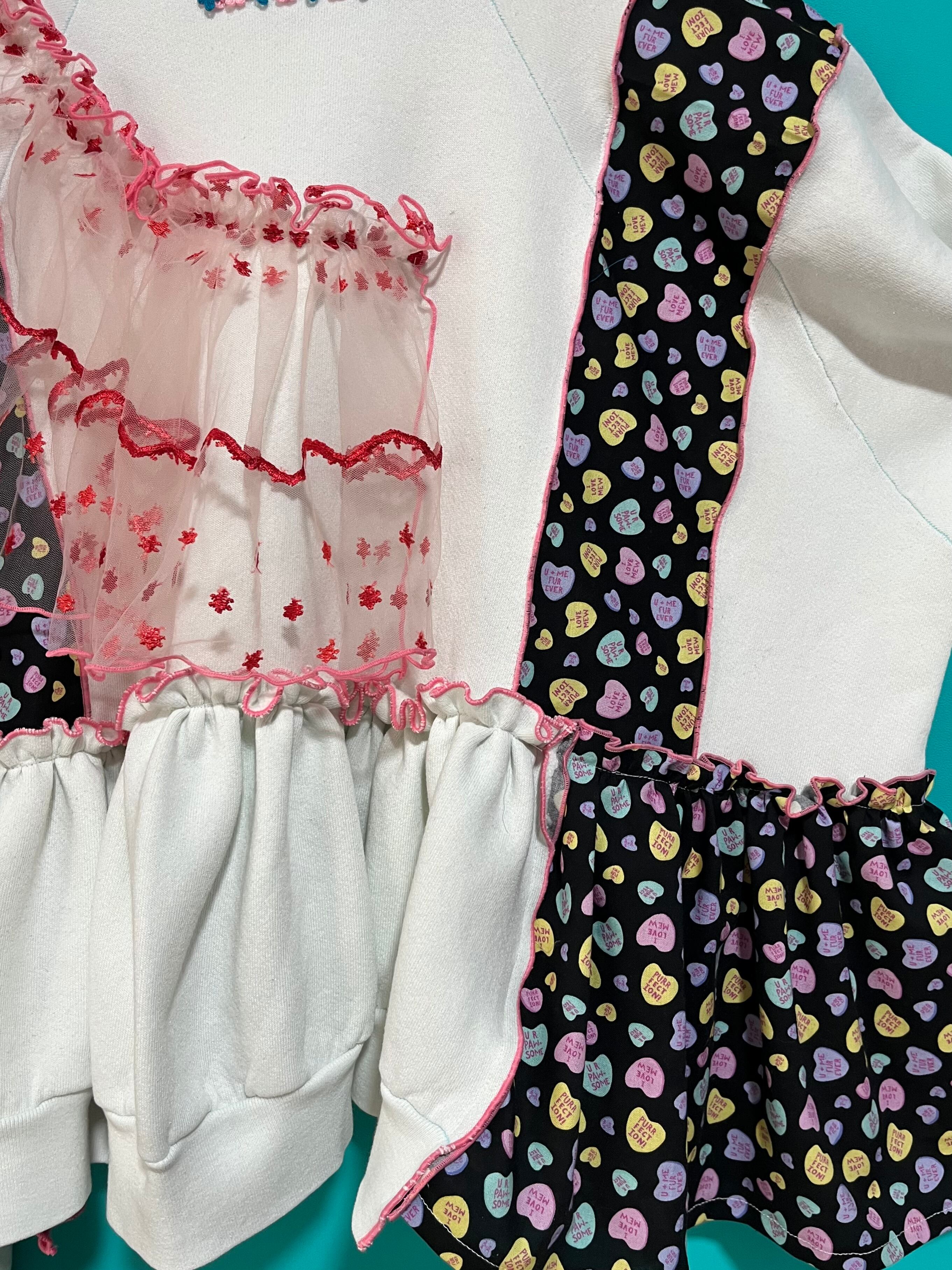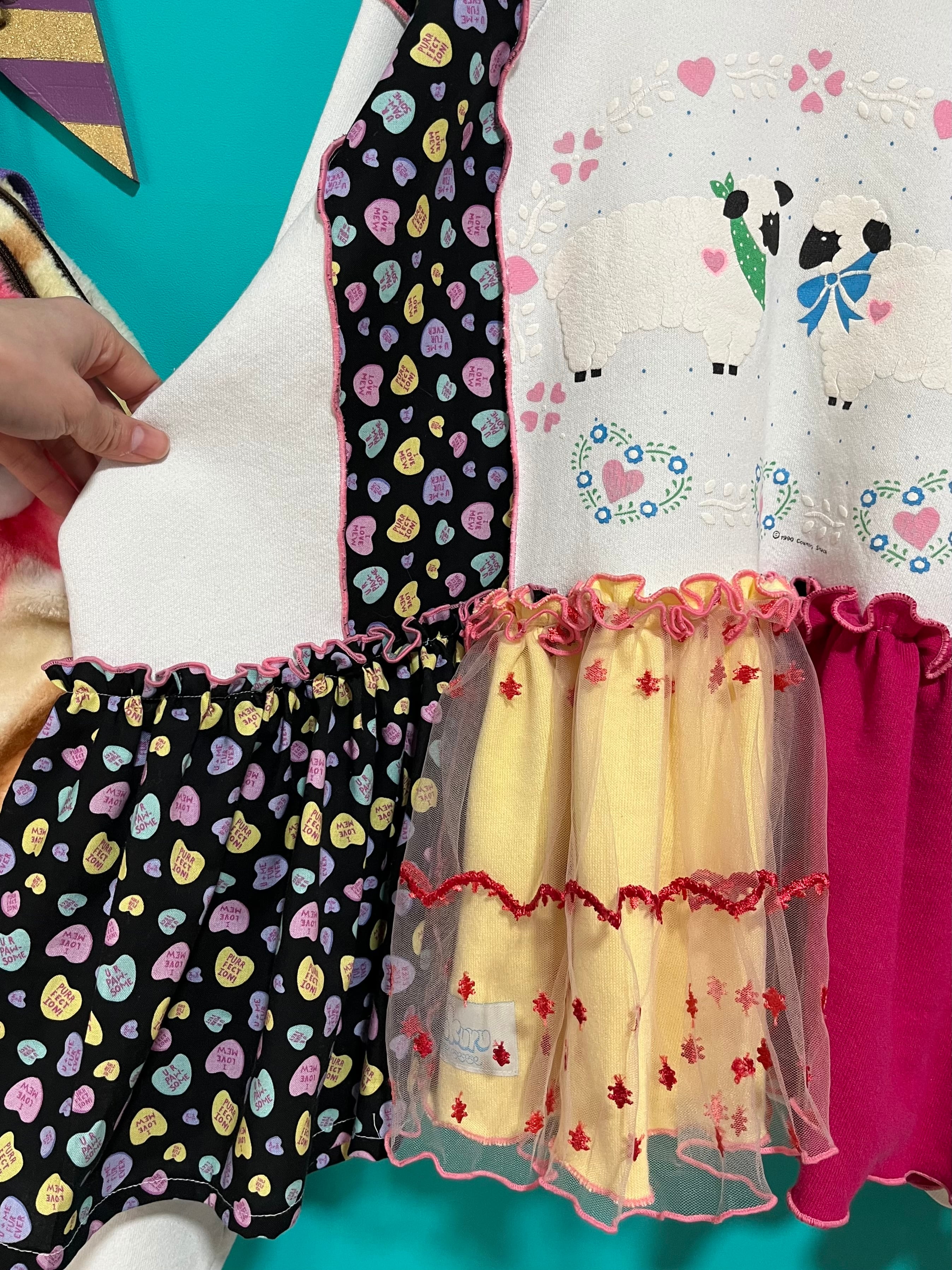 ガーリーなひつじさんスウェットにハート柄を混ぜ込んで、背中にお花を縫い付けました。