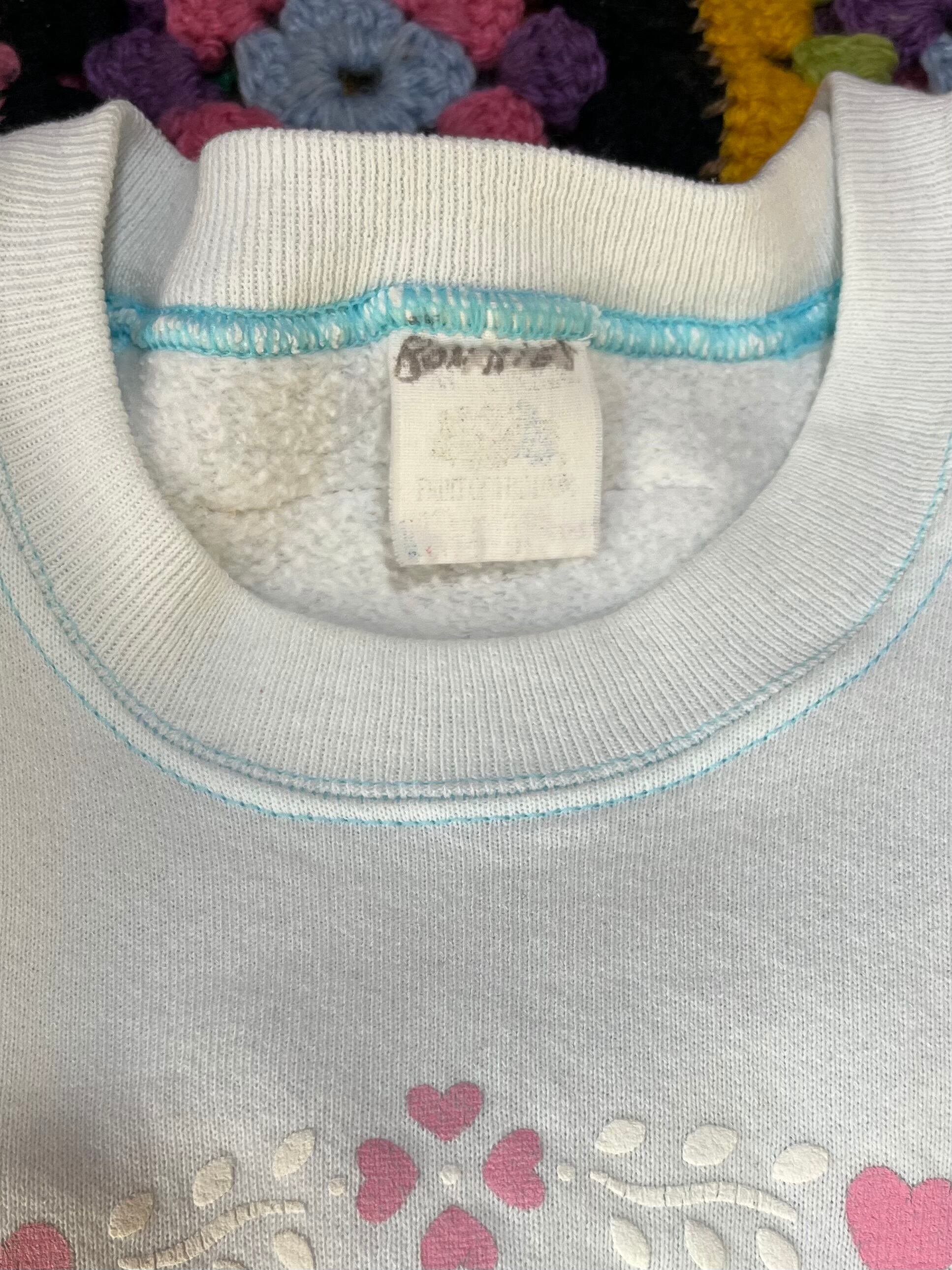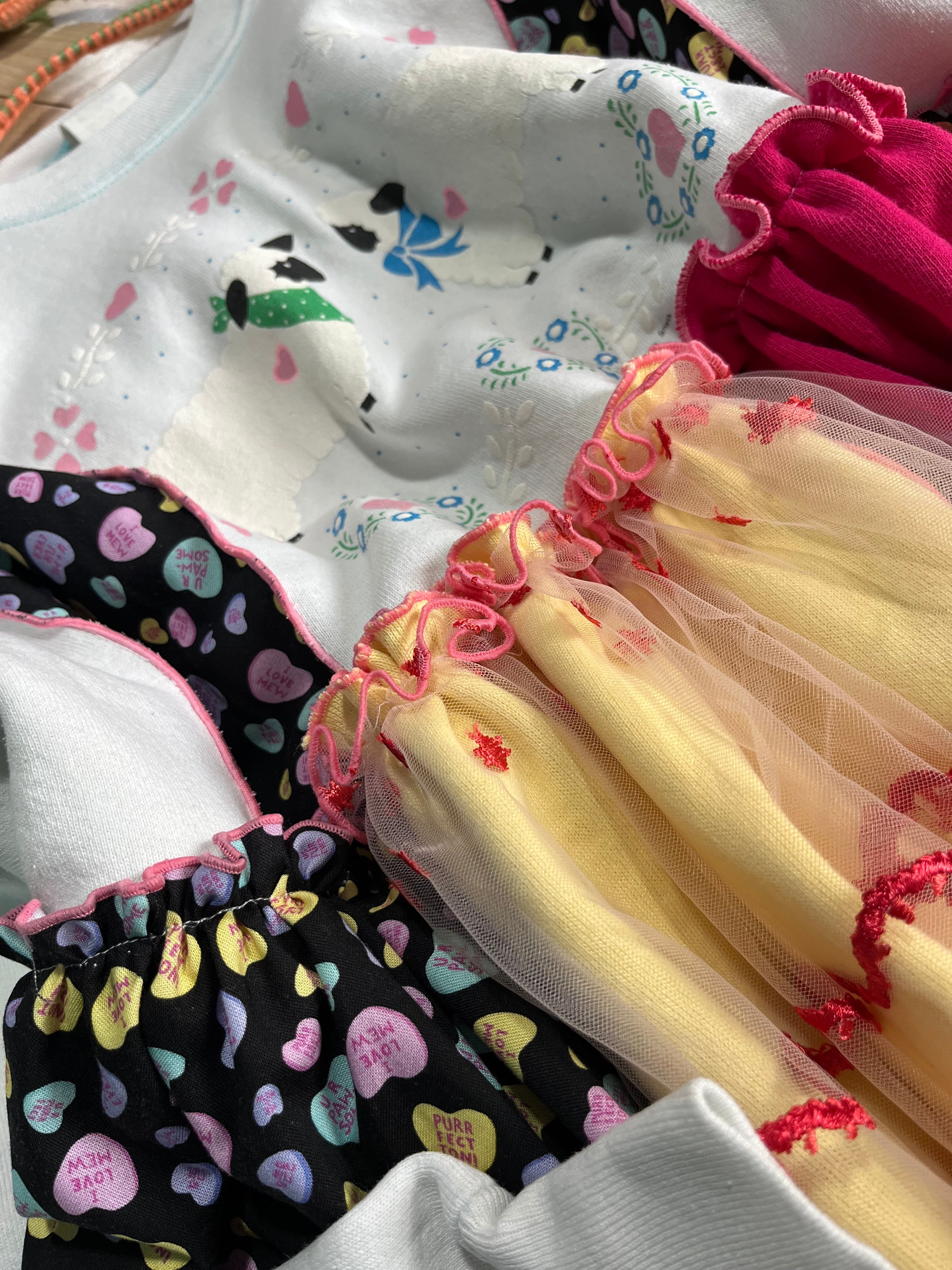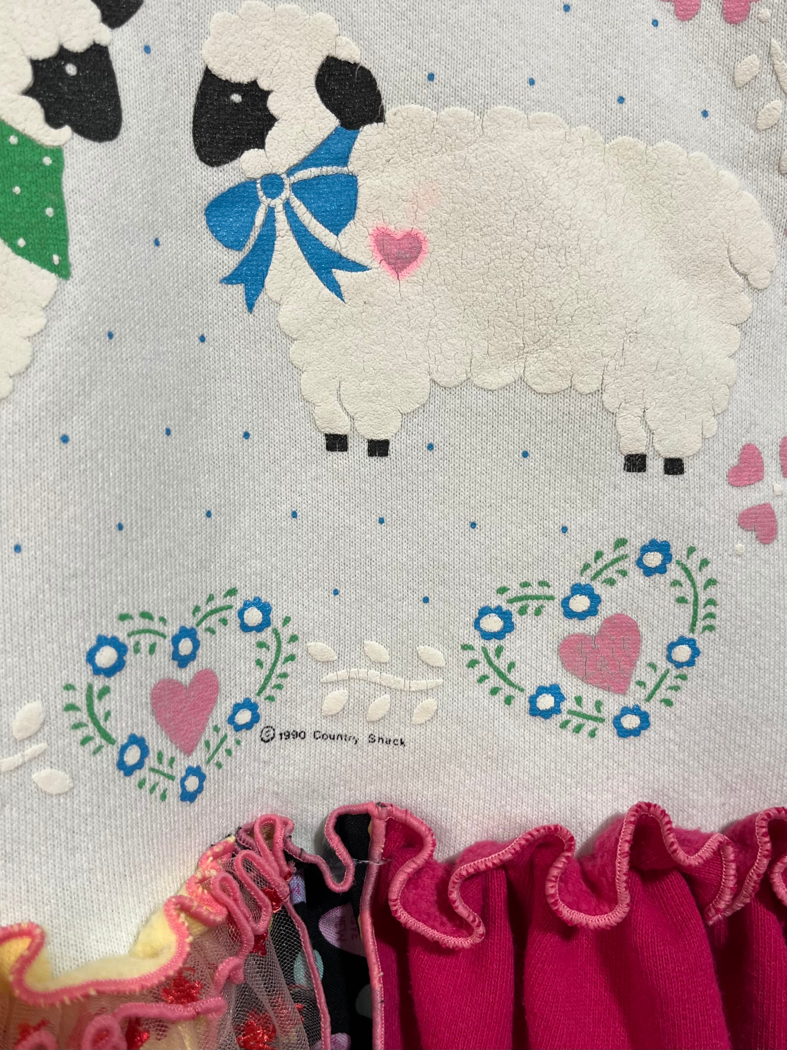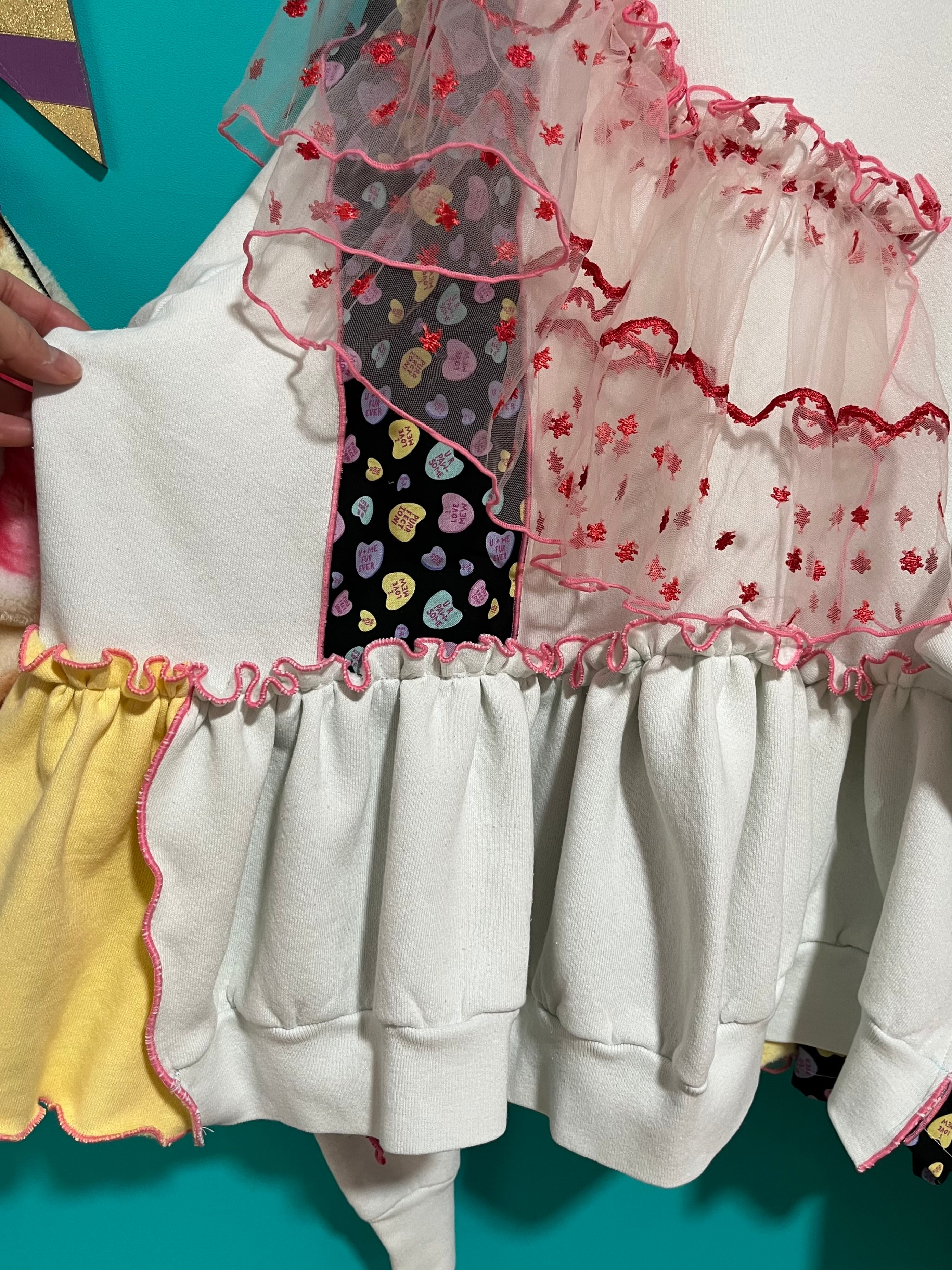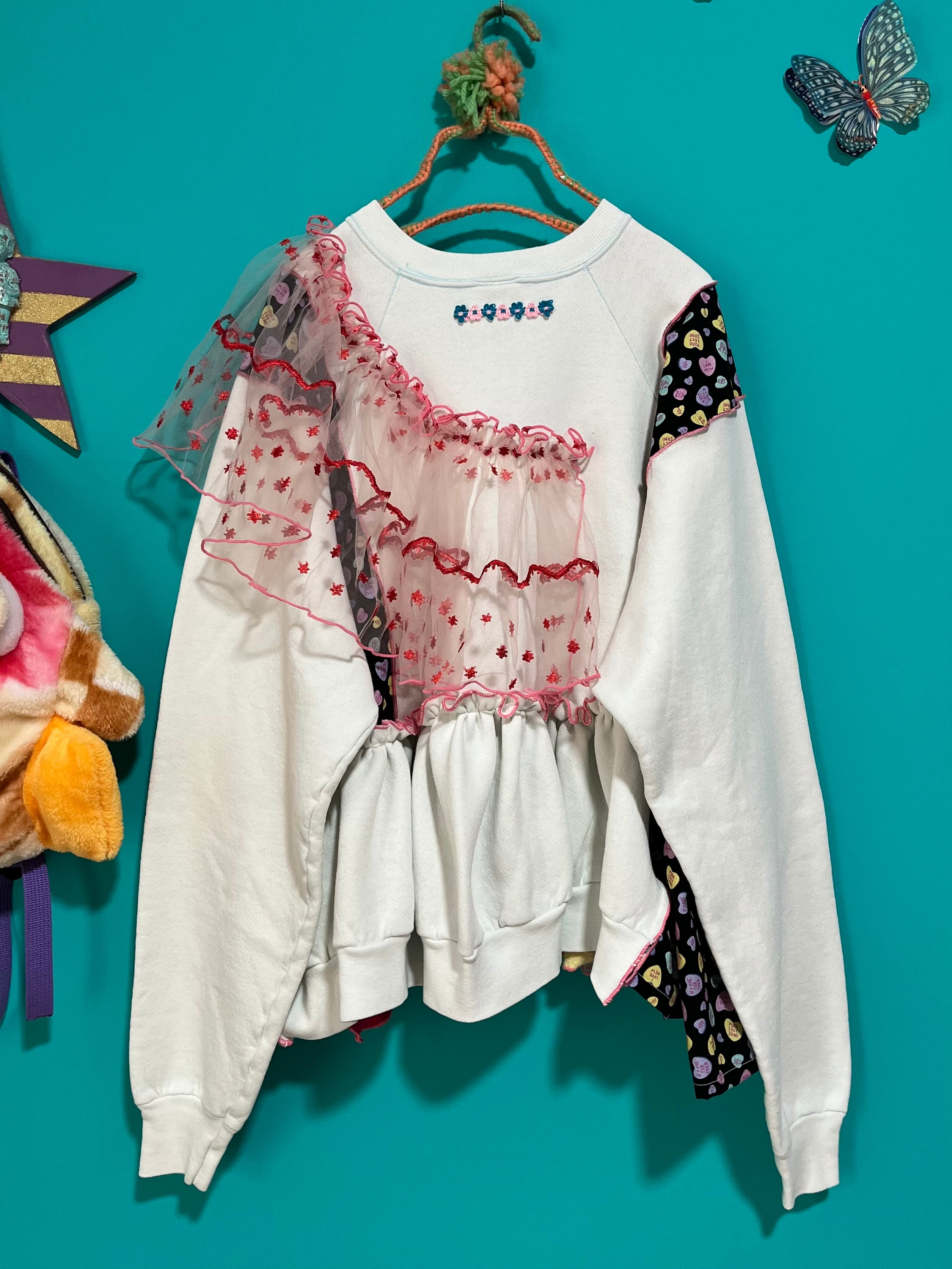 ガーリーなひつじさんスウェットにハート柄を混ぜ込んで、背中にお花を縫い付けました。
