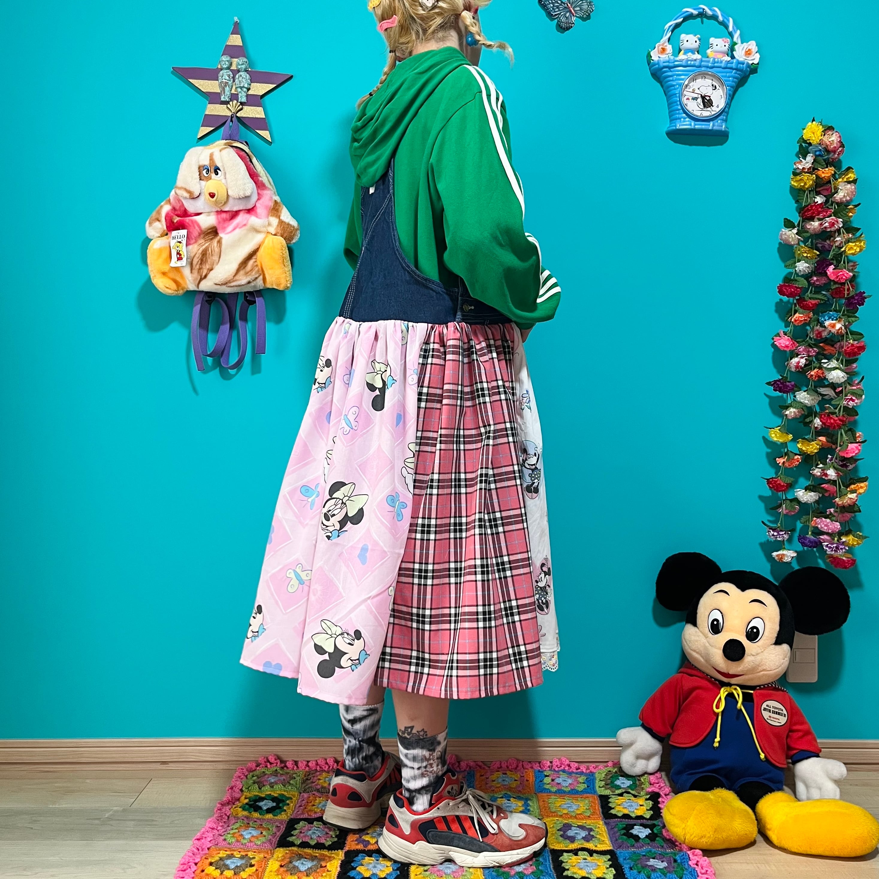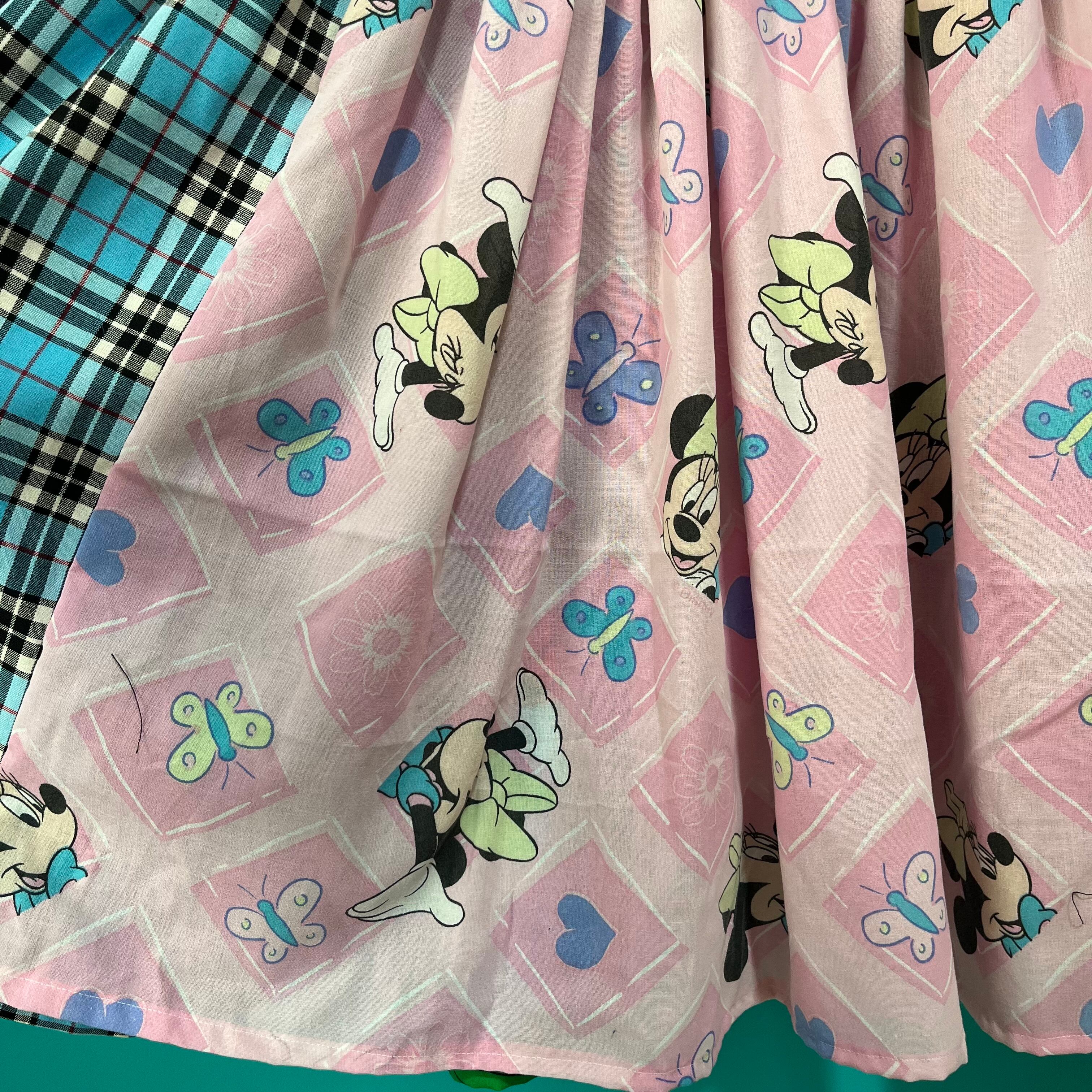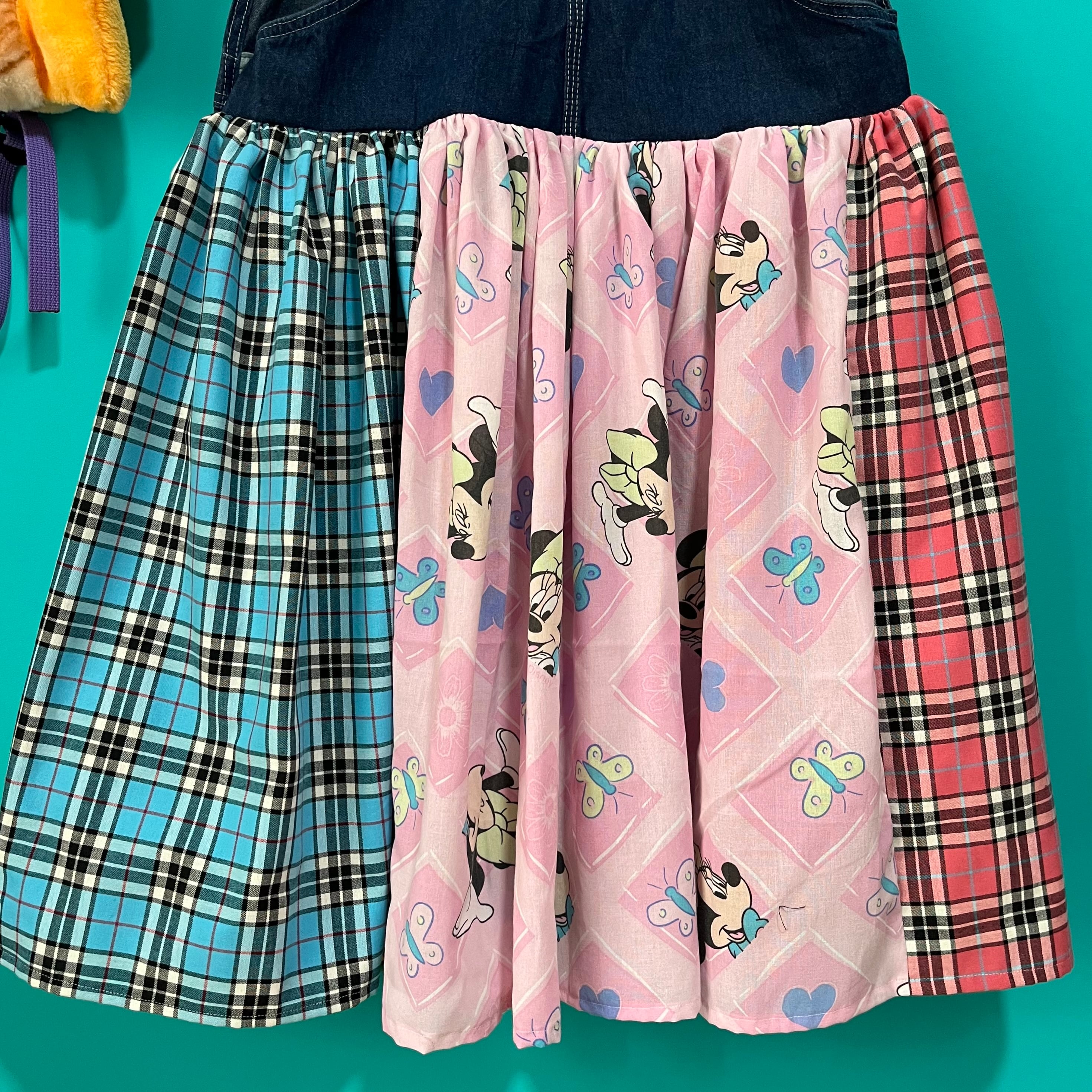 水色とピンクのタータンチェックを組み合わせたジャンパースカートです。