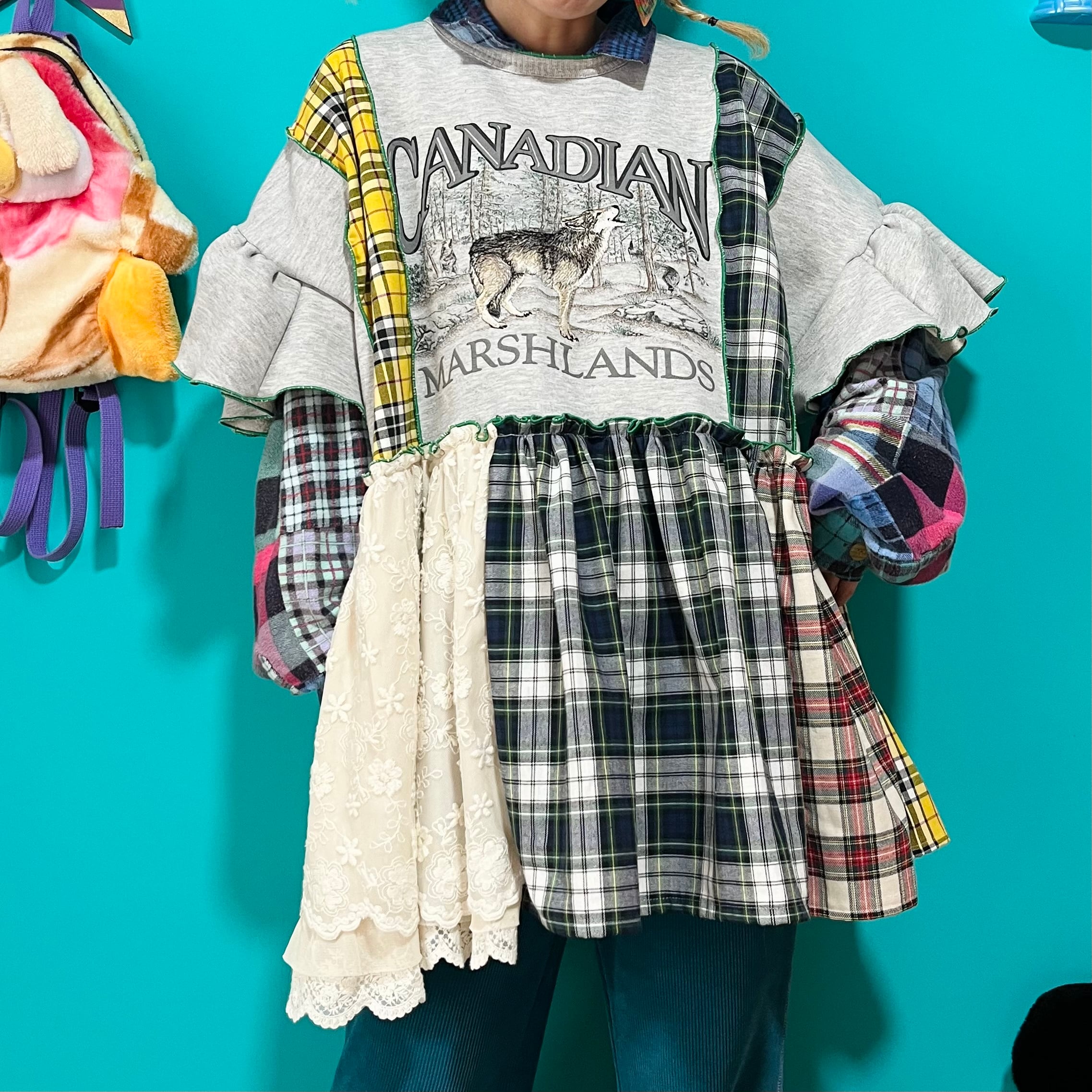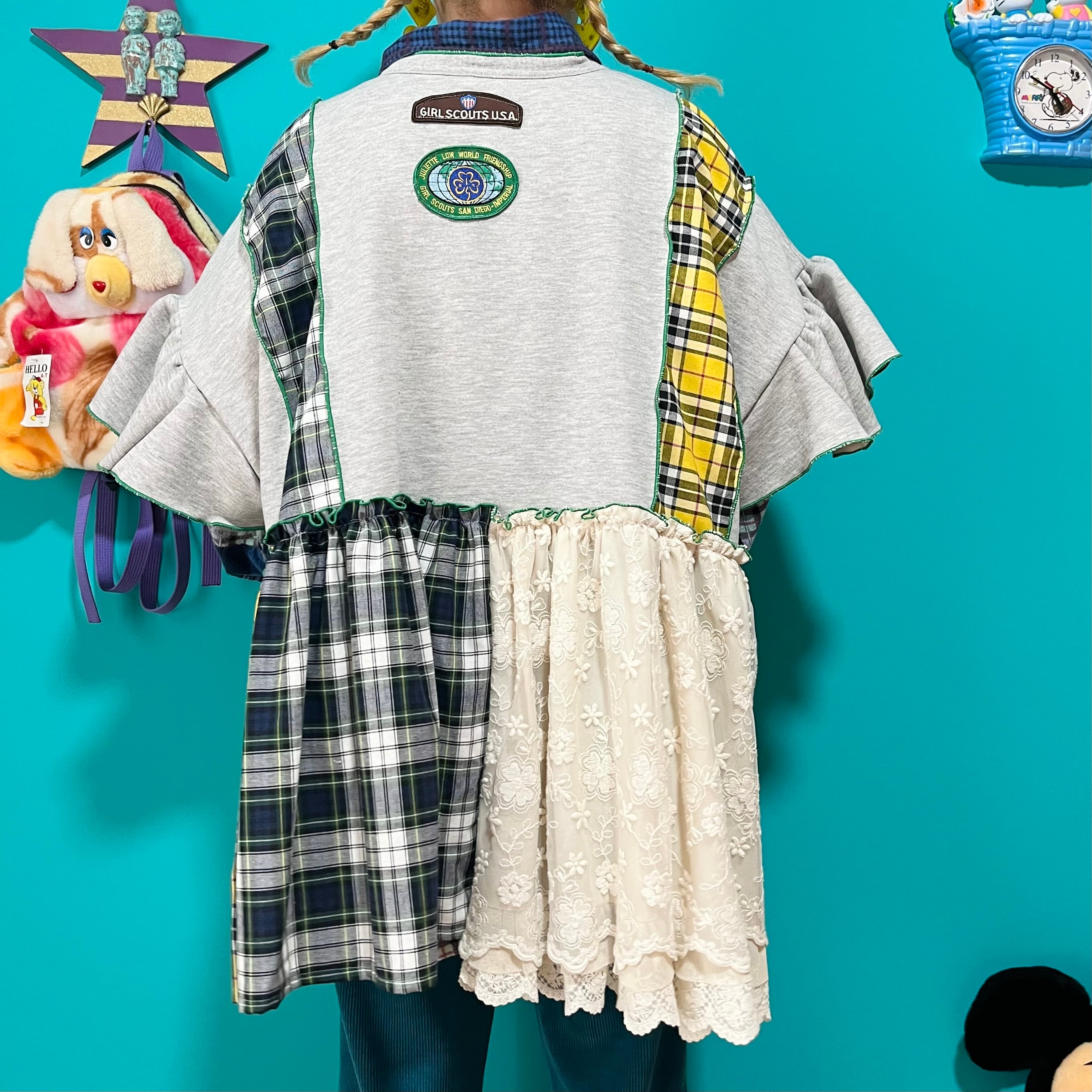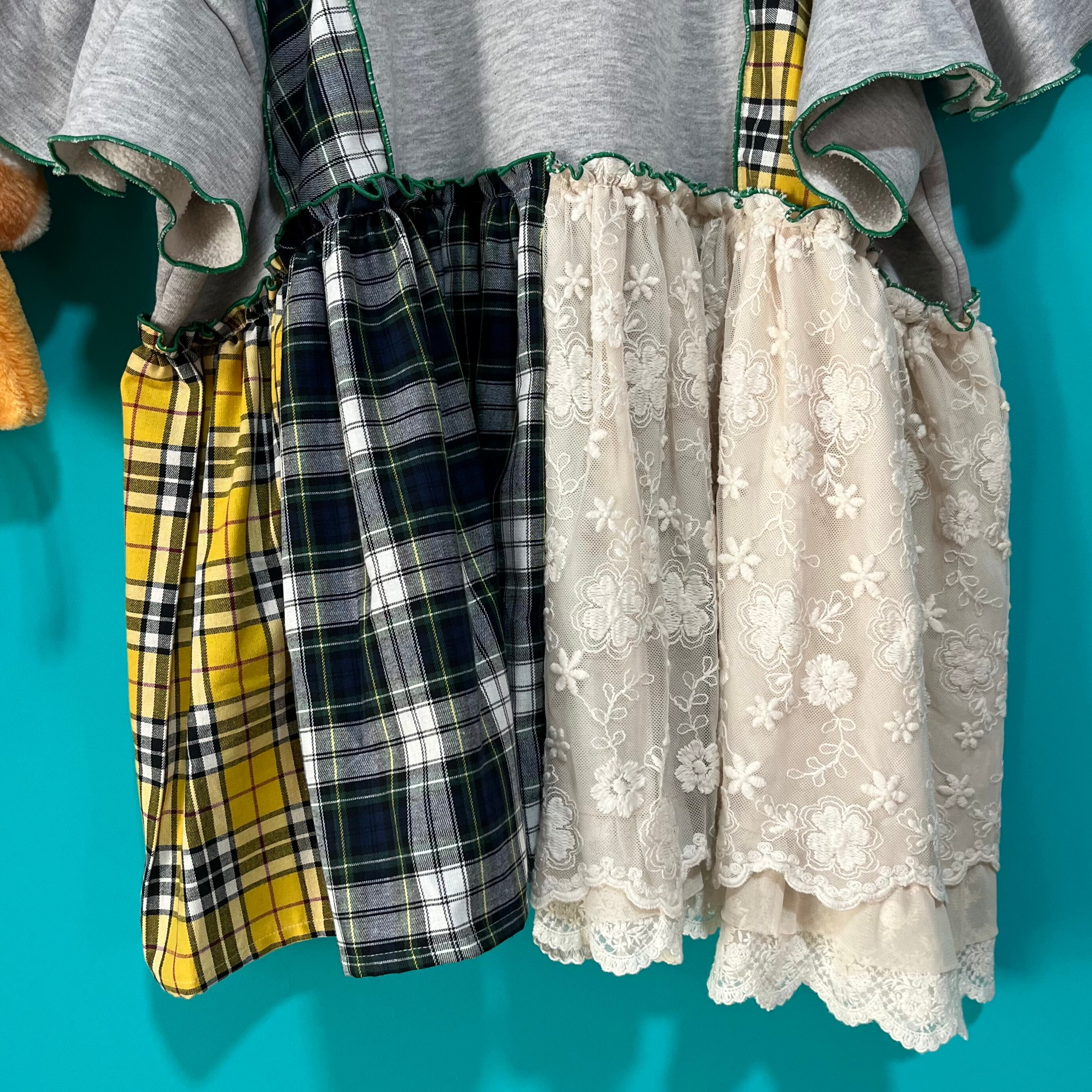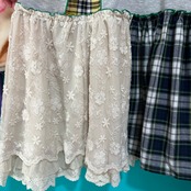 白いレースやチェック柄をごちゃ混ぜにドッキングしました。