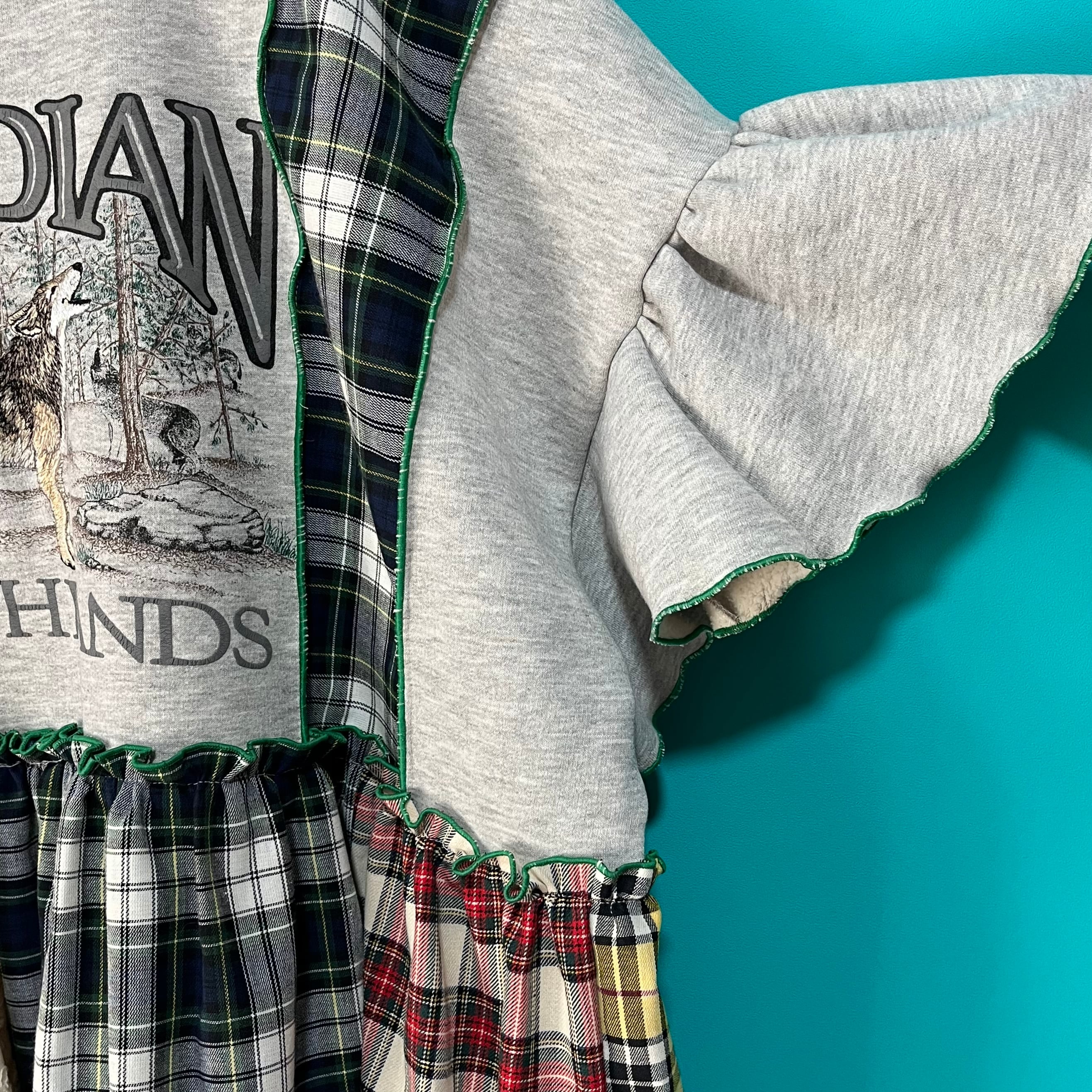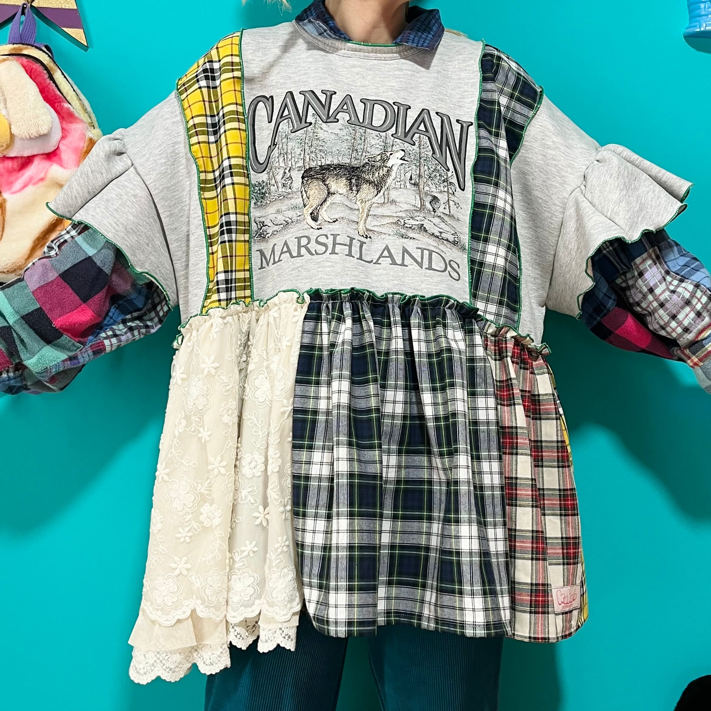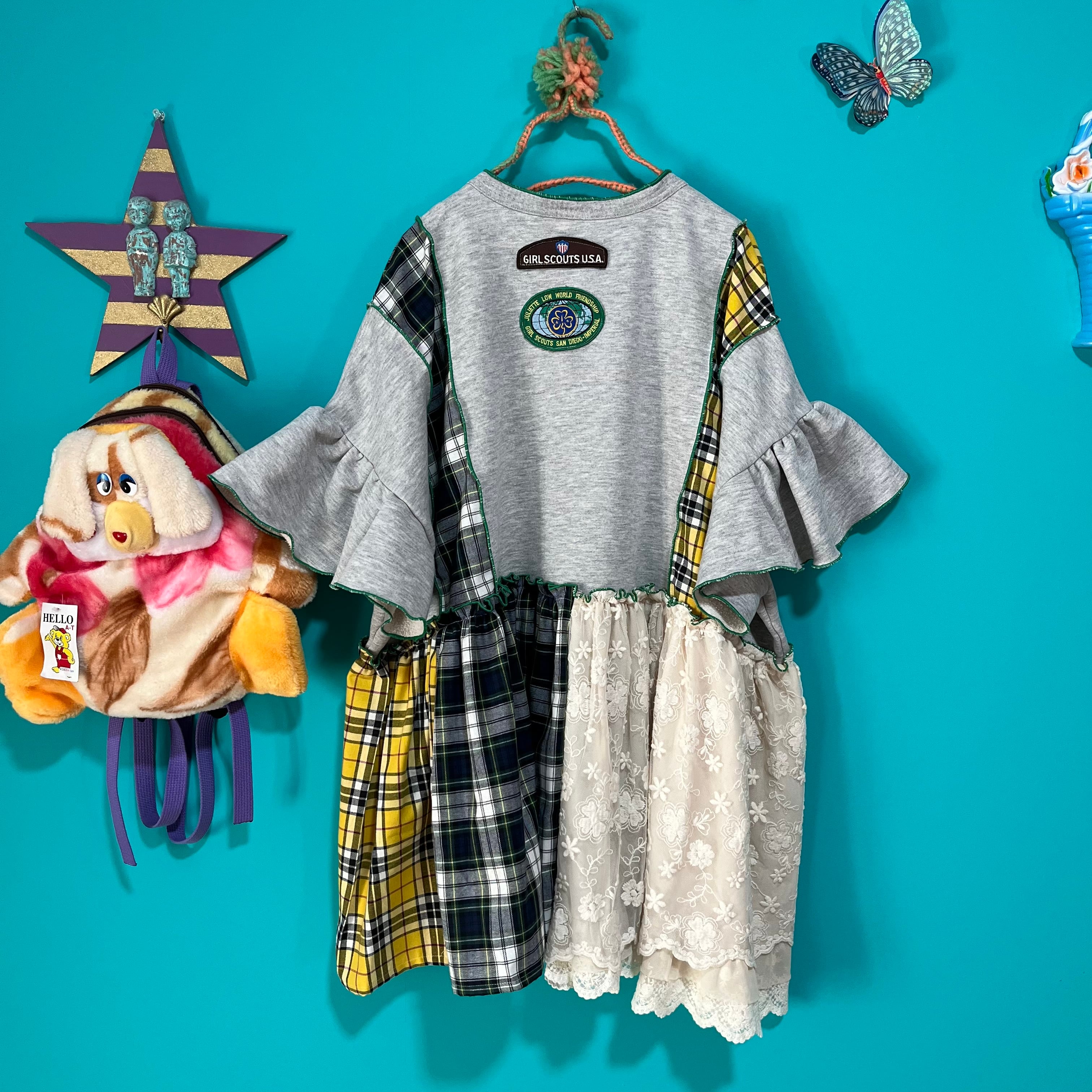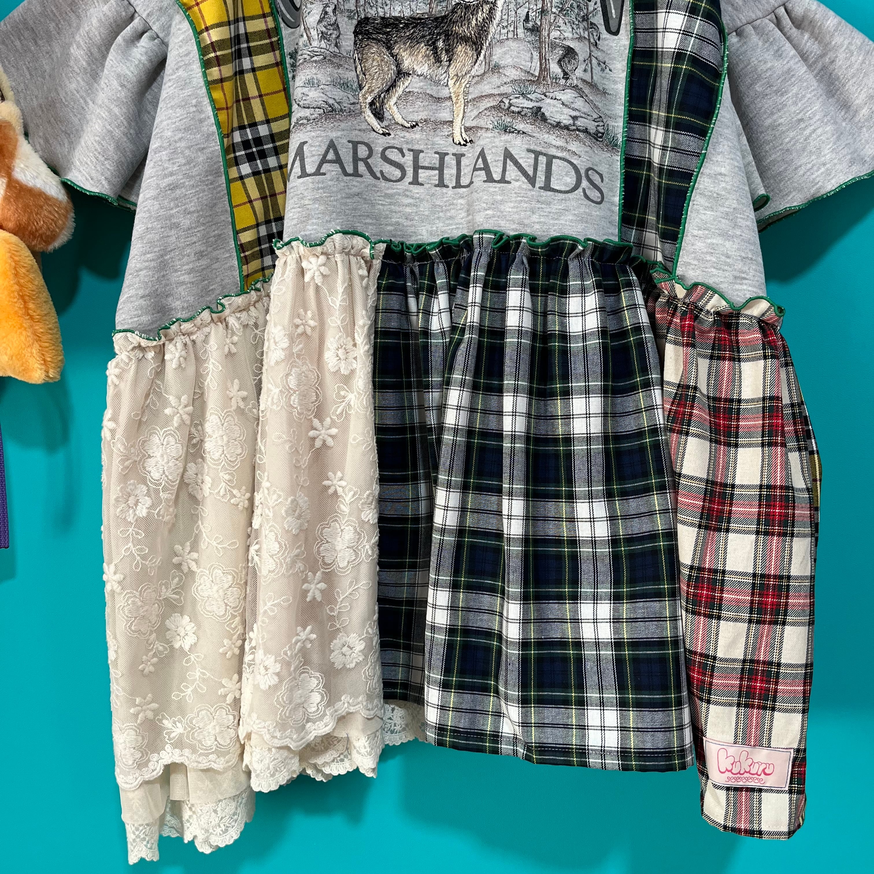 白いレースやチェック柄をごちゃ混ぜにドッキングしました。