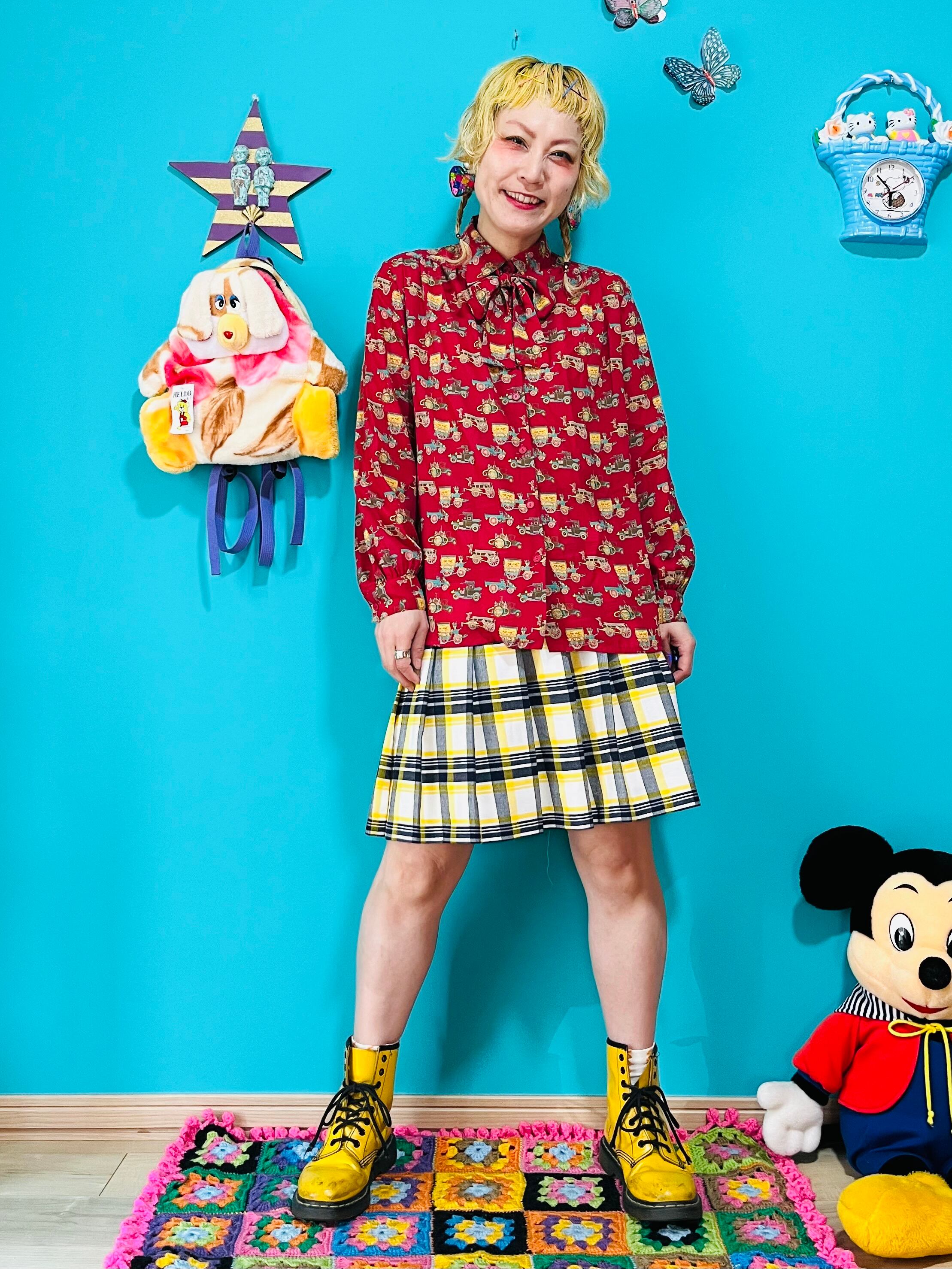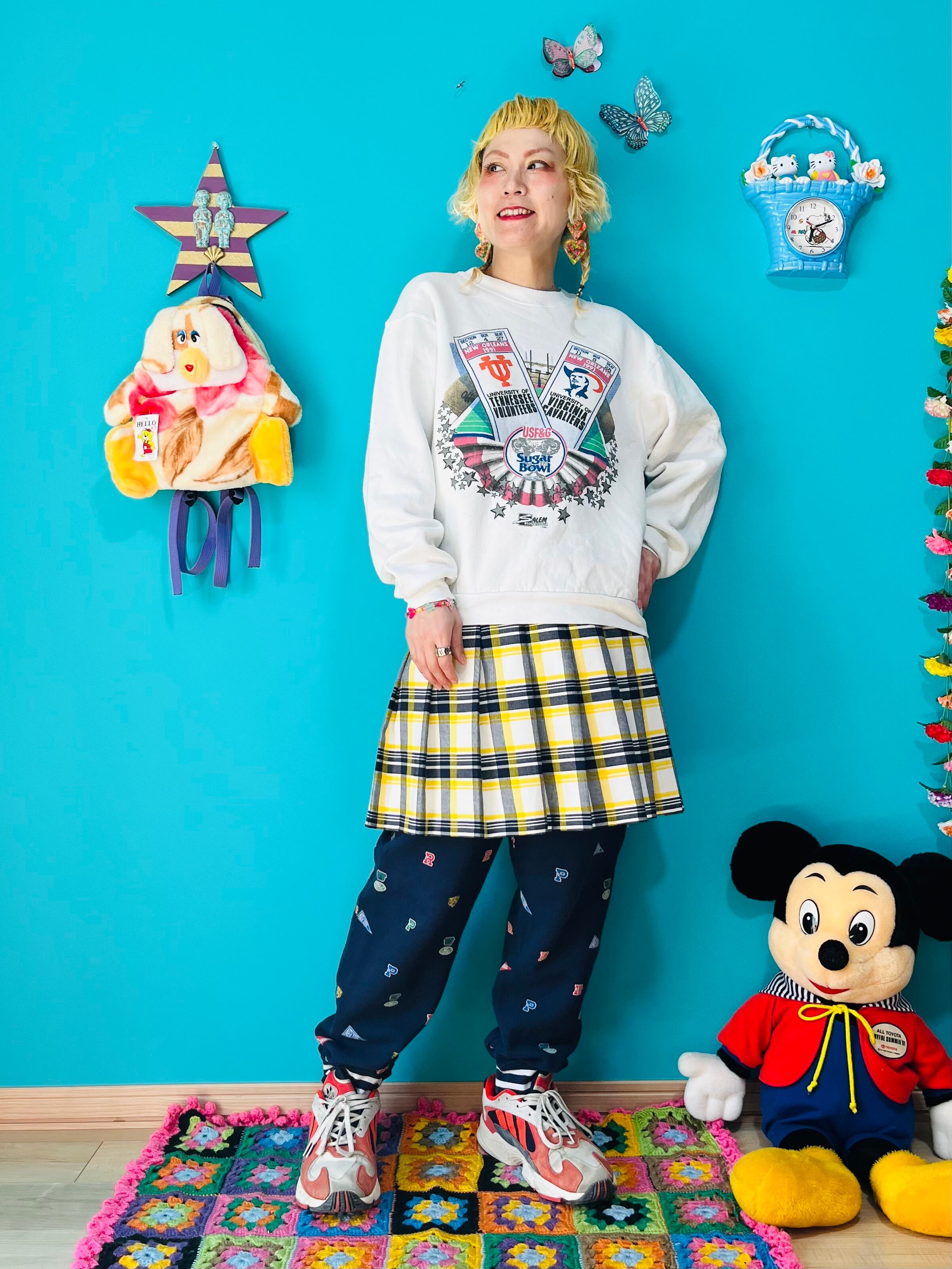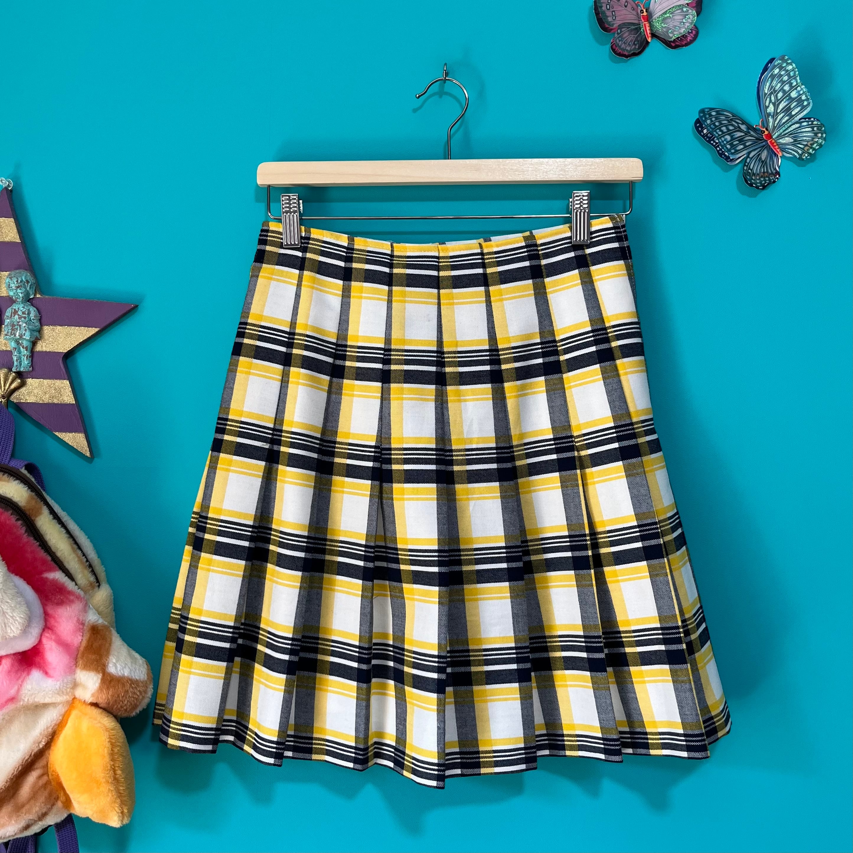 イエローチェックのプリーツミニスカートです。