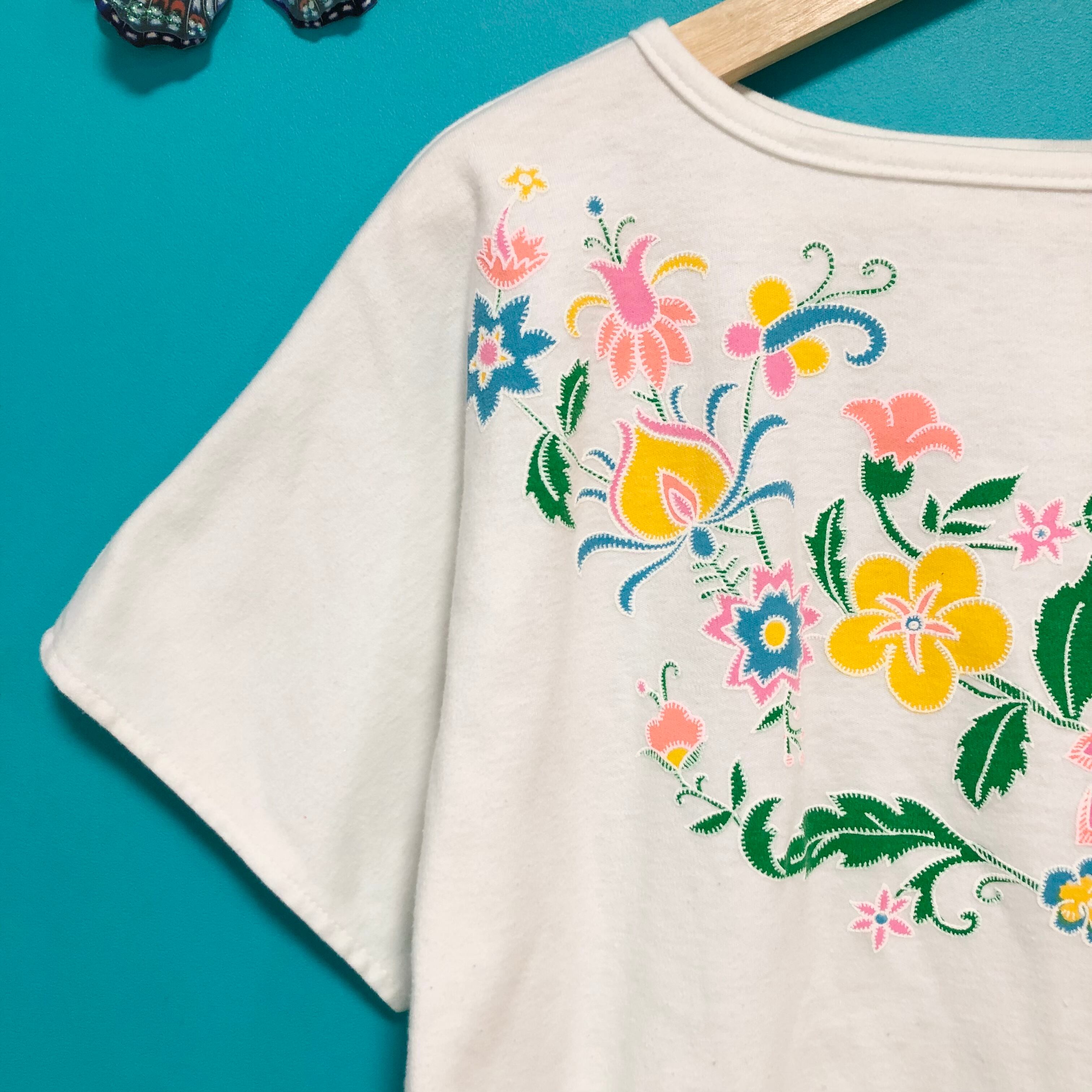 カラフルなお花がプリントされたアメリカ製のTシャツです。