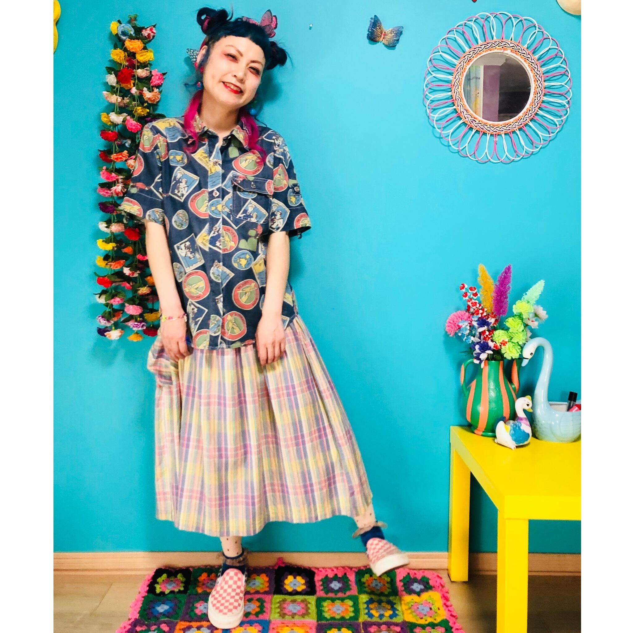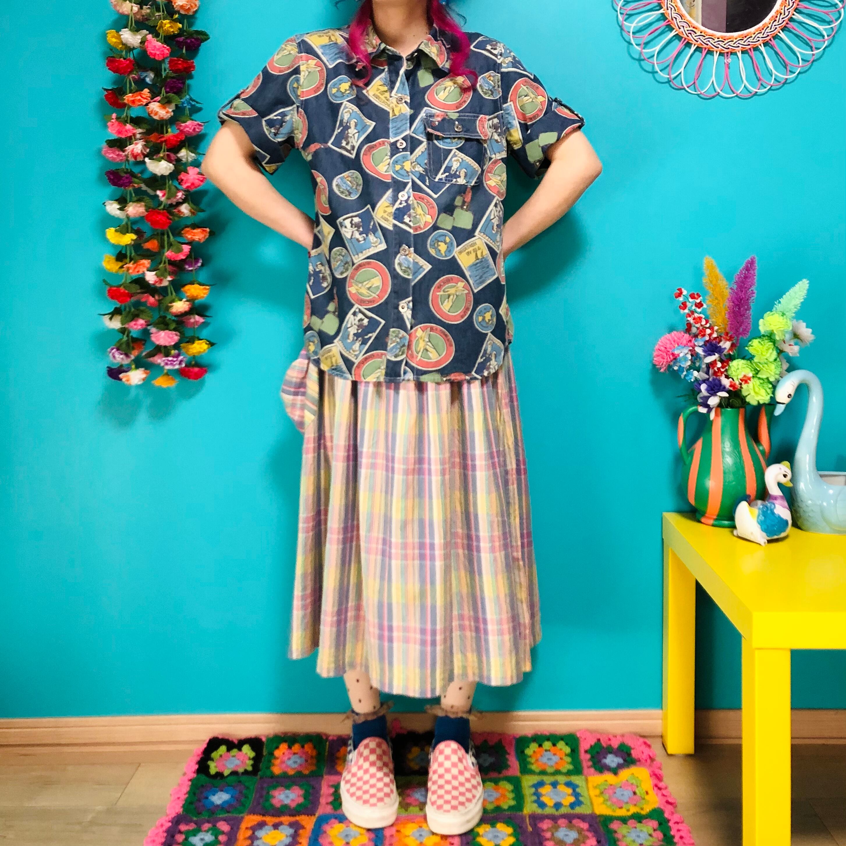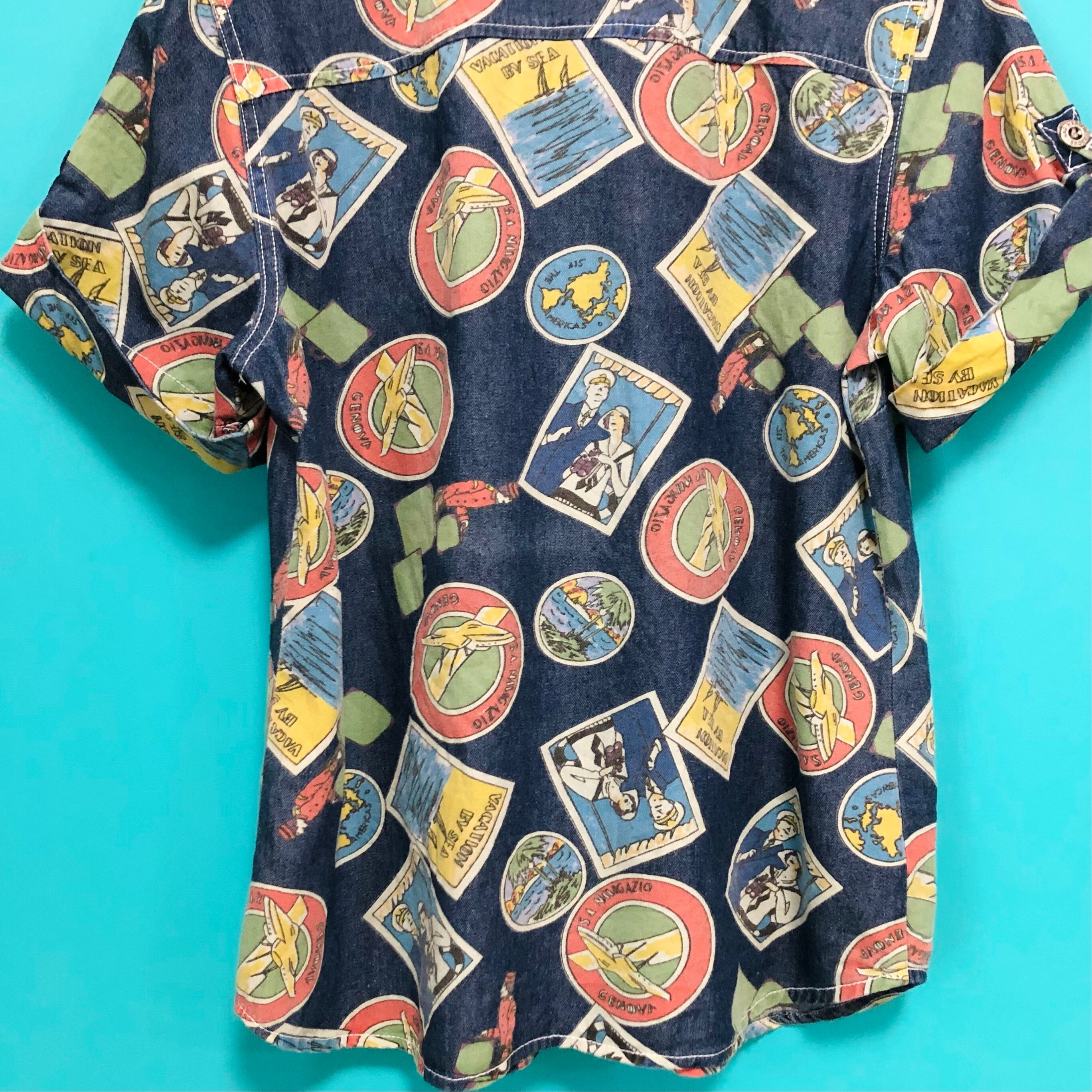 ロマンス溢れる旅の思い出が総柄でプリントされたデニムシャツです。