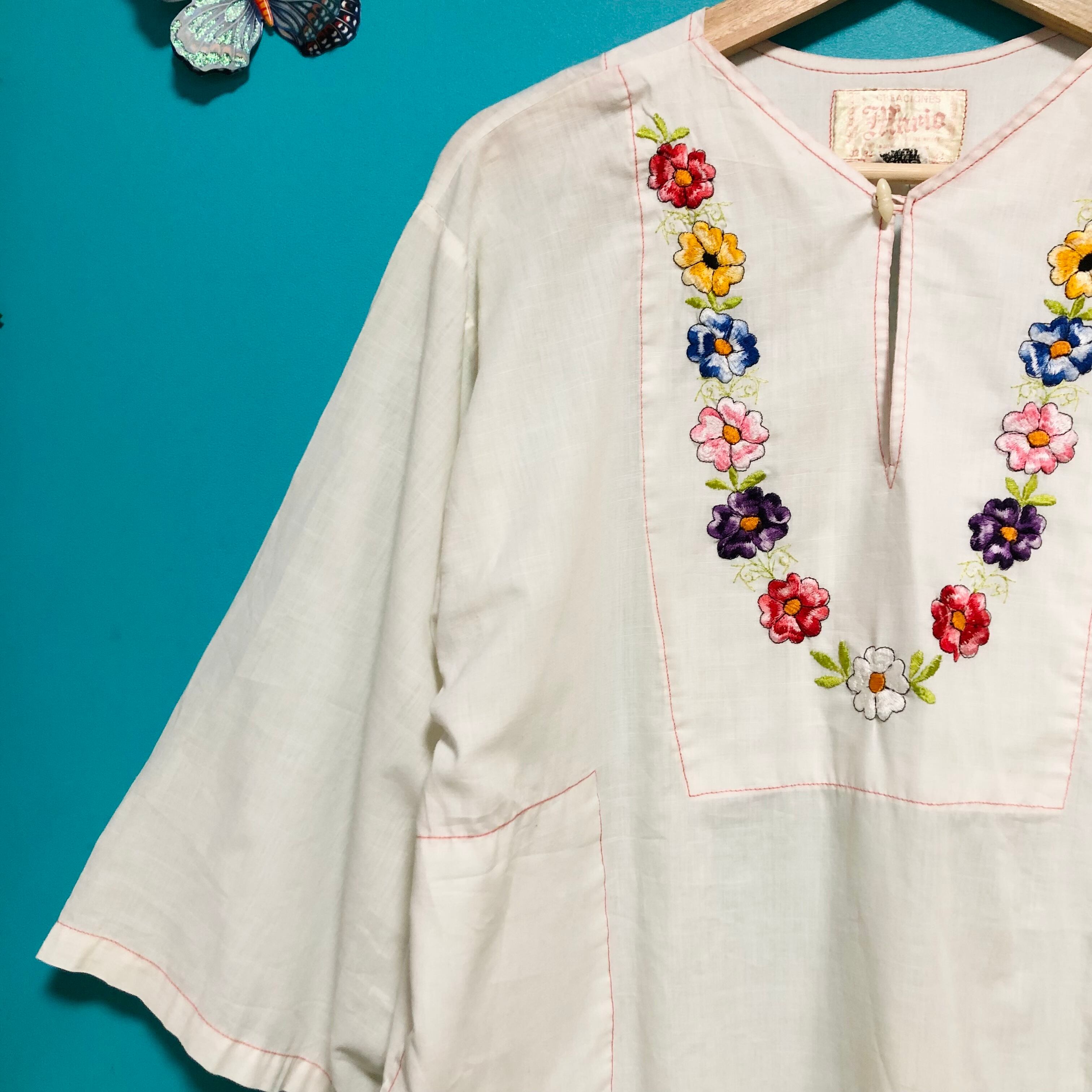 色鮮やかなお花のネックレスをしたような刺繍が施されています。
