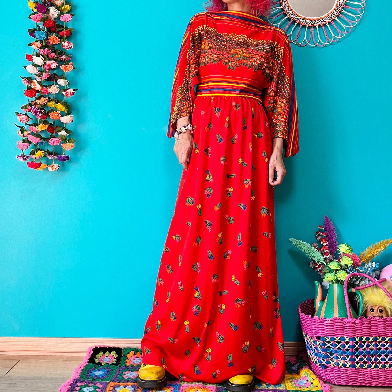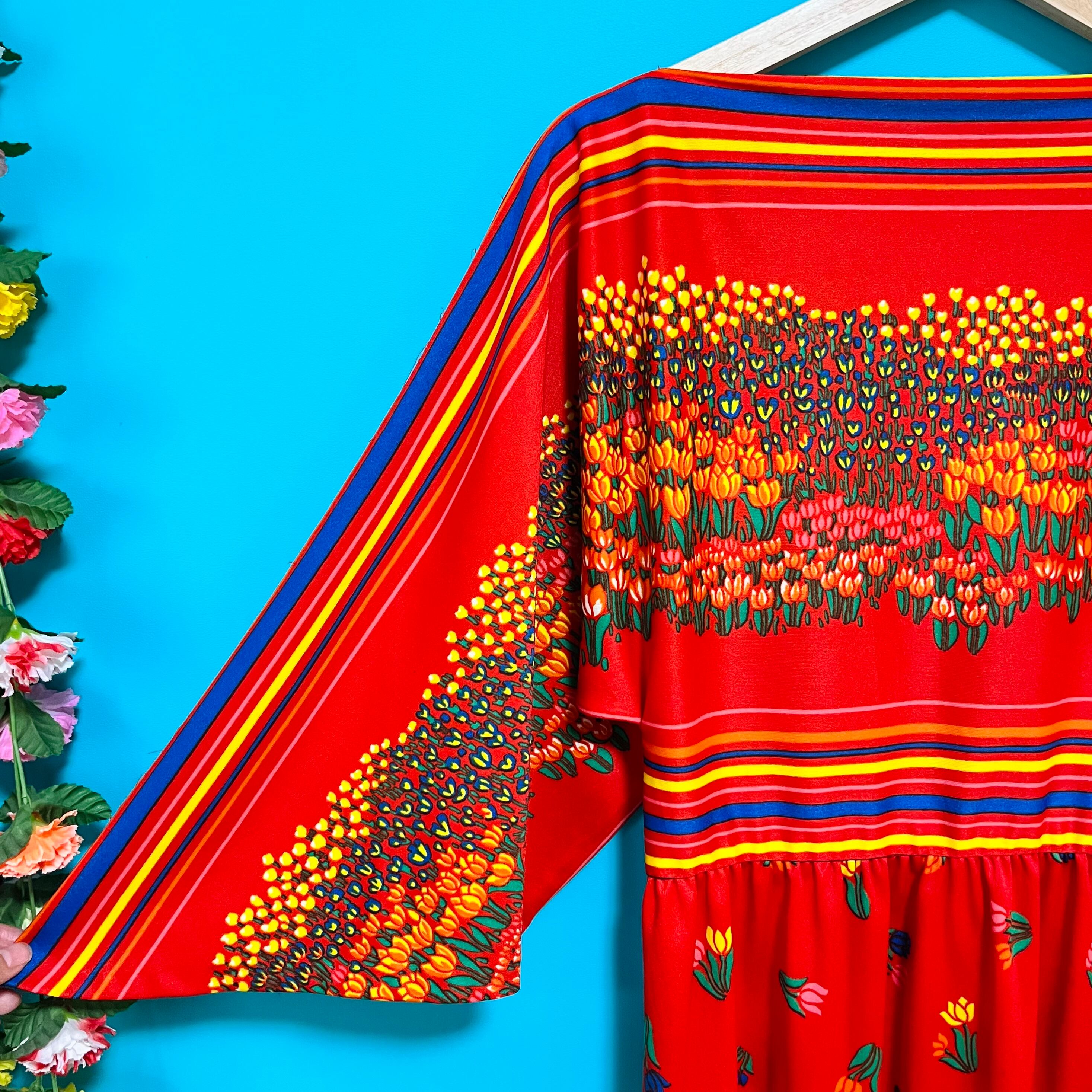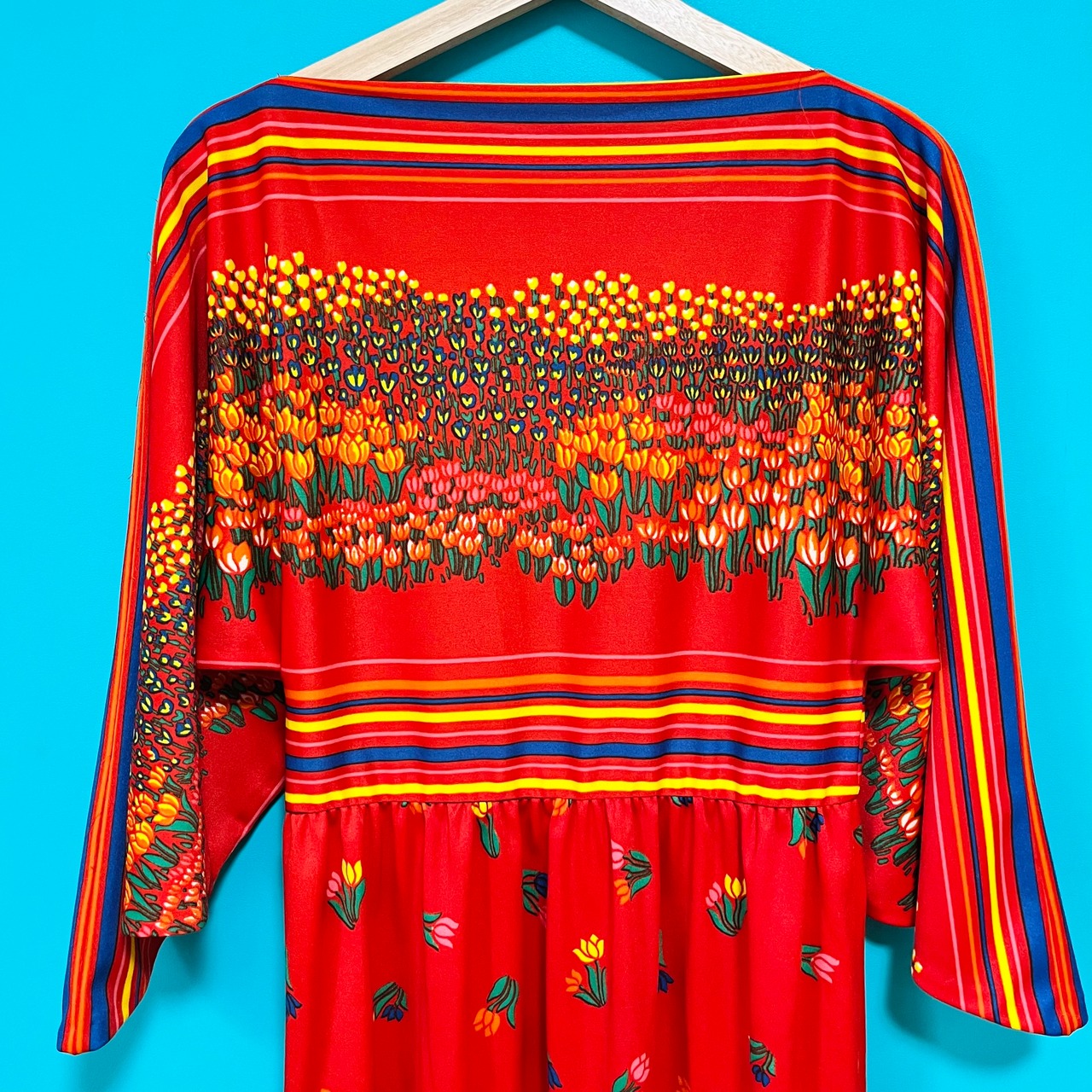 真っ赤なベースにカラフルなチューリップがたくさん咲いた70sレトロワンピースです。