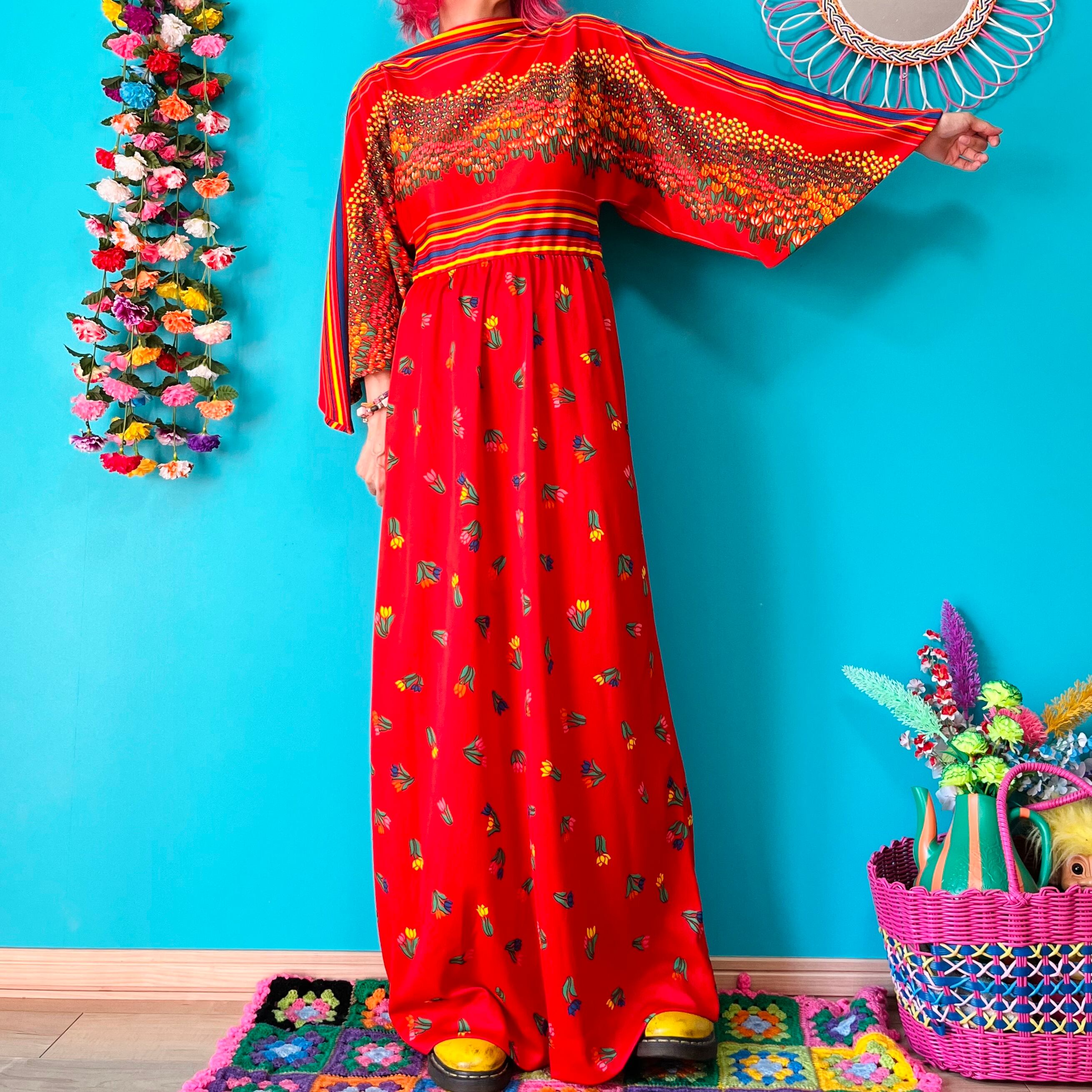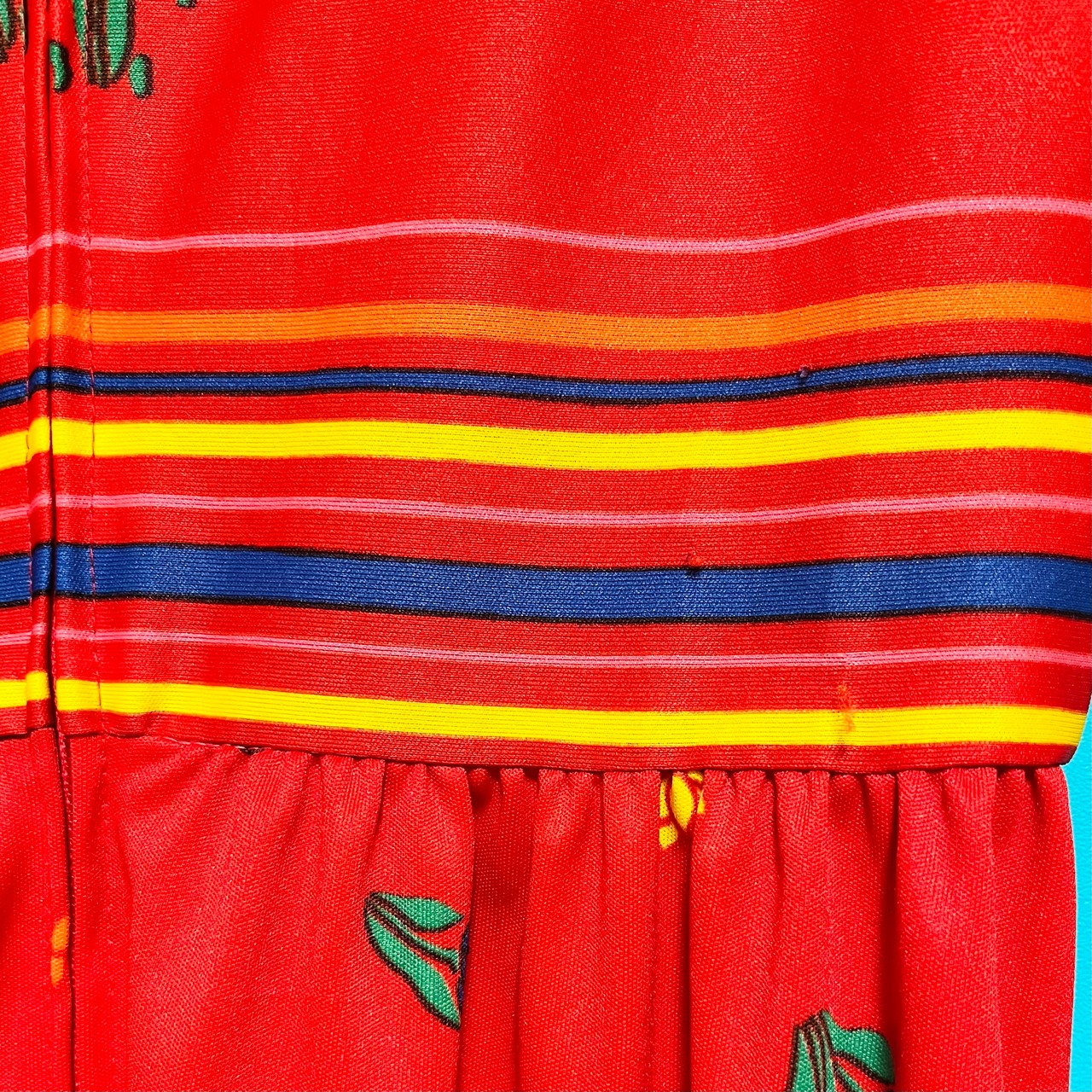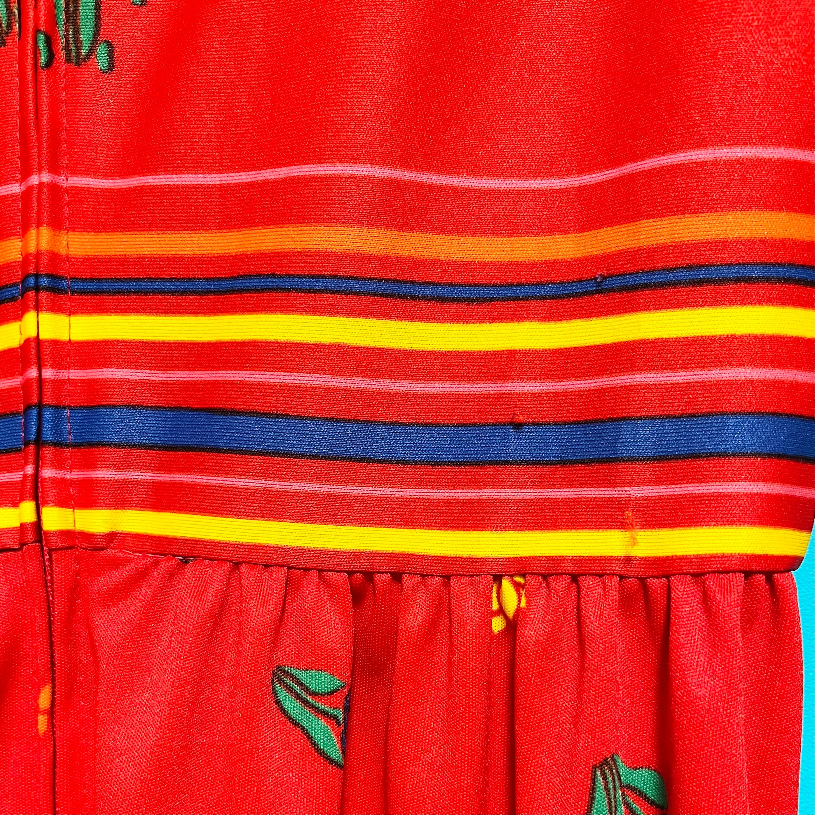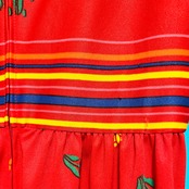 真っ赤なベースにカラフルなチューリップがたくさん咲いた70sレトロワンピースです。