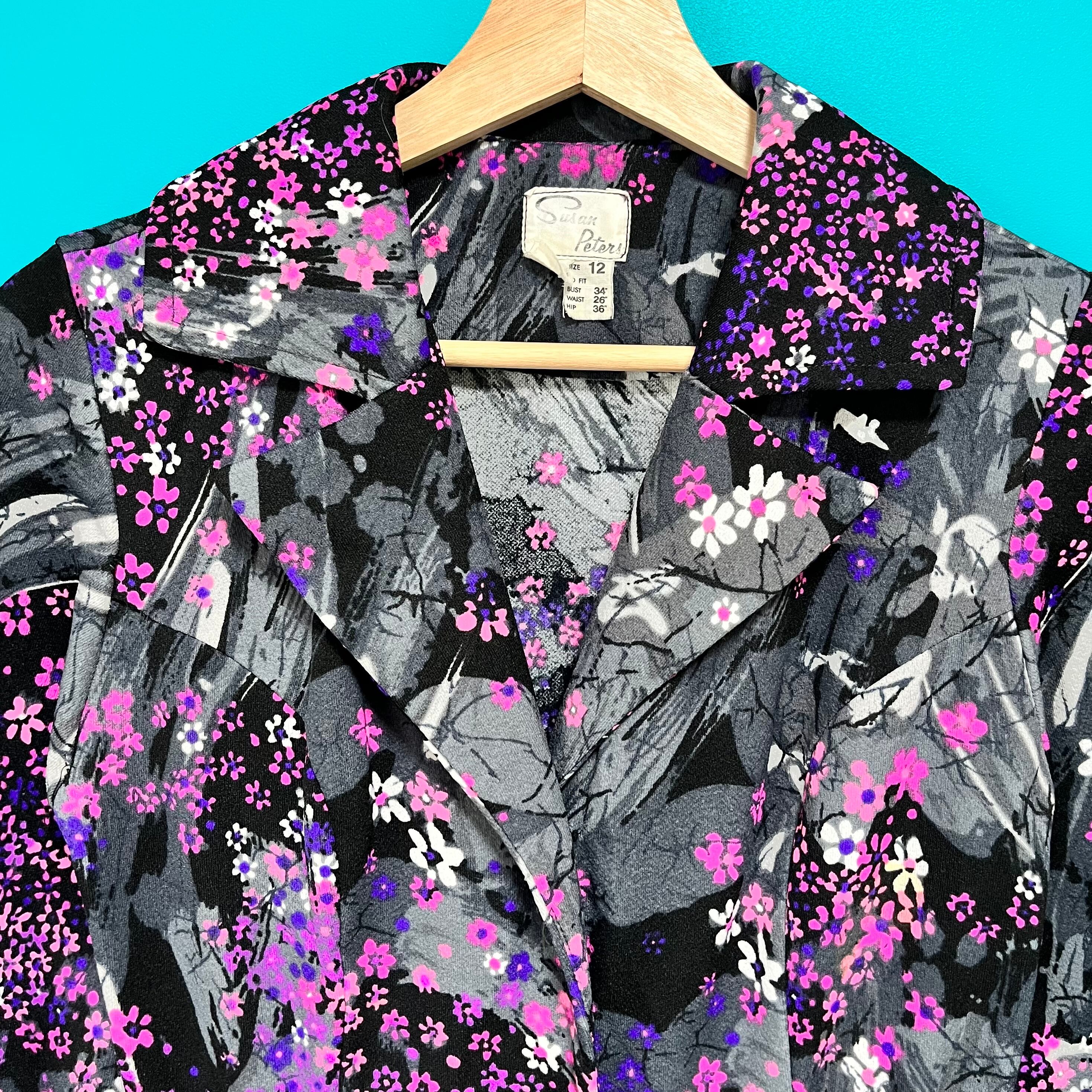 黒とグレーのマダラ模様の上にピンクのお花が咲いた珍しい柄の70sマキシワンピースです。