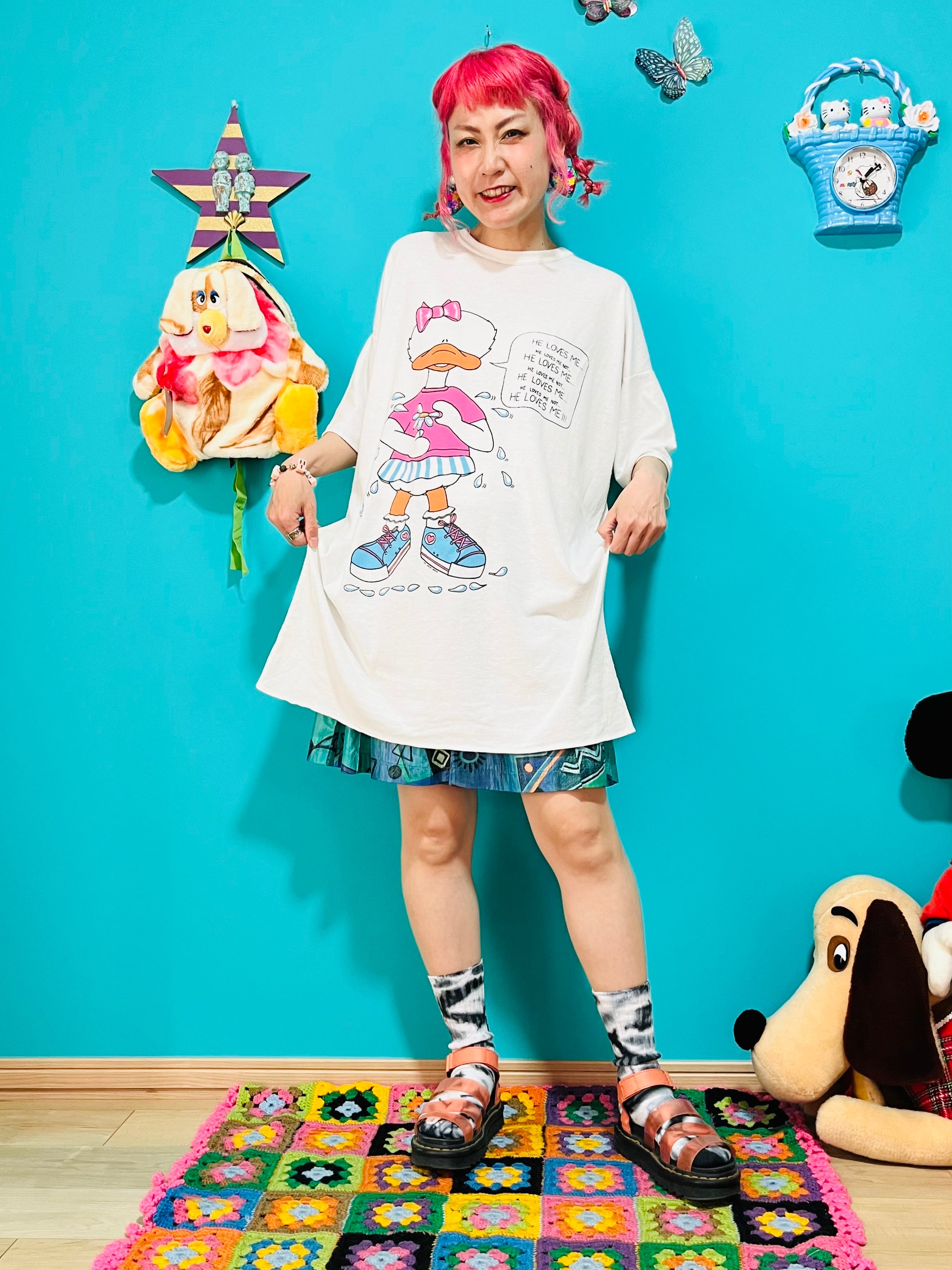 オシャレしたアヒルちゃんが花占いをしている胸キュン恋煩いTシャツです。
