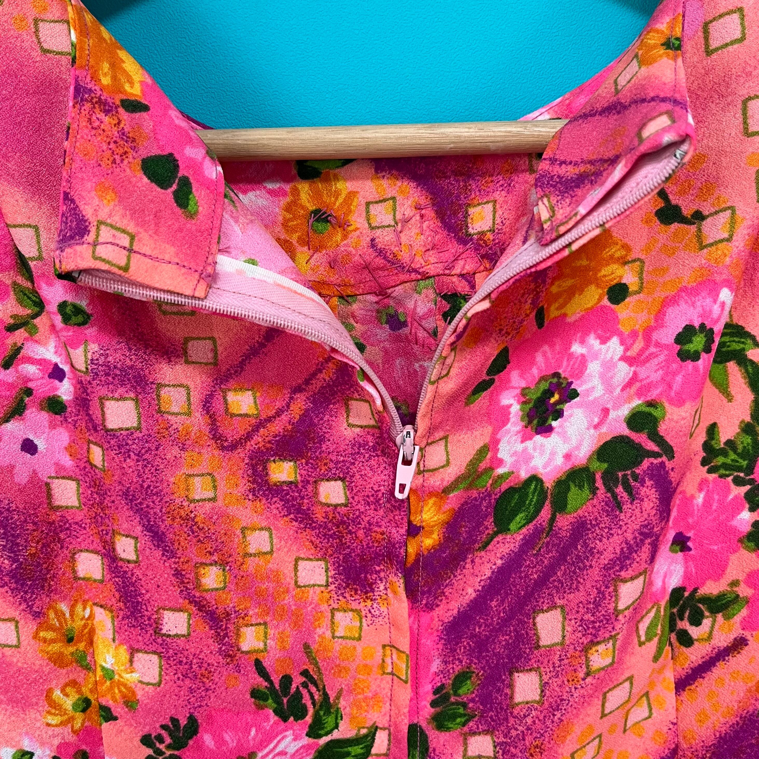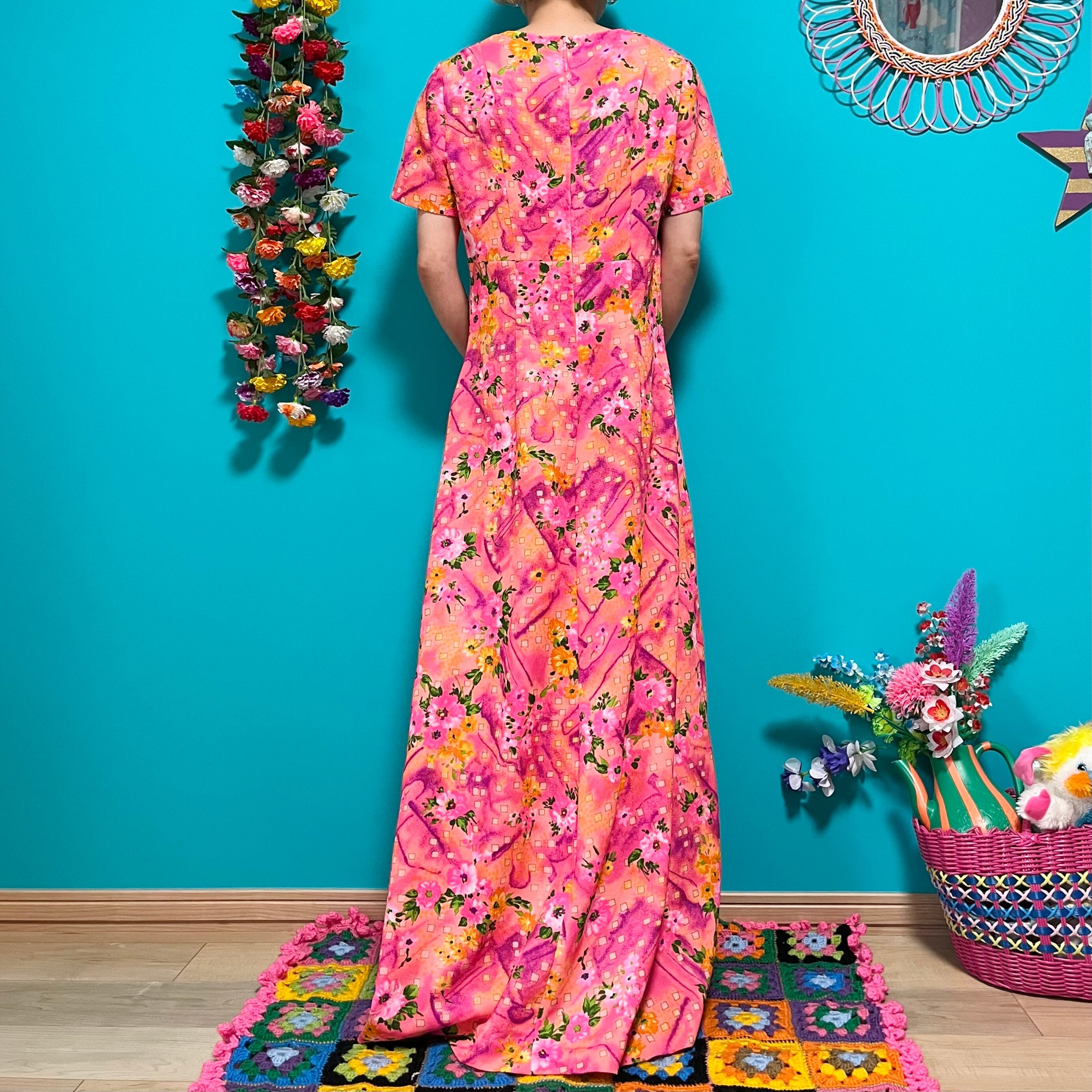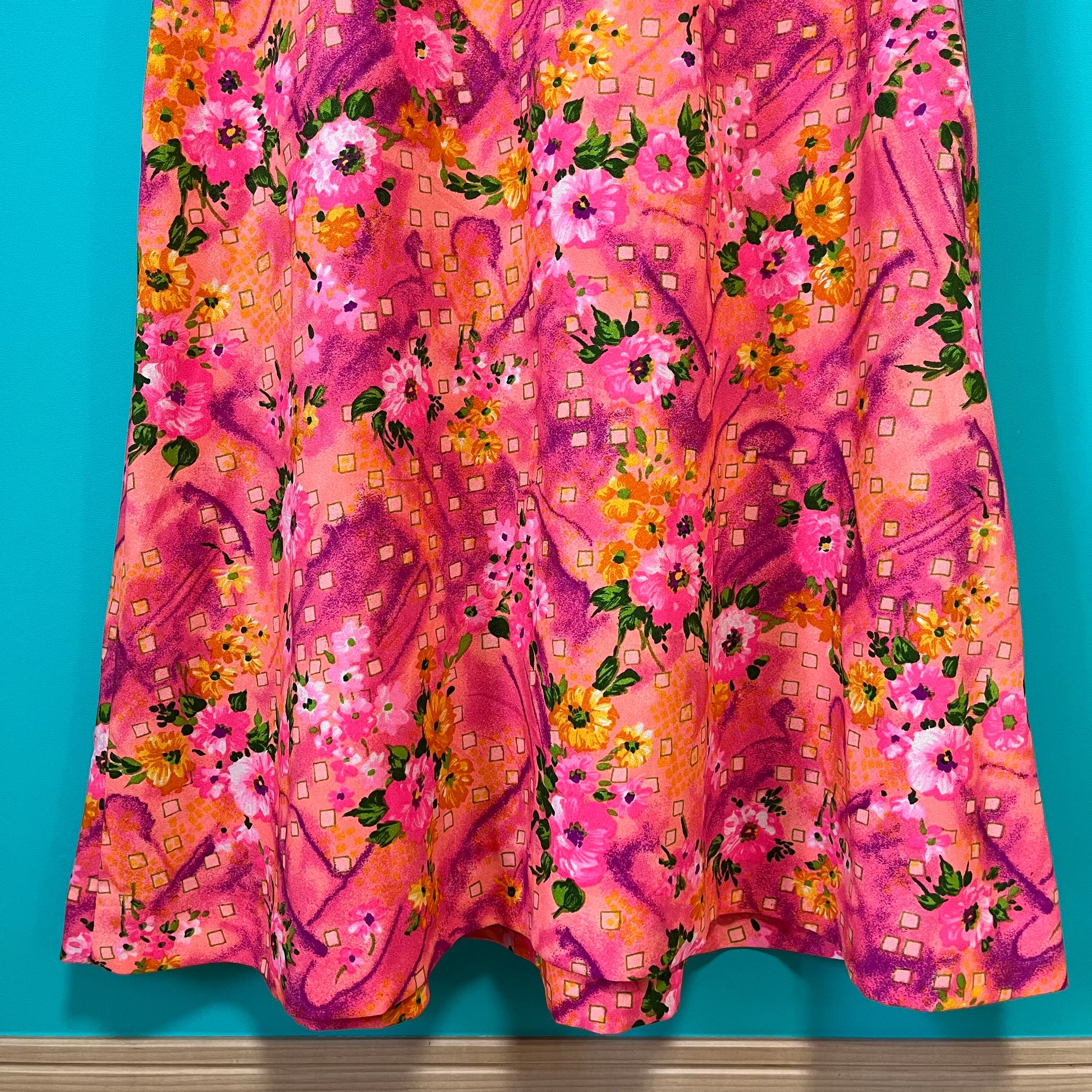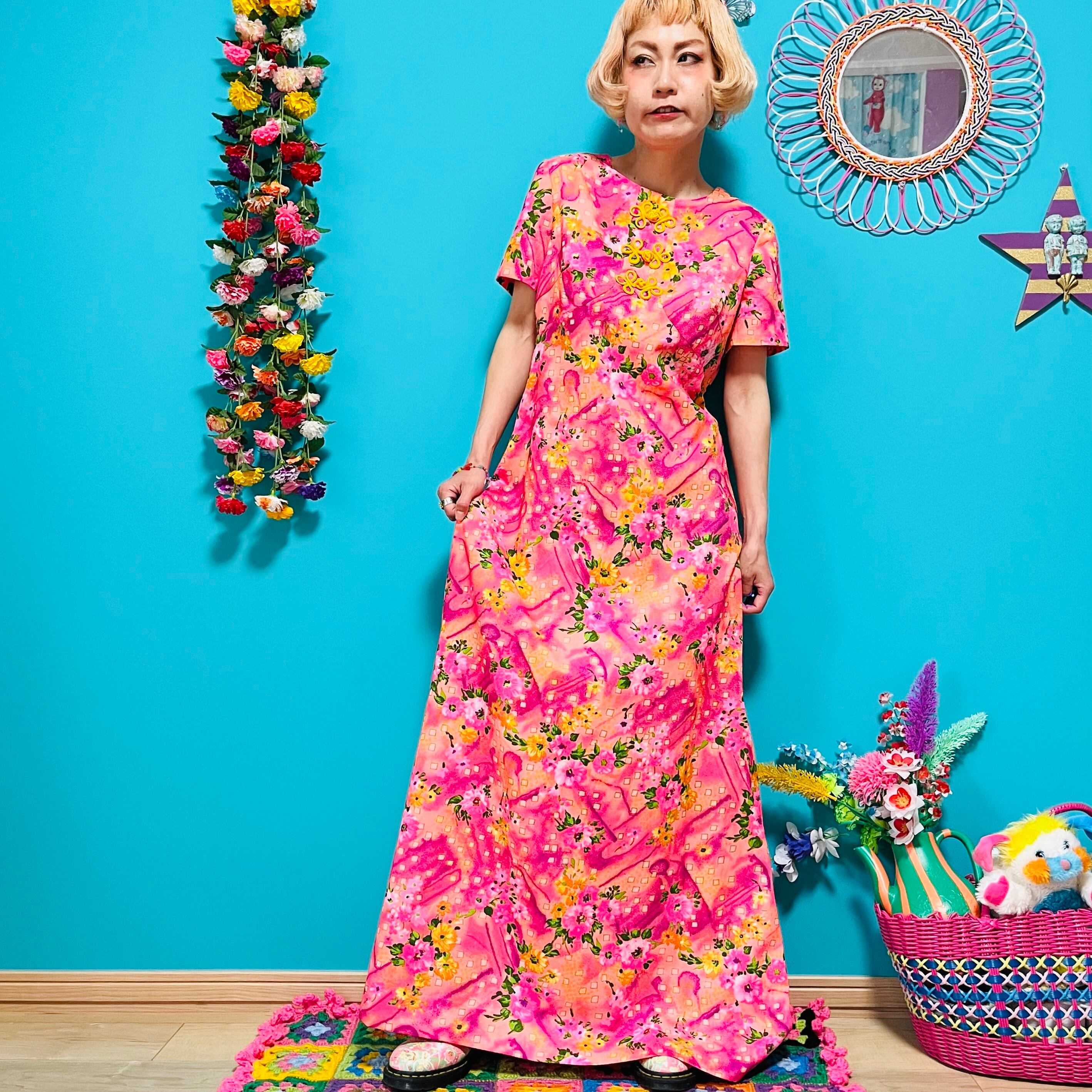 お花柄と幾何学模様が合わさったような、なんとも言えない雰囲気がたまらない鮮やかピンクのロングドレスです。