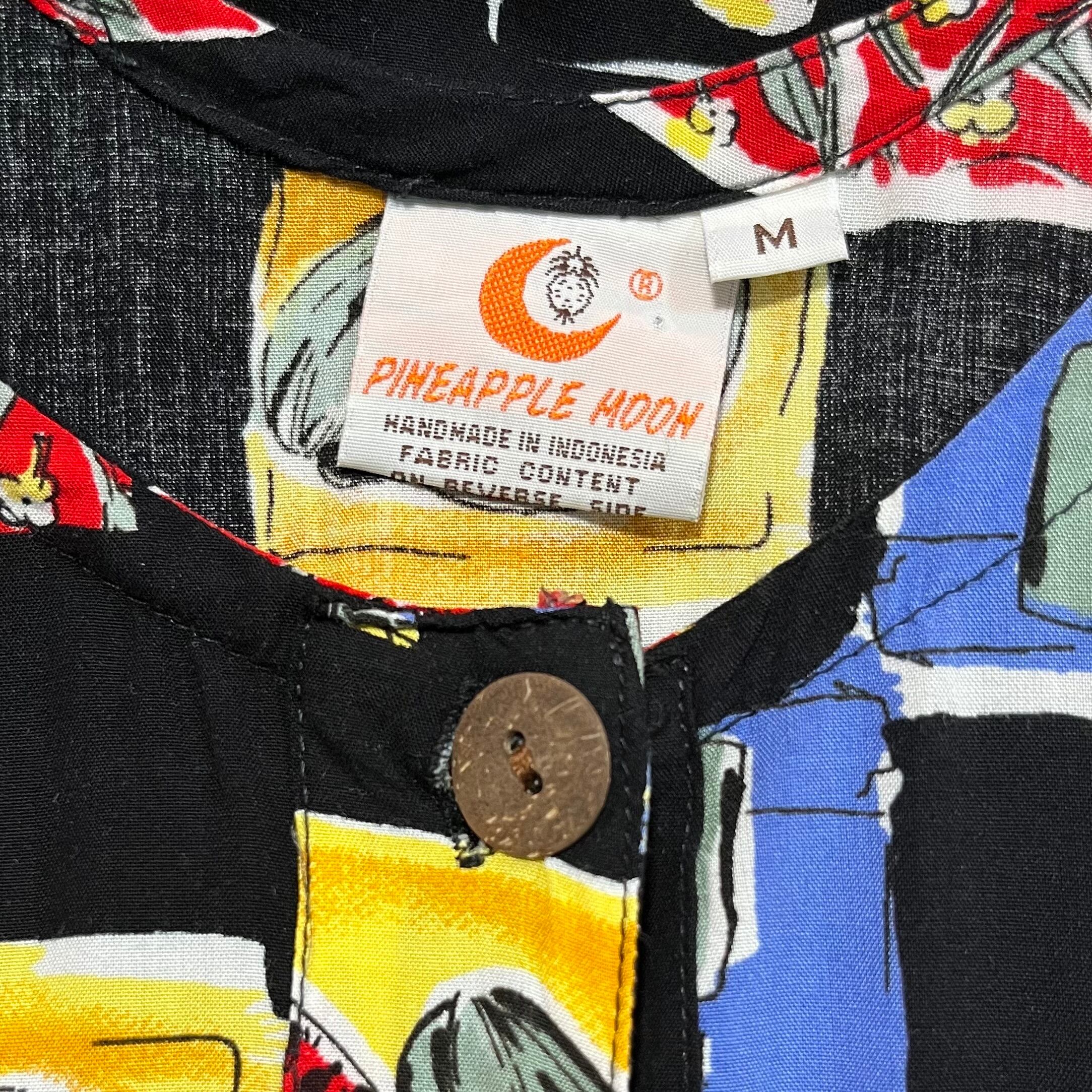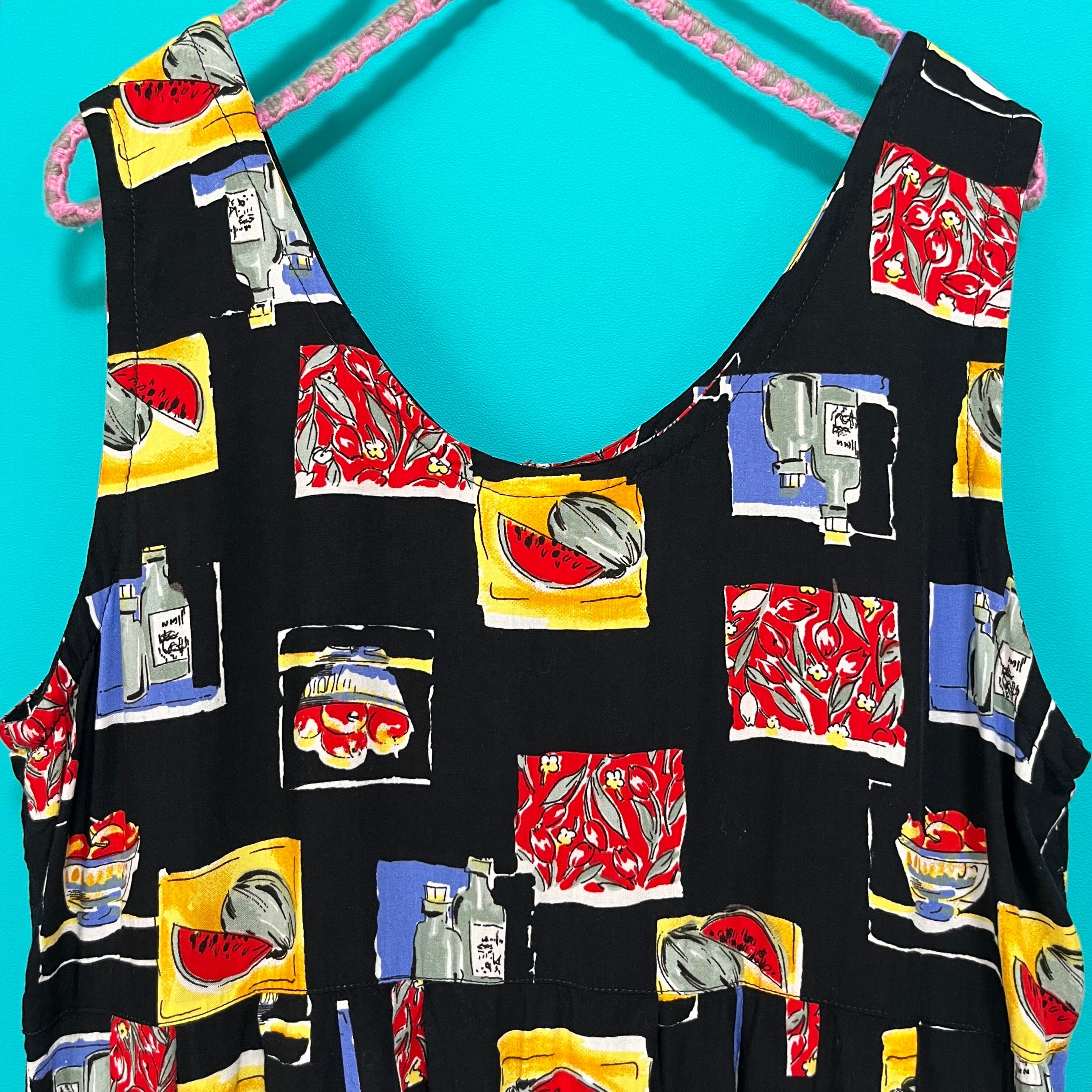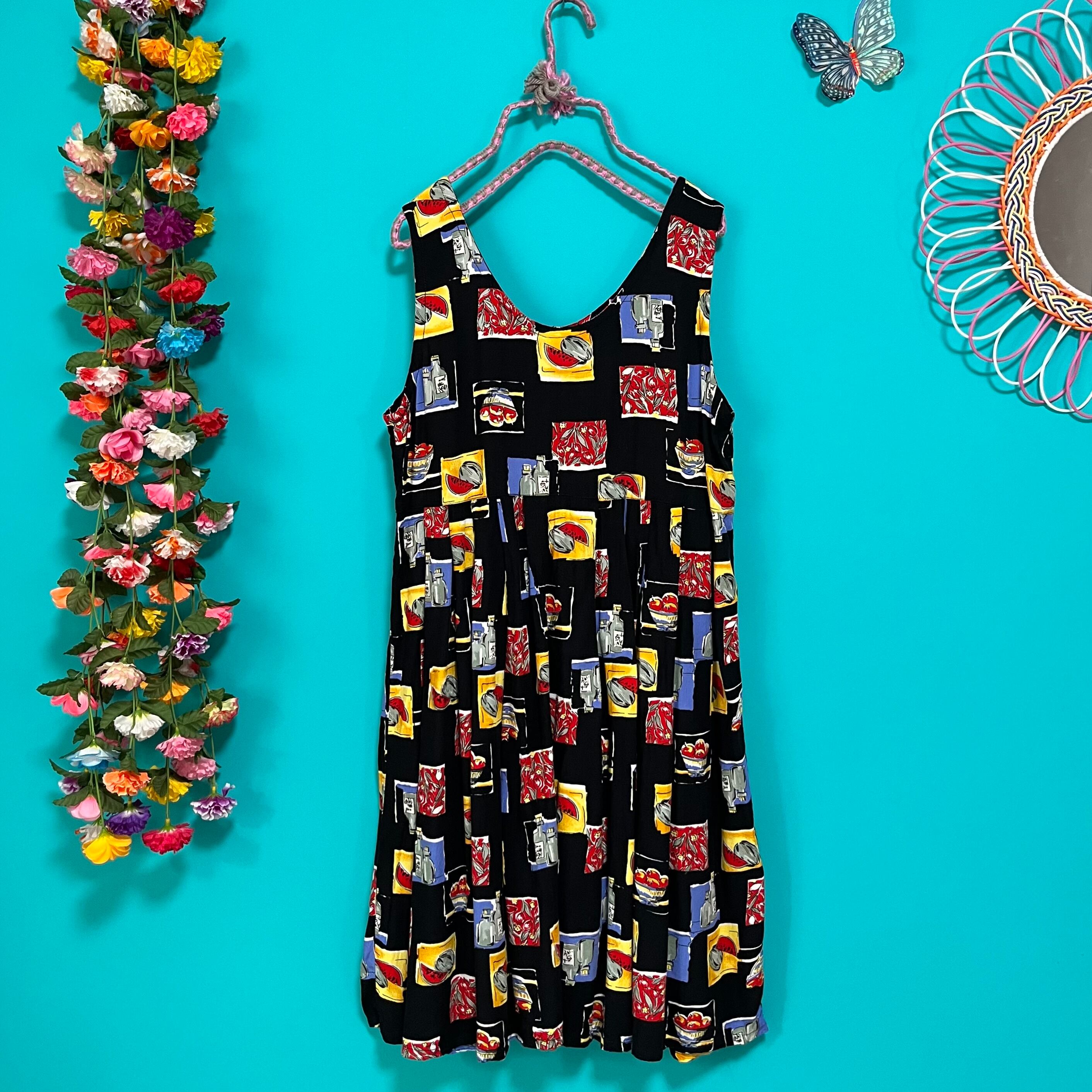 黒地にカラフルなレトロ柄がプリントされた夏にぴったりのワンピースです。