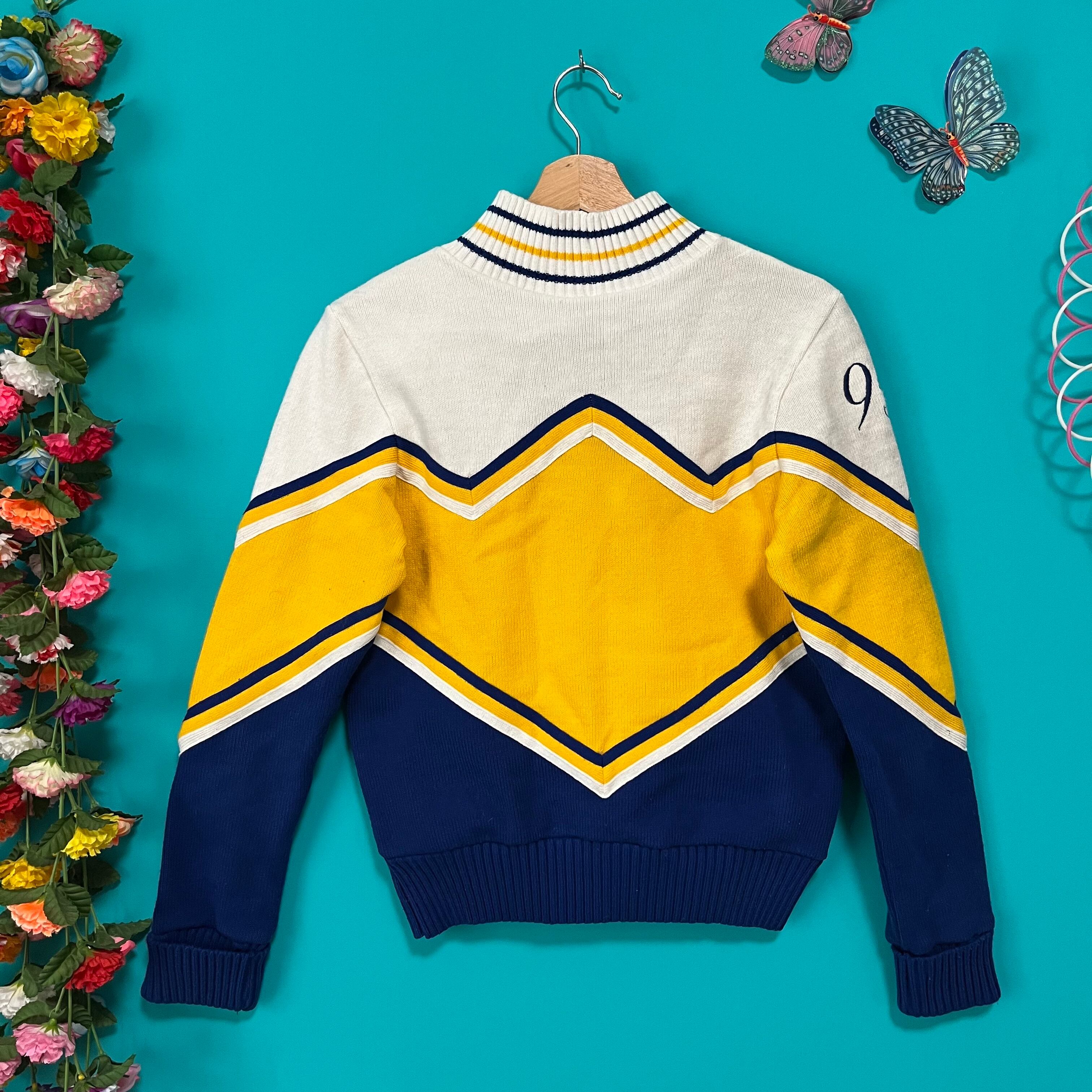 イエロー、ブルー、ホワイトのコントラストがとっても可愛いチアニットです。