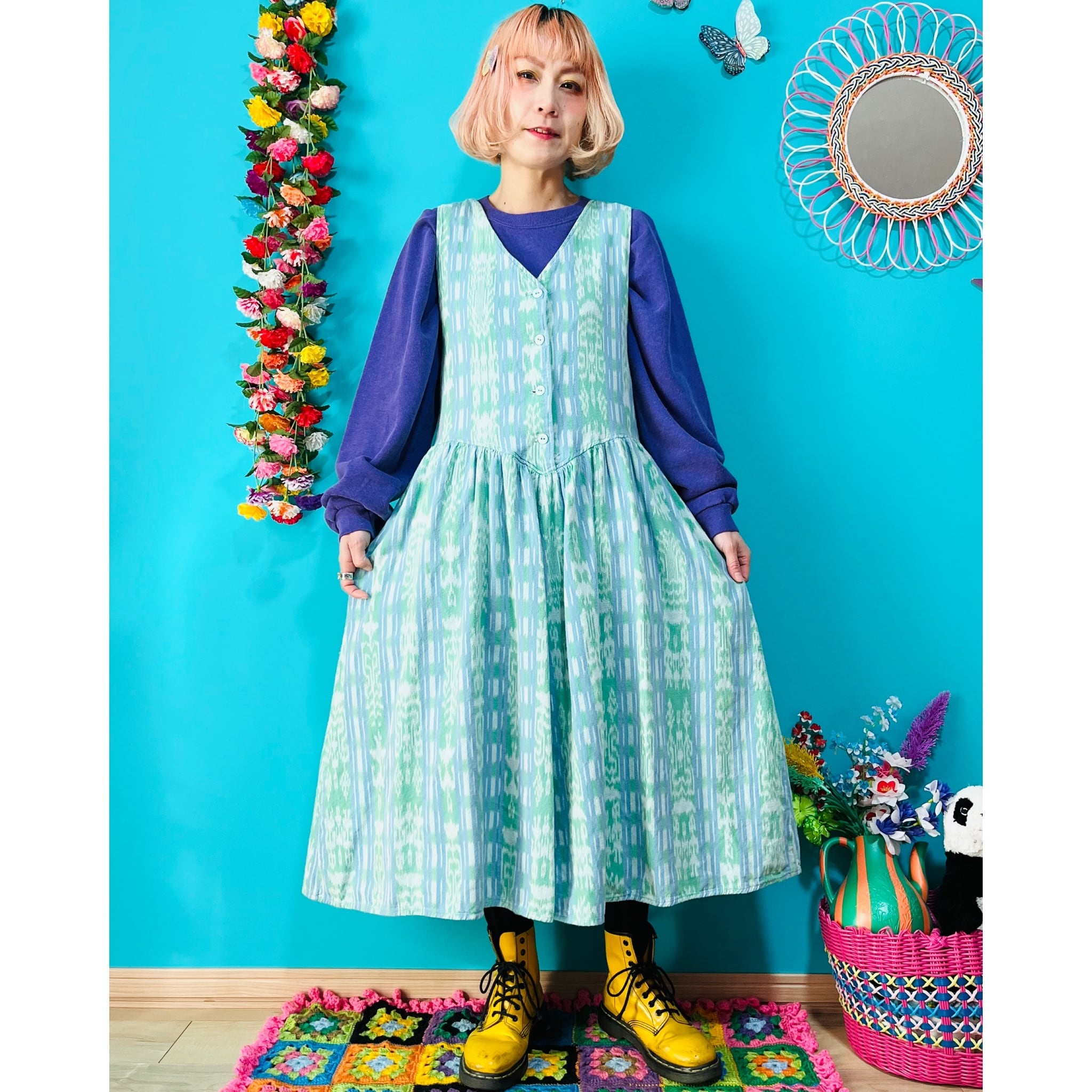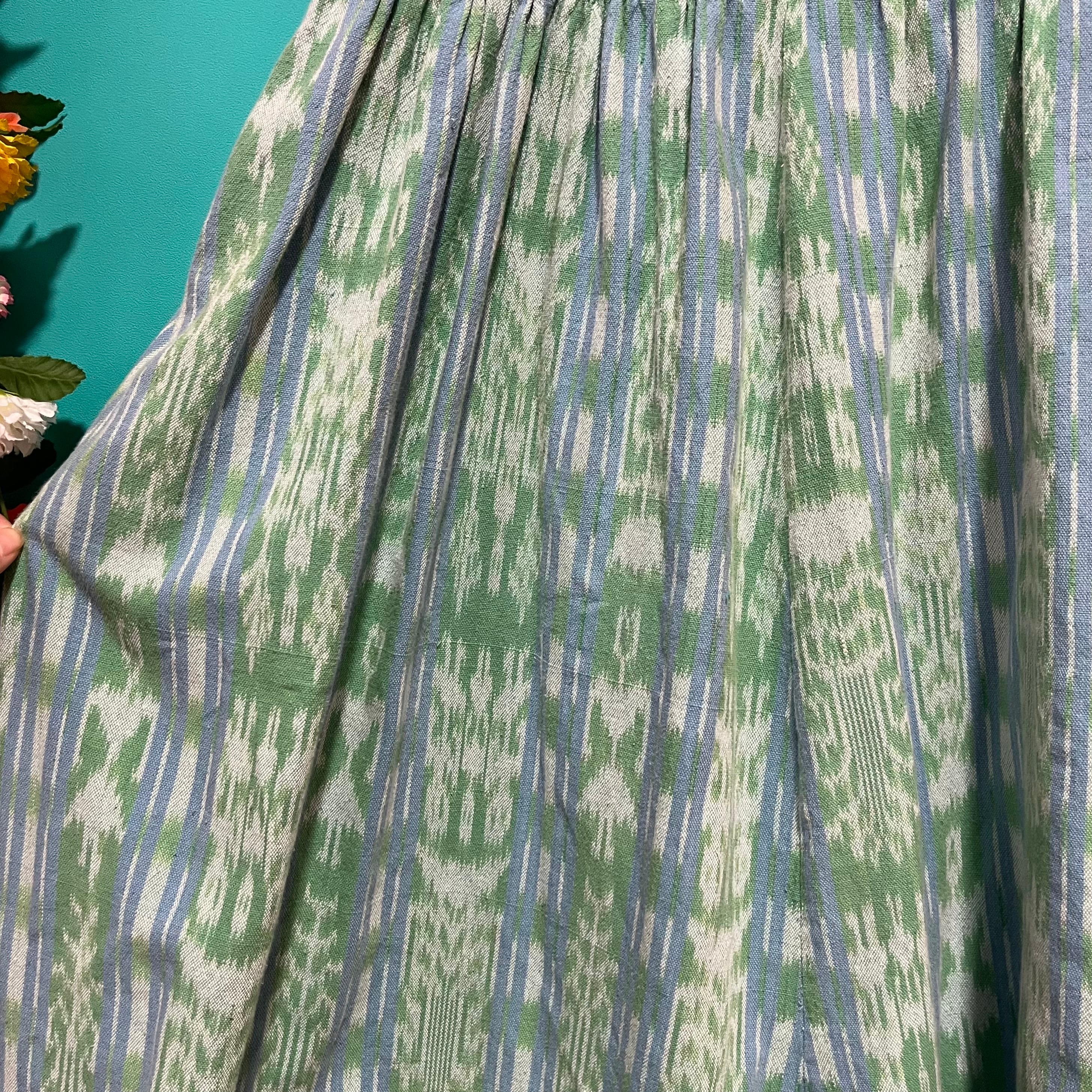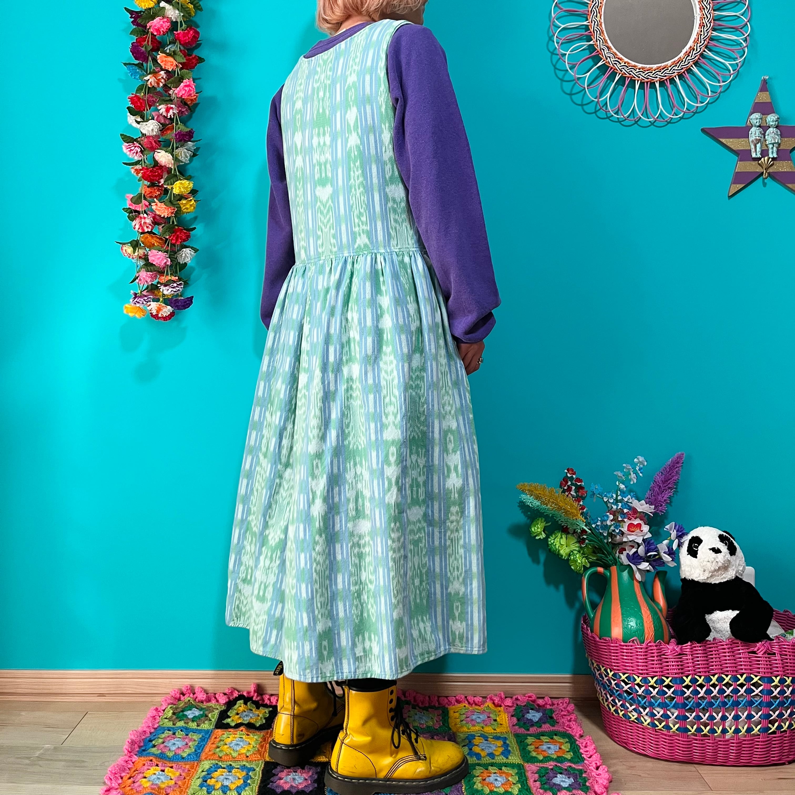 グリーンのマダラ模様に水色のラインが入ったワンピースです。